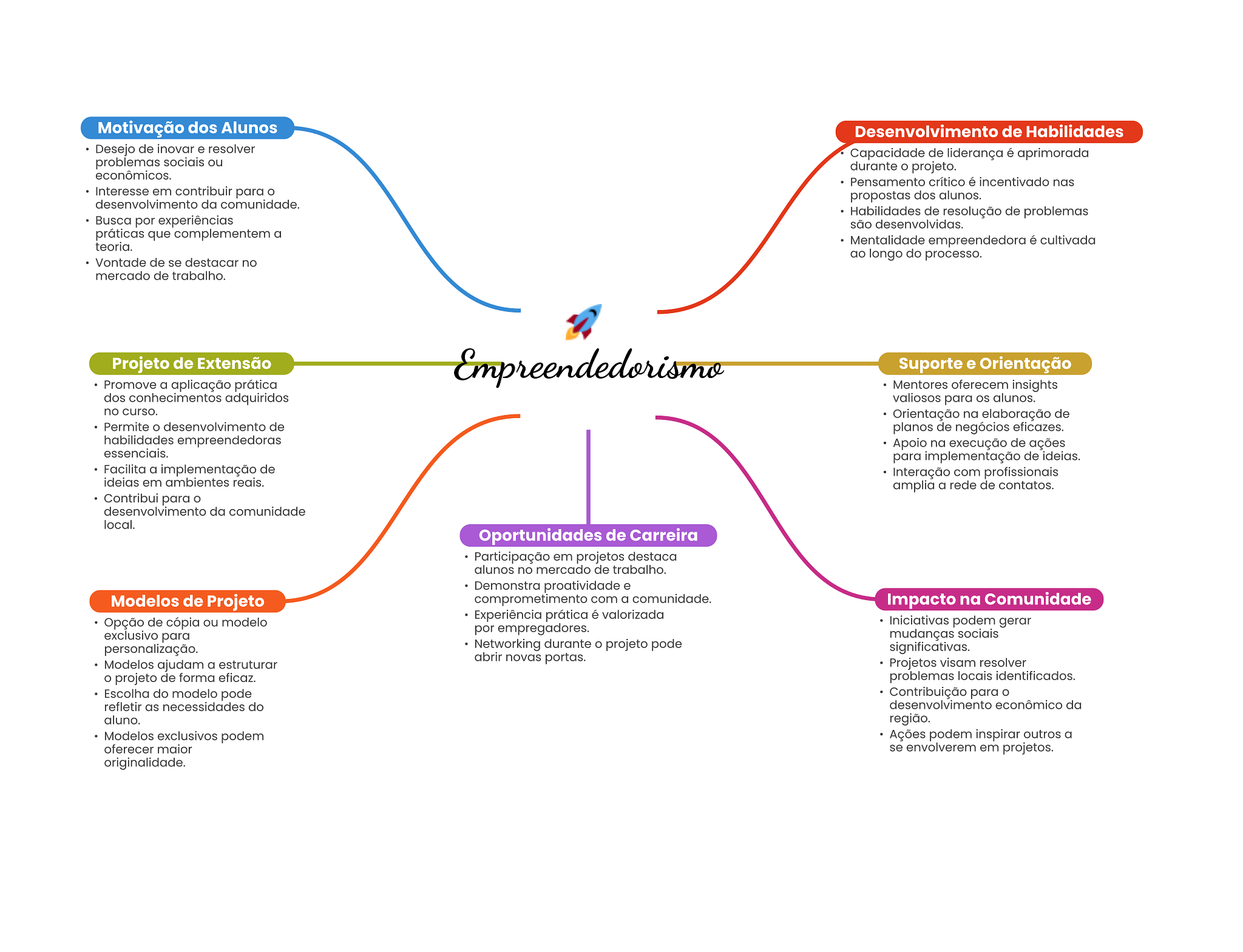 Motivação dos Alunos Desenvolvimento de Habilidades Desejo de inovar e resolver Capacidade de liderança é aprimorada problemas sociais ou durante projeto. econômicos. Pensamento crítico é incentivado nas Interesse em contribuir para propostas dos alunos. desenvolvimento da comunidade. Habilidades de resolução de problemas Busca por experiências são desenvolvidas. práticas que complementem a teoria. Mentalidade empreendedora é cultivada ao longo do processo. Vontade de se destacar no mercado de trabalho. Projeto de Extensão Empreendedorismo Suporte e Orientação Promove a aplicação prática Mentores oferecem insights dos conhecimentos adquiridos valiosos para alunos. no curso. Orientação na elaboração de Permite O desenvolvimento de planos de negócios eficazes. habilidades empreendedoras Apoio na execução de ações essenciais. para implementação de ideias. Facilita a implementação de Interação com profissionais ideias em ambientes reais. amplia a rede de contatos. Contribui para da comunidade local. Oportunidades de Carreira Participação em projetos destaca alunos no mercado de trabalho. Demonstra proatividade e Modelos de Projeto comprometimento com a comunidade. Impacto na Comunidade Experiência prática é valorizada Opção de cópia ou modelo Iniciativas podem gerar por empregadores. exclusivo para mudanças sociais personalização. Networking durante projeto pode significativas. abrir novas portas. Modelos ajudam a estruturar Projetos visam resolver projeto de forma eficaz. problemas locais identificados. Escolha do modelo pode Contribuição para refletir as necessidades do desenvolvimento econômico da aluno. região. Modelos exclusivos podem Ações podem inspirar outros a oferecer maior se envolverem em projetos. originalidade.