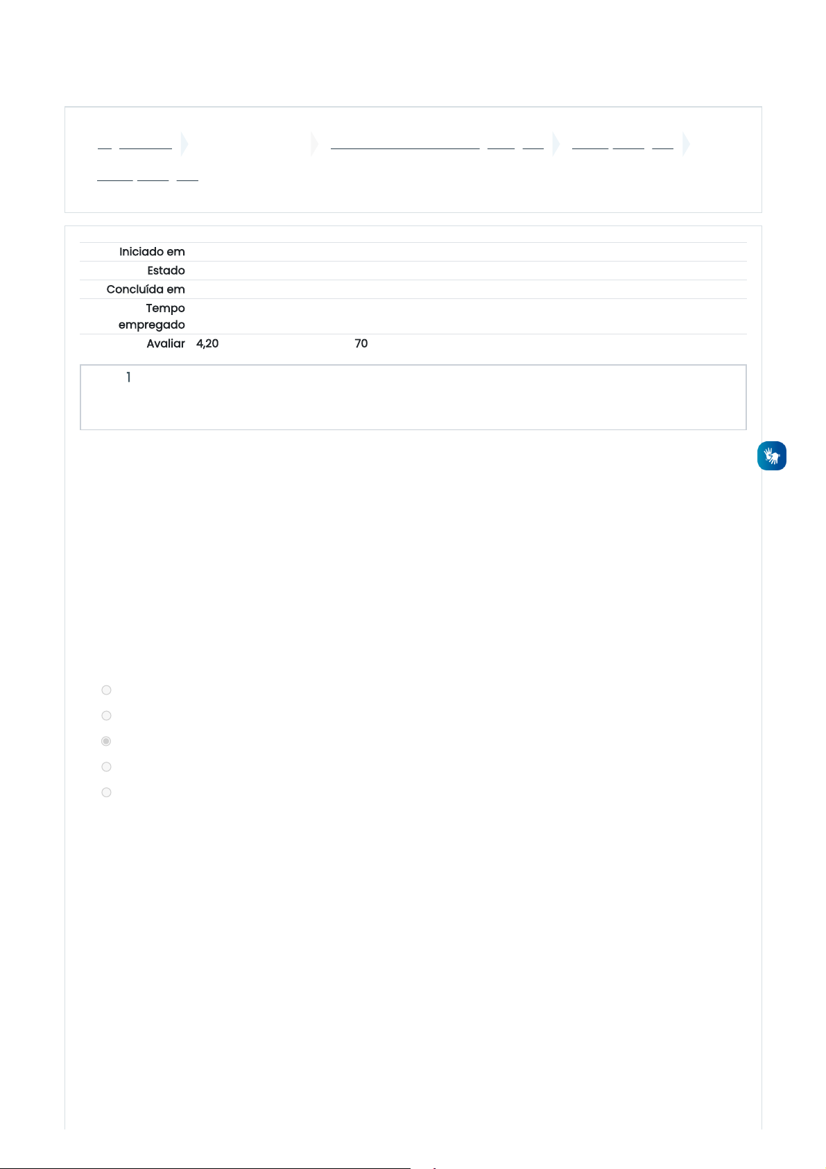 17/11/2021 21:21 Avaliação Regular: Revisão da tentativa https://ambienteonline.uninga.br/mod/quiz/review.php?attempt=803544&cmid=184967 1/7 Página inicial Minhas disciplinas 2021/3 - Anatomia e Fisiologia Vegetal Avaliação Regular Avaliação Regular Iniciado em quarta, 20 out 2021, 21:05 Estado Finalizada Concluída em quarta, 20 out 2021, 21:51 Tempo empregado 45 minutos 54 segundos Avaliar 4,20 de um máximo de 6,00(70%) Questão 1 Correto Atingiu 0,60 de 0,60 O retículo endoplasmático e o aparelho de Golgi são organelas compostas por sistemas de endomembranas, interligados por vesículas capazes de transportar substâncias no ambiente intracelular ou exportá-las para fora da célula. Sobre essas organelas, analise as afirmações a seguir e assinale a alternativa correta: I – Dentre as diversas funções do aparelho de Golgi, está o processamento de proteínas produzidas no retículo endoplasmático e exportadas em vesículas. II – O retículo endoplasmático possui porções onde há ribossomos aderidos, e portanto, está relacionado com a síntese de lipídios. III – A porção do retículo endoplasmático onde não há ribossomos aderidos está relacionada com a síntese de proteínas. IV – O aparelho de Golgi nas células vegetais consiste em numerosos empilhamentos de sacos achatados, com formato de cisterna ou disco, dispersos no citoplasma. a. I e II. b. III e IV. c. I e IV. d. I e III. e. II, III e IV. A resposta correta é: I e IV. https://ambienteonline.uninga.br/ https://ambienteonline.uninga.br/course/view.php?id=7729 https://ambienteonline.uninga.br/course/view.php?id=7729§ion=10 https://ambienteonline.uninga.br/mod/quiz/view.php?id=184967 17/11/2021 21:21 Avaliação Regular: Revisão da tentativa https://ambienteonline.uninga.br/mod/quiz/review.php?attempt=803544&cmid=184967 2/7 Questão 2 Correto Atingiu 0,60 de 0,60 Questão 3 Incorreto Atingiu 0,00 de 0,60 Sobre os componentes celulares e suas funções, julgue as afirmativas baixo como V (verdadeira) ou F (falsa) e assinale a alternativa correta. ( ) Os ribossomos são pequenas partículas responsáveis pela síntese de proteínas. ( ) A membrana plasmática da célula vegetal é composta principalmente por polímeros de celulose. ( ) Os cloroplastos são plastídios que contém os pigmentos clorofila e carotenoides. ( ) Os vacúolos são organelas membranosas com várias funções nas células, como a fotorrespiração. ( ) As mitocôndrias são organelas circundadas por membrana única, e estão envolvidas na respiração celular. a. I- V; II- F; III- F; IV- F; V- V. b. I- V; II- V; III- V; IV- V; V-F. c. I- V; II- F; III- V; IV- F; V- F. d. I- F; II- F; III- V; IV- F; V- F. e. I- F; II- V; III- V; IV- F; V- F. A resposta correta é: I- V; II- F; III- V; IV- F; V- F. Os vegetais apresentam diferentes tipos de tecidos, sendo que as funções desses tecidos estão envolvidas com a conquista do ambiente terrestre pelas plantas. Sobre esse tema, analise as afirmativas a seguir: I - O xilema, formado por células vivas na maturidade, é o tecido de condução de água e minerais das raízes para as folhas. II - O parênquima é um tecido responsável por várias funções na planta, como armazenamento de substâncias de reserva e assimilação (fotossíntese). III - A cutícula é composta basicamente de cutina e cera, e é responsável por aumentar a permeabilidade das partes aéreas das plantas. IV - Raízes e caules jovens possuem a epiderme como tecido de proteção e revestimento; quando apresentam crescimento secundário, a epiderme é substituída pela periderme. V - O esclerênquima, composto por fibras e esclereídes, é um dos tecidos de sustentação das plantas. Está correto o que se afirma em: a. III, IV e V. b. I, II e V. c. II, IV e V. d. I, II e III. e. II, III e IV. A resposta correta é: II, IV e V. 17/11/2021 21:21 Avaliação Regular: Revisão da tentativa https://ambienteonline.uninga.br/mod/quiz/review.php?attempt=803544&cmid=184967 3/7 Questão 4 Correto Atingiu 0,60 de 0,60 Questão 5 Incorreto Atingiu 0,00 de 0,60 Células com paredes primárias irregularmente espessadas, sem lignina e ricas em pectina; macias e flexíveis, com aspecto brilhante no tecido fresco. Células vivas na maturidade, especialmente adaptadas para sustentar órgãos jovens em crescimento. Essa descrição se refere a qual tecido vegetal? a. Colênquima. b. Epiderme. c. Xilema. d. Esclerênquima. e. Parênquima. A resposta correta é: Colênquima. Sobre os caules (ou sistemas caulinares), assinale a alternativa correta: a. A estrutura do caule é menos complexa em relação à raiz. b. Nos nós caulinares, feixe (s) do cilindro vascular se curvam em direção às folhas. c. No caule das monocotiledôneas, o sistema vascular forma um cilindro contínuo. d. Assim como o ápice da raiz, o ápice do caule forma órgãos laterais (ramos). e. Diferentemente da raiz, o caule não apresenta um meristema apical. A resposta correta é: Nos nós caulinares, feixe (s) do cilindro vascular se curvam em direção às folhas. 17/11/2021 21:21 Avaliação Regular: Revisão da tentativa https://ambienteonline.uninga.br/mod/quiz/review.php?attempt=803544&cmid=184967 4/7 Questão 6 Correto Atingiu 0,60 de 0,60 Questão 7 Correto Atingiu 0,60 de 0,60 O desenvolvimento de um organismo corresponde a soma de todos os eventos que, gradualmente, formam o seu corpo, e engloba três processos diferentes que se sobrepõem: o crescimento, a morfogênese e a diferenciação. Leia as definições a seguir, e em seguida assinale a alternativa que relaciona corretamente esses três processos com as suas descrições. I – Processo por meio da qual a planta adquire uma forma específica, durante o seu desenvolvimento. II – Processo por meio do qual as células com mesma constituição genética se especializam em diferentes tipos celulares. III - Processo que corresponde ao aumento irreversível de tamanho, causado pela combinaç