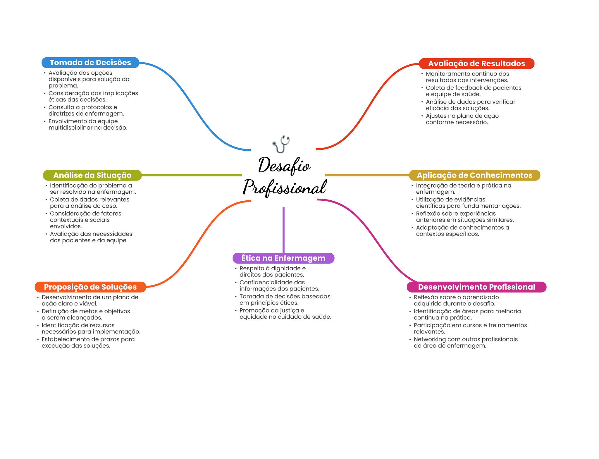 Tomada de Decisões Avaliação de Resultados Avaliação das opções Monitoramento dos disponíveis para solução do resultados das intervenções. problema. Coleta de feedback de pacientes Consideração das implicações e equipe de saúde. éticas das decisões. Análise de dados para verificar Consulta a protocolos e eficácia das soluções. diretrizes de enfermagem. Ajustes no plano de ação Envolvimento da equipe conforme necessário. multidisciplinar na decisão. Desafio Análise da Situação Aplicação de Conhecimentos Identificação do problema a Profissional Integração de teoria e prática na ser resolvido na enfermagem. enfermagem. Coleta de dados relevantes Utilização de evidências para a análise do caso. científicas para fundamentar ações. Consideração de fatores Reflexão sobre experiências contextuais e sociais anteriores em situações similares. envolvidos. Adaptação de conhecimentos a Avaliação das necessidades contextos específicos. dos pacientes e da equipe. Ética na Enfermagem Respeito à dignidade e direitos dos pacientes. Confidencialidade das Proposição de Soluções informações dos pacientes. Desenvolvimento Profissional Desenvolvimento de um plano de Tomada de decisões baseadas Reflexão sobre O aprendizado ação claro e viável. em princípios éticos. adquirido durante desafio. Definição de metas e objetivos Promoção da justiça e Identificação de áreas para melhoria a serem alcançados. equidade no cuidado de saúde. contínua na prática. Identificação de recursos Participação em cursos e treinamentos necessários para implementação. relevantes. Estabelecimento de prazos para Networking com outros profissionais execução das soluções. da área de enfermagem.