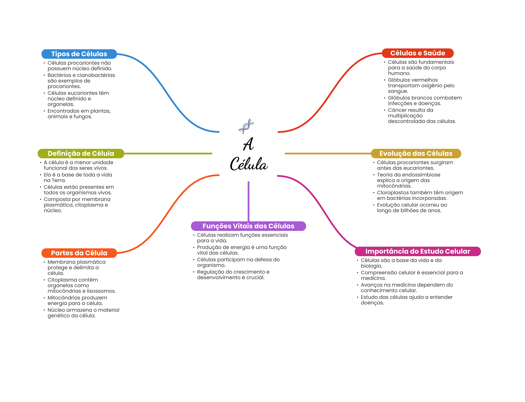 Tipos de Células Células e Saúde Células procariontes não Células são fundamentais possuem núcleo definido. para a saúde do corpo Bactérias e cianobactérias humano. são exemplos de Glóbulos vermelhos procariontes. transportam oxigênio pelo Células eucariontes têm sangue. núcleo definido e Glóbulos brancos combatem organelas. infecções e doenças. Encontradas em plantas, Câncer resulta da animais e fungos. multiplicação descontrolada das células. A Definição de Célula Evolução das Células A célula é a menor unidade Célula Células procariontes surgiram funcional dos seres vivos. antes das eucariontes. Ela é a base de toda a vida Teoria da endossimbiose na Terra. explica a origem das Células estão presentes em mitocôndrias. todos OS organismos vivos. Cloroplastos também têm origem Composta por membrana em bactérias incorporadas. plasmática, citoplasma e Evolução celular ocorreu ao núcleo. longo de bilhões de anos. Funções Vitais das Células Células realizam funções essenciais para a vida. Produção de energia é uma função Partes da Célula vital das células. Importância do Estudo Celular Membrana plasmática Células participam na defesa do Células são a base da vida e da protege e delimita a organismo. biologia. célula. Regulação do crescimento e Compreensão celular é essencial para a Citoplasma contém desenvolvimento é crucial. medicina. organelas como Avanços na medicina dependem do mitocôndrias e lisossomos. conhecimento celular. Mitocôndrias produzem Estudo das células ajuda a entender energia para a célula. doenças. Núcleo armazena material genético da célula.