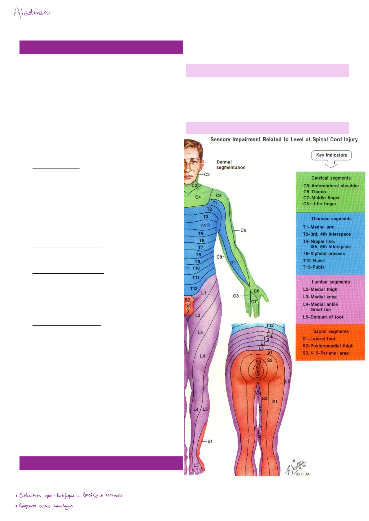 Exame da sensibilidade CONSIDERAÇÕES • O sistema sensorial é responsável por colocar o indivíduo em relação com o ambiente; ele capta estímulos físicos e os transforma em impulsos elétricos • Esses impulsos são levados até o sistema nervoso central por vias sensoriais e transmitidos a centros superiores para reconhecimento consciente, ação reflexa ou outras consequências da estimulação sensorial. • Classificação quanto à localização dos receptores – Déjerine: - Sensibilidade especial: Depende de órgãos e sistemas específicos. Receptores altamente diferenciados, representada pelos sentidos da visão, audição, olfação e gustação - Sensibilidade geral: Receptores estão esparsos, difundidos pelo corpo, com variações regionais de concentração. Disseminada por todas as partes do organismo. Sensibilidade à dor, à temperatura, trato superficial e profundo, cinético postural e vibratória. • Classificação quanto ao estímulo percebido – Sherrington: - É a mais empregada na prática - Divisão das sensações de acordo com a localização das terminações e tipos de estímulos que medeiam - Sensibilidade exteroceptiva: Estímulos somáticos externos ao organismo. Diz ao organismo o que está acontecendo no meio ambiente (dolorosa, térmica e tátil) - Sensibilidade proprioceptiva: Avaliação da posição do corpo no espaço e suas mudanças através dos movimentos. Fornece informações a respeito da tensão nos músculos e tendões, ou acerca da posição das articulações ou a respeito da força muscular (cinétco-postural, dolorosa profunda, vibratória/palestésica e tátil epicrítico) - Sensibilidade interoceptiva: (visceroposteriores) Estímulos originados dentro do organismo. Transmite eventos ocorridos no interior do organismo (visceral) • O exame da sensibilidade permite ao examinador, utilizando seus conhecimentos neuroanatômico e fisiológico, localizar a origem dos distúrbios sensitivos • Para a adequada realização não deve haver o menor grau de ansiedade ou pressa – do paciente ou examinador - É imprescindível que o paciente queira colaborar e entenda perfeitamente o que lhe é perguntado • O ambiente deve ser tranquilo, com temperatura agradável e o paciente deve estar tão despido quanto possível, confortavelmente deitado e com os olhos fechados • Avaliar comparativamente as áreas simétricas do corpo, além da avaliação proximal e distal SEMIOLOGIA • Instruir o paciente • Olhos fechados em todo o exame • Exame comparativo entre áreas cutâneas supostamente sãs e alteradas • Seguir os dermátomos • Colocar os resultados em um gráfico MATERIAL • Algodão ou gaze (tátil) • Tubo de ensaio com água quente e fria (térmico) • Agulha ou palito de dente (dolorosa) • Diapasão (vibratória) DERMÁTOMOS Alodinea · Solicitar que identifique e localiza a estimula · Comparar areas homólogas SENSIBILIDADE EXTEROCEPTIVA • É aquela que se origina do estímulo de órgãos sensitivos da pele ou das membranas mucosas • Pode também ser designada de sensibilidade superficial (cutânea ou mucosa) • A pesquisa de todas as modalidades da sensibilidade superficial é realizada com os pacientes de olhos fechados (sempre!), e de forma comparativa, avaliando a área de um hemicorpo com a área correspondente do outro; no mesmo membro deve-se ainda comparar o segmento distal e proximal. SENSIBILIDADE TÁTIL (PROTOPÁTICA) • A sensibilidade tátil geral pode ser aferida por meio de toque leve, utilizando-se um pincel de pelos finos, um chumaço de algodão ou uma tira de papel • O estímulo tátil deve ser leve a ponto de não provocar pressão no tecido subcutâneo • Deve ser pesquisada com uma mecha de algodão seco, um cotonete ou um pincel • Deve-se evitar, de maneira geral, o uso do dedo, pois dessa forma há o risco de estímulo dos receptores de pressão • Bilateralmente, comparando a sensibilidade simetricamente • Avaliar intensidade e simetria • Realizar teste para ter certeza de resposta não mecanizado paciente – Ex.: em algum momento não colocar a pele e perguntar sobre sensibilidade SENSIBILIDADE DOLOROSA • O exame é realizado com uma agulha romba descartável ou com um palito de madeira • O estímulo deve ter sempre a mesma intensidade • O paciente deve reconhecer não somente a qualidade do estímulo, aferido em diferentes intensidades, mas também sua localização SENSIBILIDADE TÉRMICA • É testada com tubos de ensaio contendo água fria (5º - 10º) e água aquecida (40º - 45º), ou placas de metal previamente aquecidas ou resfriadas • Temperaturas mais quentes ou mais frias podem estimular a sensibilidade dolorosa e não térmica • Ao paciente é perguntado se é frio ou quente • O indivíduo normal tem condições de perceber variações de apenas 2º a 5º • Difere muito a sensibilidade ao calor e a sensibilidade ao frio nas diversas regiões cutâneas, e não coincidem completamente uma com a outra • Estudo é comparativo simetricamente SENSIBILIDADE PROPRIOCEPTIVA • Batiestesia é a capacidade de reconhecermos, de olhos fechados, a posição de um segmento do corpo em relação ao espaço; • Palestesia é a percepção do estímulo vibratório, assim como a barestesia é a impressão que envolve a pressão. SENSIBILIDADE CINÉTICO-POSTURAL • Explorada deslocando-se suavemente um segmento do corpo em várias posições • Hálux ou polegar – de olhos fechados e questiona-se a direção (para cima ou para baixo) • Deve ser pesquisada com o deslocamento passivo e lento de uma articulação em diferentes posições, terminando por fixa- la em uma dada posição, na qual o paciente, com os olhos fechados, deve determinar em que posição está (“para cima ou para baixo?”) • Isso pode necessitar de uma explicação prévia sobre o que é “para cima” e “para baixo” • É fundamental, ao movimentarmos passivamente qualqu