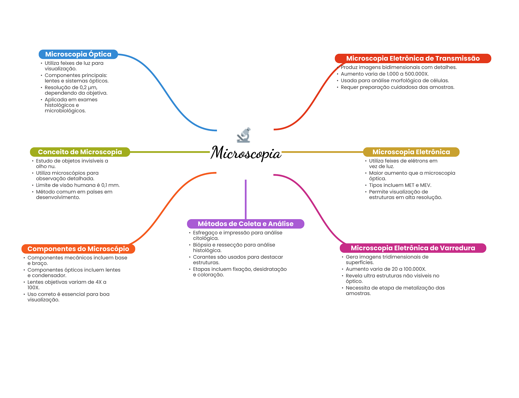 Microscopia Óptica Microscopia Eletrônica de Transmissão Utiliza feixes de luz para visualização. Produz imagens bidimensionais com detalhes. Componentes principais: Aumento varia de 1.000 a 500.000X. lentes e sistemas ópticos. Usada para análise morfológica de células. Resolução de 0,2 µm, Requer preparação cuidadosa das amostras. dependendo da objetiva. Aplicada em exames histológicos e microbiológicos. Conceito de Microscopia Microscopia Microscopia Eletrônica Estudo de objetos invisíveis a Utiliza feixes de elétrons em olho nu. vez de luz. Utiliza microscópios para Maior aumento que a microscopia observação detalhada. óptica. Limite de visão humana é 0,1 mm. Tipos incluem MET e MEV. Método comum em países em Permite de desenvolvimento. estruturas em alta resolução. Métodos de Coleta e Análise Esfregaço e impressão para análise citológica. Biópsia e ressecção para análise Componentes do Microscópio histológica. Microscopia Eletrônica de Varredura Componentes mecânicos incluem base Corantes são usados para destacar Gera imagens tridimensionais de e braço. estruturas. superfícies. Componentes ópticos incluem lentes Etapas incluem fixação, desidratação Aumento varia de 20 a 100.000X. e condensador. e - coloração. Revela ultra estruturas não visíveis no Lentes objetivas variam de 4X a óptico. 100X. Necessita de etapa de metalização das Uso correto é essencial para boa amostras. visualização.