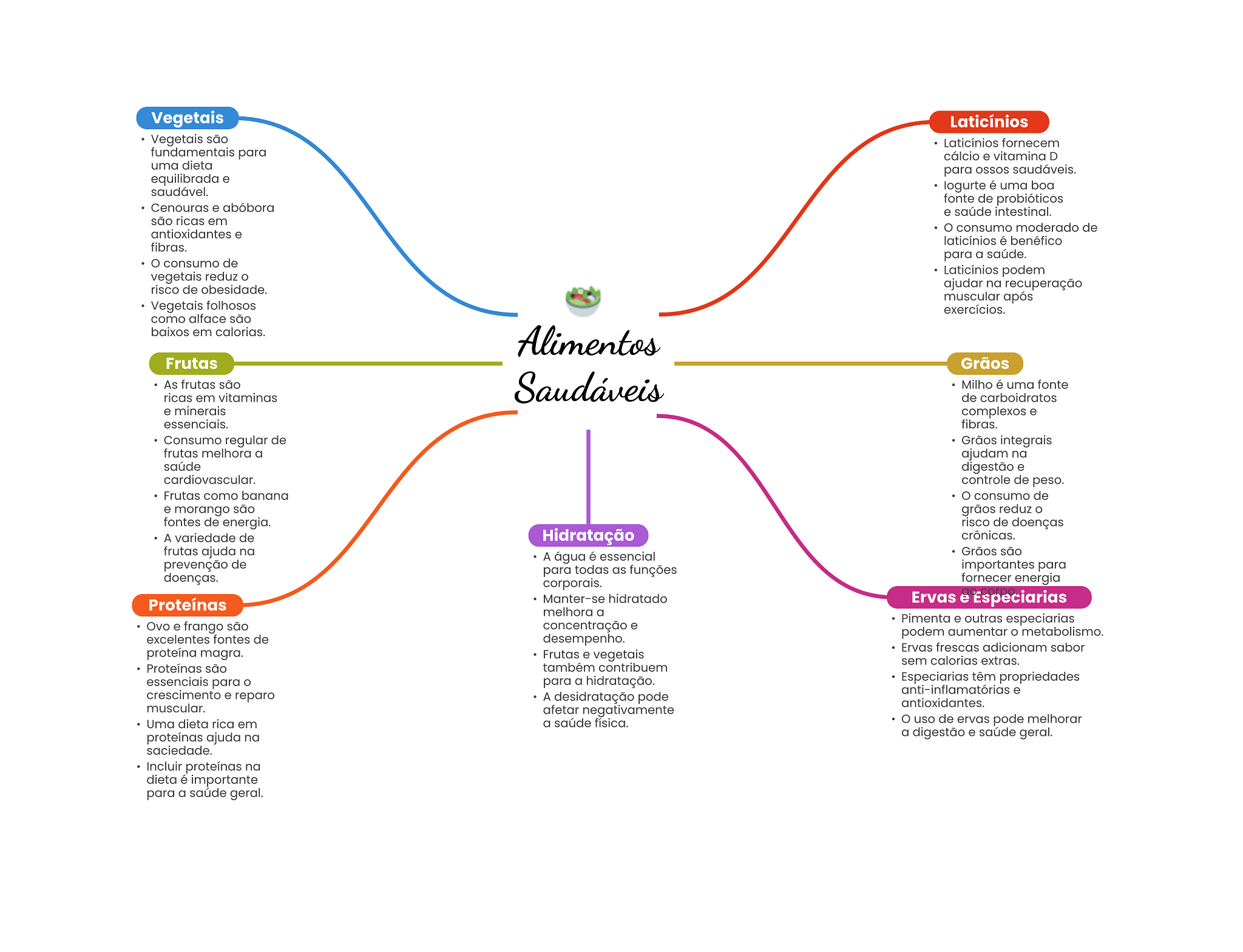 Vegetais Laticínios Vegetais são Laticínios fornecem fundamentais para cálcio e vitamina D uma dieta para saudáveis. equilibrada e saudável. logurte é uma boa fonte de probióticos Cenouras e abóbora e saúde intestinal. são ricas em consumo moderado de antioxidantes e laticínios é benéfico fibras. para a saúde. consumo de Laticínios podem vegetais reduz risco de obesidade. ajudar na recuperação muscular após Vegetais folhosos exercícios. como alface são baixos em calorias. Alimentos Frutas Grãos As frutas são Saudáveis Milho é uma fonte ricas em vitaminas de carboidratos e minerais complexos e essenciais. fibras. Consumo regular de Grãos integrais frutas melhora a ajudam na saúde digestão e cardiovascular. controle de peso. Frutas como banana consumo de e morango são grãos reduz fontes de energia. risco de doenças A variedade de Hidratação crônicas. frutas ajuda na Grãos são A água é essencial prevenção de para todas as funções importantes para doenças. corporais. fornecer energia Proteínas Manter-se hidratado Ervas e Especiarias melhora a Pimenta e outras especiarias Ovo e frango são concentração e desempenho. podem aumentar metabolismo. excelentes fontes de Ervas frescas adicionam sabor proteína magra. Frutas e vegetais sem calorias extras. Proteínas são também contribuem essenciais para para a hidratação. Especiarias têm propriedades anti-inflamatórias e crescimento e reparo A desidratação pode antioxidantes. muscular. afetar negativamente Uma dieta rica em a saúde física. uso de ervas pode melhorar proteínas ajuda na a digestão e saúde geral. saciedade. Incluir proteínas na dieta é importante para a saúde geral.