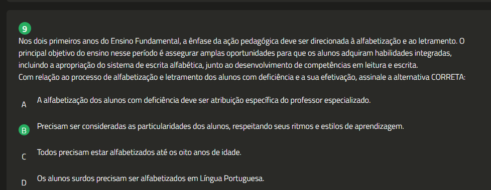 9 Nos dois primeiros anos do Ensino Fundamental, a ênfase da ação pedagógica deve ser direcionada à alfabetização e ao letramento. 0 principal objetivo do ensino nesse período é assegurar amplas oportunidades para que alunos adquiram habilidades integradas, incluindo a apropriação do sistema de escrita alfabética, junto ao desenvolvimento de competências em leitura e escrita. Com relação ao processo de alfabetização e letramento dos alunos com deficiência e a sua efetivação, assinale a alternativa CORRETA: A A alfabetização dos alunos com deficiência deve ser atribuição específica do professor especializado. Precisam ser consideradas as particularidades dos alunos, respeitando seus ritmos e estilos de aprendizagem. Todos precisam estar alfabetizados até oito anos de idade. D Os alunos surdos precisam ser alfabetizados em Língua Portuguesa.