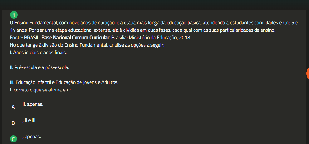 1 0 Ensino Fundamental, com nove anos de duração, é a etapa mais longa da educação básica, atendendo a estudantes com idades entre 6 e 14 anos. Por ser uma etapa educacional extensa, ela é dividida em duas fases, cada qual com as suas particularidades de ensino. Fonte: BRASIL. Base Nacional Comum Curricular. Ministério da Educação, 2018. No que tange à divisão do Ensino Fundamental, analise as opções a seguir: I. Anos iniciais e anos finais. II. Pré-escola e a pós-escola. III. Educação Infantil e Educação de Jovens e Adultos. É correto que se afirma em: A III, apenas. I, II e III. I, apenas.