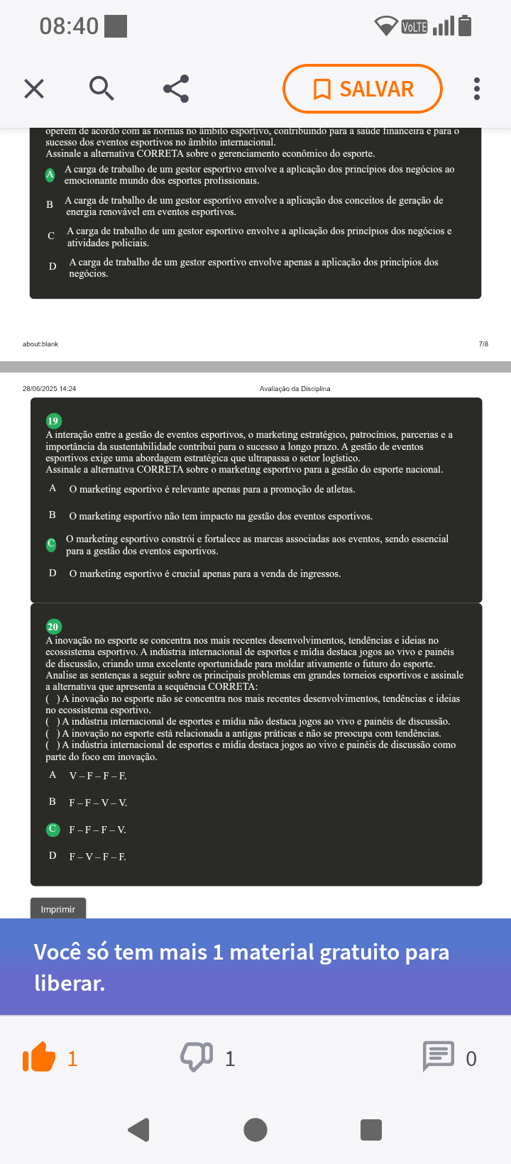 08:40 X SALVAR operem de acordo com as normas no ambito esportivo, contribuindo para a saude financeira e para sucesso dos eventos esportivos no âmbito internacional. Assinale a alternativa CORRETA sobre gerenciamento econômico do esporte. A carga de trabalho de um gestor esportivo envolve a aplicação dos princípios dos negócios ao emocionante mundo dos esportes profissionais. B A carga de trabalho de um gestor esportivo envolve a aplicação dos conceitos de geração de energia renovável em eventos esportivos. C A carga de trabalho de um gestor esportivo envolve a aplicação dos princípios dos negócios e atividades policiais. D A carga de trabalho de um gestor esportivo envolve apenas a aplicação dos dos negócios. about:blank 7/8 28/06/2025 14:24 Avaliação da Disciplina 19 A interação entre a gestão de eventos esportivos, 0 marketing estratégico, patrocínios, parcerias e a importância da sustentabilidade contribui para 0 sucesso a longo prazo. A gestão de eventos esportivos exige uma abordagem estratégica que ultrapassa setor logistico. Assinale a alternativa CORRETA sobre 0 marketing esportivo para a gestão do esporte nacional. A marketing esportivo é relevante apenas para a promoção de atletas. B marketing esportivo não tem impacto na gestão dos eventos esportivos. marketing esportivo e fortalece as marcas associadas aos eventos, sendo essencial para a gestão dos eventos esportivos. D marketing esportivo é crucial apenas para a venda de ingressos. 20 A inovação no esporte se concentra nos mais recentes desenvolvimentos, tendências e ideias no ecossistema esportivo. A indústria internacional de esportes e mídia destaca jogos ao vivo e painéis de discussão, criando uma excelente oportunidade para moldar ativamente futuro do esporte. Analise as sentenças a seguir sobre os principais problemas em grandes torneios esportivos e assinale a alternativa que apresenta a sequência CORRETA: A inovação no esporte não se concentra nos mais recentes desenvolvimentos, tendências e ideias no ecossistema esportivo. A indústria internacional de esportes e mídia não destaca jogos ao vivo e painéis de discussão. inovação no esporte está relacionada a antigas práticas e não se preocupa com tendências. ( )A indústria internacional de esportes e mídia destaca jogos ao vivo e painéis de discussão como parte do foco em inovação. A B F-F-V-V. F-F-F-V. D F-V-F-F. Imprimir Você só tem mais 1 material gratuito para liberar. 1 1 0