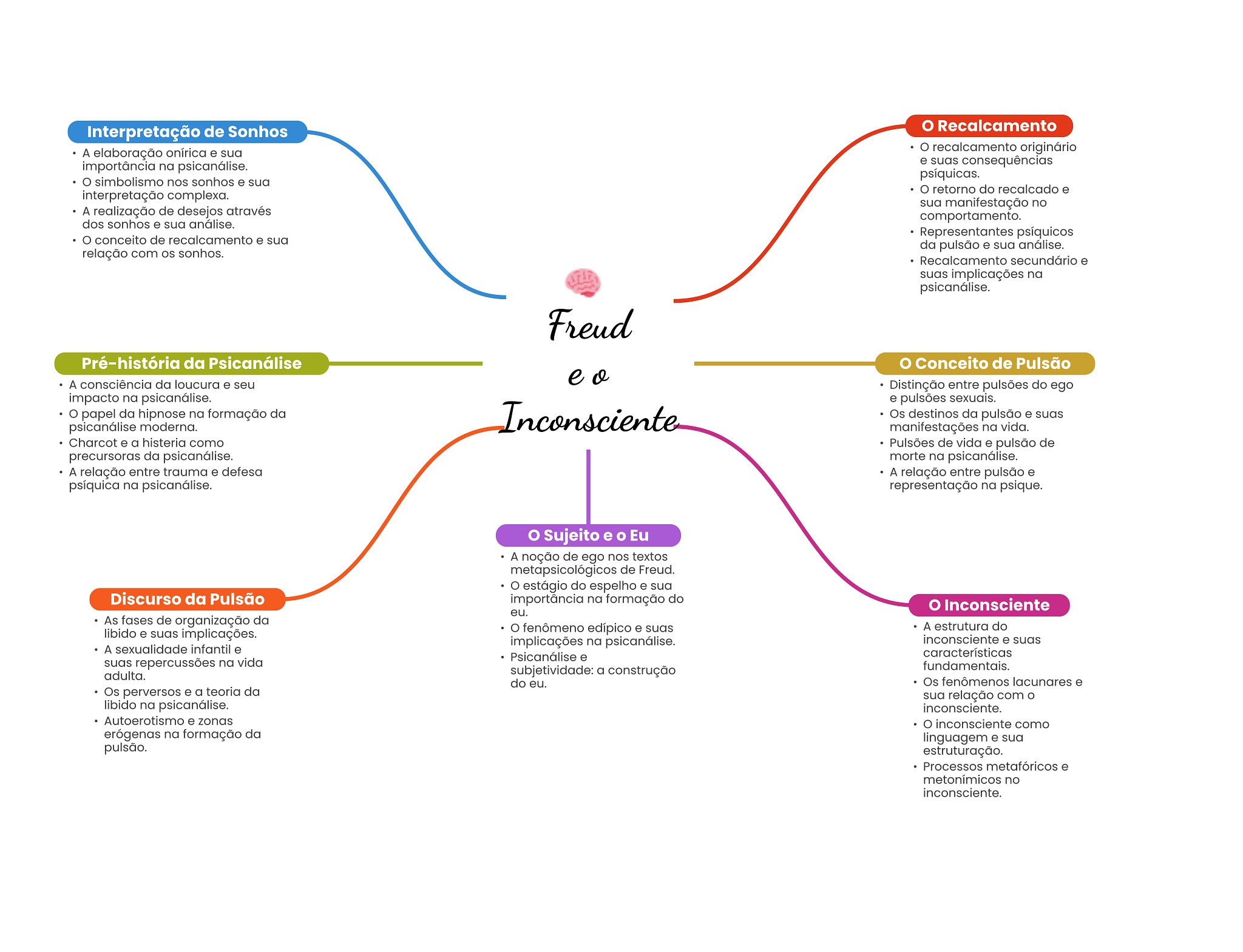 Interpretação de Sonhos Recalcamento A elaboração onírica e sua recalcamento originário importância na psicanálise. e suas consequências psíquicas. simbolismo nos sonhos e sua retorno do recalcado e interpretação complexa. sua manifestação no A realização de desejos através comportamento. dos sonhos e sua análise. Representantes psíquicos conceito de recalcamento e sua da pulsão e sua análise. relação com OS sonhos. Recalcamento secundário e suas implicações na psicanálise. Freud Pré-história da Psicanálise Conceito de Pulsão A consciência da loucura e seu Distinção entre pulsões do ego impacto na psicanálise. e pulsões sexuais. papel da hipnose na formação da psicanálise moderna. Inconsciente Os destinos da pulsão e suas manifestações na vida. Charcot e a histeria como Pulsões de vida e pulsão de precursoras da psicanálise. morte na psicanálise. A relação entre trauma e defesa A relação entre pulsão e psíquica na psicanálise. representação na psique. Sujeito e Eu A noção de ego nos textos metapsicológicos de Freud. estágio do espelho e sua Discurso da Pulsão importância na formação do Inconsciente eu. As fases de organização da fenômeno edípico e suas A estrutura do libido e suas implicações. implicações na psicanálise. inconsciente e suas A sexualidade infantil e Psicanálise e características suas repercussões na vida subjetividade: a construção fundamentais. adulta. do eu. Os fenômenos lacunares e Os perversos e a teoria da sua relação com libido na psicanálise. inconsciente. Autoerotismo e zonas inconsciente como erógenas na formação da linguagem e sua pulsão. estruturação. Processos metafóricos e metonímicos no inconsciente.