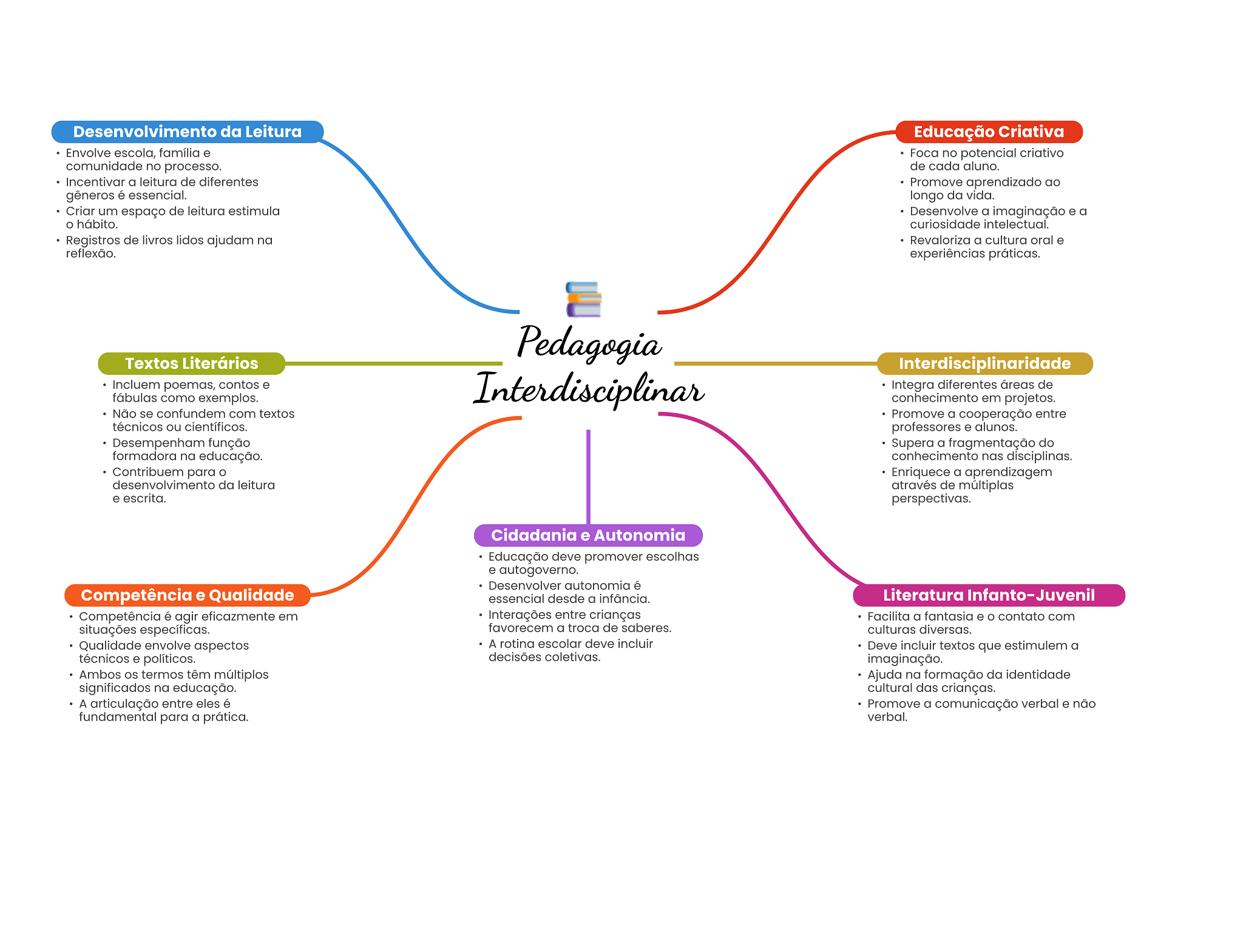 Desenvolvimento da Leitura Educação Criativa Envolve escola, família e Foca no potencial criativo comunidade no processo. de cada aluno. Incentivar a leitura de diferentes Promove aprendizado ao gêneros é essencial. longo da vida. Criar um espaço de leitura estimula Desenvolve a imaginação e a hábito. curiosidade intelectual. Registros de livros lidos ajudam na Revaloriza a cultura oral e reflexão. experiências práticas. Pedagogia Textos Literários Interdisciplinaridade Incluem poemas, contos e Interdisciplinar Integra diferentes áreas de fábulas como exemplos. conhecimento em projetos. Não se confundem com textos Promove a cooperação entre técnicos ou científicos. professores e alunos. Desempenham função Supera a fragmentação do formadora na educação. conhecimento nas disciplinas. Contribuem para Enriquece a aprendizagem desenvolvimento da leitura através de múltiplas e escrita. perspectivas. Cidadania e Autonomia Educação deve promover escolhas e autogoverno. Desenvolver autonomia é Competência e Qualidade essencial desde a infância. Literatura Infanto-Juvenil Competência é agir eficazmente em Interações entre crianças Facilita a fantasia e O contato com situações específicas. favorecem a troca de saberes. culturas diversas. Qualidade envolve aspectos A rotina escolar deve incluir Deve incluir textos que estimulem a técnicos e políticos. decisões coletivas. imaginação. Ambos termos têm múltiplos Ajuda na formação da identidade significados na educação. cultural das crianças. A articulação entre eles é Promove a comunicação verbal e não fundamental para a prática. verbal.