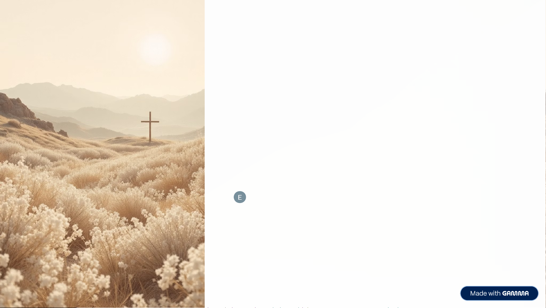 A Força em Cristo: Este guia explora como os cristãos podem encontrar força em Cristo. A força bíblica é resiliência, fé e amor. Filipenses 4:13 nos lembra: "Tudo posso naquele que me fortalece". Vamos descobrir como vivenciar essa força diariamente. por Edgar Menezes https://gamma.app/?utm_source=made-with-gamma Fundamento Bíblico: Deus, a Fonte da Força A Fonte Primária Deus é a fonte de toda força. Isaías 40:29 revela essa verdade. O Espírito Santo A força vem do Espírito Santo. Atos 1:8 confirma isso. Exemplos Bíblicos Davi: A força contra Golias veio de Deus. Paulo: Alegria e força em meio às dificuldades. A força que precisamos não é nossa, mas divina. Conecte-se à fonte para ser fortalecido. https://gamma.app/?utm_source=made-with-gamma A Armadura de Deus: Proteção Espiritual Verdade Protege contra o engano. Justiça Guarda o coração. Evangelho da Paz Prepara para compartilhar a mensagem. Fé Apaga os dardos do maligno. Efésios 6:10-18 descreve a armadura completa. A oração ativa a armadura e mantém a conexão com Deus. https://gamma.app/?utm_source=made-with-gamma Disciplinas Espirituais: Fortalecendo o Espírito Oração Comunicação constante com Deus. Ore de manhã, à tarde e à noite. Leitura da Bíblia Alimento para a alma e guia para a vida. Leia e medite na Palavra. Jejum Humilhação e busca por direção divina. Busque a Deus e arrependa-se. Pratique estas disciplinas para fortalecer seu espírito e se aproximar de Deus. https://gamma.app/?utm_source=made-with-gamma Vencendo Batalhas Internas: Renovando a Mente Identifique Batalhas Pensamentos negativos e tentações. Substitua Pensamentos Por pensamentos bíblicos. Resista ao Pecado Através da oração. Busque a Paz Em todas as situações. Transforme-se pela renovação da mente. Autoconsciência e autocompaixão são essenciais. https://gamma.app/?utm_source=made-with-gamma A Força na Comunidade: Apoio Mútuo Busque Apoio Compartilhe lutas com irmãos. Participe de Grupos Estudo bíblico e oração. Busque Aconselhamento Orientação pastoral. Sirva aos Outros A força vem do serviço. A igreja é o corpo de Cristo. Sirva e seja servido para encontrar força e apoio. https://gamma.app/?utm_source=made-with-gamma Testemunho e Impacto: Transformando Vidas 1 2 3 4 Deixe sua luz brilhar. Influencie a sociedade com valores cristãos e viva uma vida íntegra. Compartilhe o Evangelho Com ousadia e amor. Conte seu Testemunho Como Cristo mudou sua vida. Demonstre Amor Em ações e palavras. Influencie a Sociedade Com valores cristãos. https://gamma.app/?utm_source=made-with-gamma Conclusão: A Jornada Contínua 1 Busque Força Em Cristo diariamente. 2 Lembre-se É uma jornada contínua. 3 Confie Deus renova suas forças. A força cristã é uma jornada, não um destino. Isaías 40:31 nos encoraja a esperar no Senhor. https://gamma.app/?utm_source=made-with-gamma