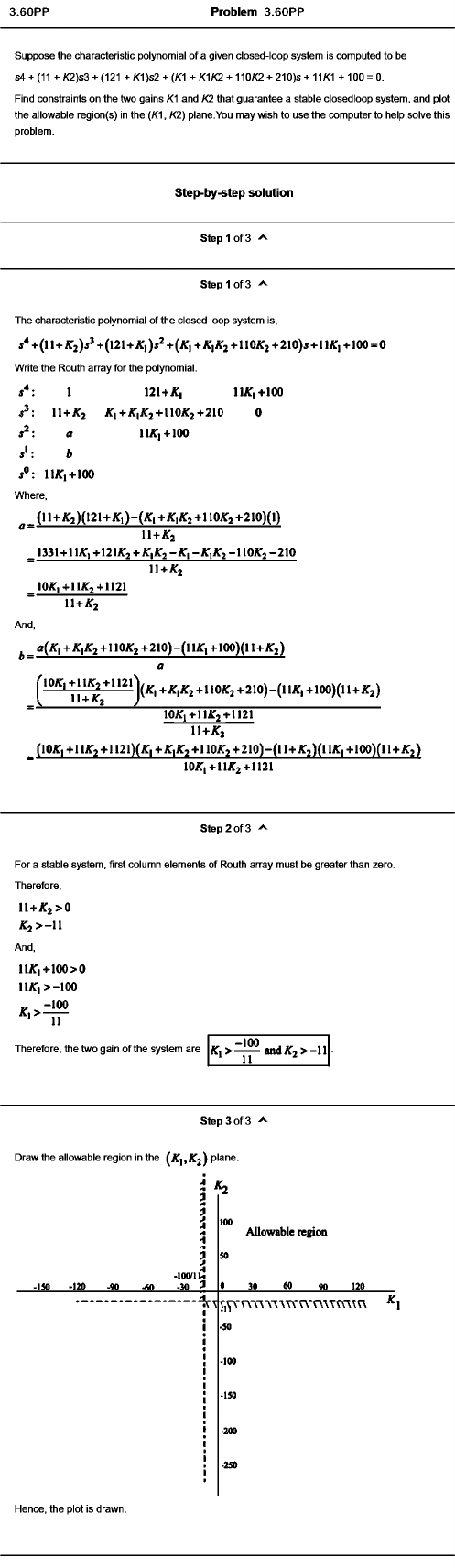 Find constraints on the two gains K^ and K2 that guarantee a stable closedloop system, and plot