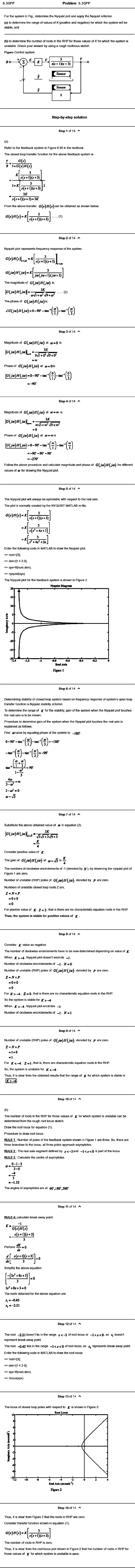P rob lem 6.35PP (a) to determine the range of values of K (positive and negative) for which the system will be For the system in Fig., determine the Nyquist plot and apply the Nyquist criterion (b) to determine the number of roots in the RHP for those values of K for which the system is unstable. Check your answer by using a rough rootlocus sketch. Figure Control system S tep -by-s tep s o lu tio n step 1 of 14 (a) Refer to the feedback system in Figure 6.95 in the textbook. The closed loop transfer function for the above feedback system is: R I+G(s)N(s) 3 j ( j + I ) ( j+ 3 ) 1+ a: 3 | i « ( j+ l) (« + 3 )J 3R 5 ( j + 1) (j + 3 )+ 3 ^ From the above transfer - 4 , Z = 0 : that is there are no characteristic equation roots in the RHP. So the system is stable for > - 4 . When j ^ 3 Step 10 of 14 ^ (b) The number of roots in the RHP for those values of x tor which system is unstable can be determined from the rough root locus sketch. Draw the root locus for equation (1). Procedure to draw root locus: RULE 1 : Number of poles of the feedback system shown in Figure 1 are three. So, there are three branches to the locus, all three poles approach asymptotes. RULE 2 : The real-axis segment defined bv j s o ^doesn ’t represent break away point. The root - 0.45 lies in the range —]