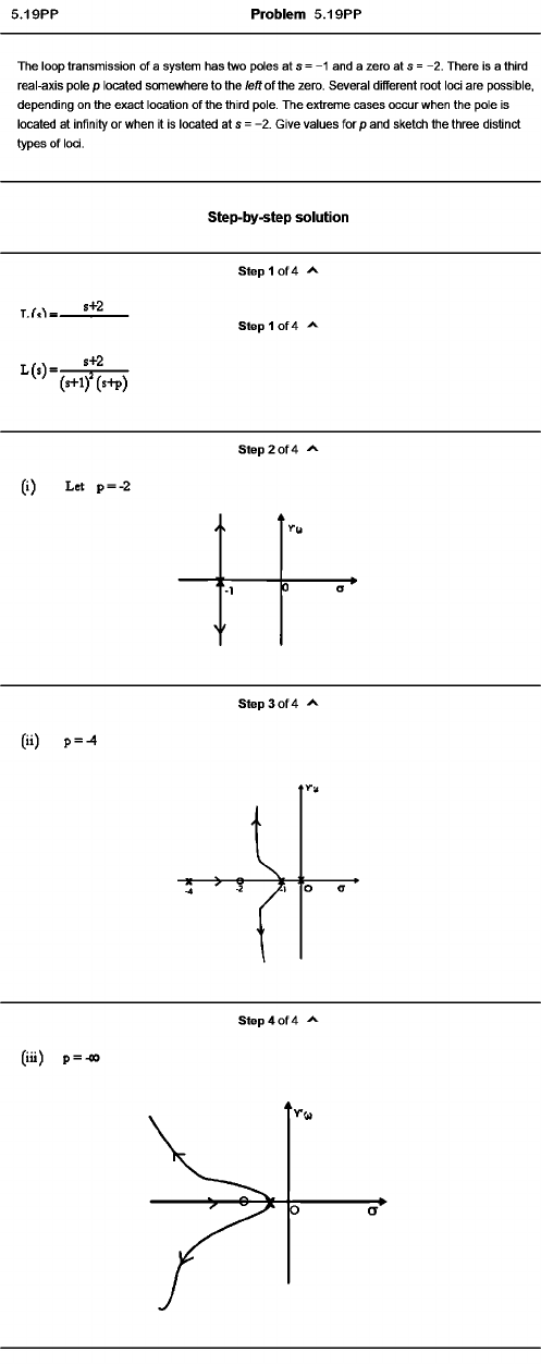 Problem 5.19PP The loop transmission of a system has two poles at s = -1 and a zero at s = -2. There is a third real-axis pole p located somewhere to the /e/tof the zero. Several different root loci are possible, depending on the exact location of the third pole. The extreme cases occur when the pole is located at infinity or when it is located at s = -2. Give values for p and sketch the three distinct types of loci. Step-by-step solution step 1 of 4 T . M s - s+2 Step 1 of 4 L (s )= ----- ---------- (= + l)C = ^ ) (i) Let p = -2 Step 2 of 4 Step 3 of 4 ( ii) p = ^ Step 4 of 4 (iii) p = -oo
