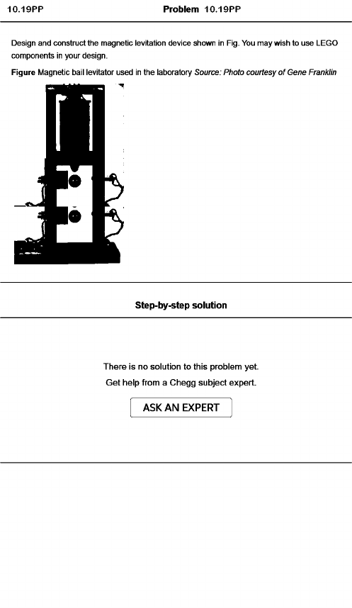 Problem 10.19PP Design and construct the magnetic levitation device shown in Fig. You may wish to use LEGO components in your design. Figure Magnetic bail levitator used in the laboratory Source: Photo courtesy o f Gene Franklin fl 3 Step-by-step solution There is no solution to this problem yet. Get help from a Chegg subject expert. ASK AN EXPERT