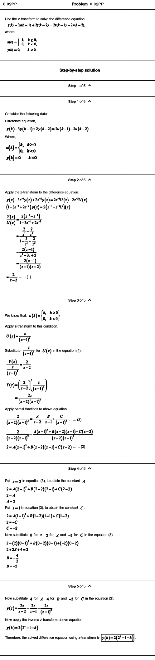 Problem 8.02PP Use the z-transform to solve the difference equation y(t) - 3y(* - 1) + 2y(* - 2) = 2«(* - 1 ) - 2»(* - 2), where K(t) = * > o . 0. ib ( * ) - 3 ; - ( t - l ) + 2 y ( * - 2 ) = 2 i ( ( * - l ) - 2 » ( * - 2 ) i t ^ O fc (k ) = 0 k (z) = 2(z-' - z - ’l / ) ( r ) y ( z ) 2 ( z - ' - r ^ ) U (z) l-3z-'+2z-* A 1. 1 - 4 - + 42 2 2 ( ^ - 0 z '-3 z + 2 _ 2 (£ -1 ) 2 ‘ z - 2 ( z - l ) ( z - 2) ...... (1) Step 3 of 5 We know that. » ( Apply z-transfonn to this condition. ( z - l ) Substitute -------T t / f z ) in the equation (1). ( z - l ) ' > y ( ^ ) 2 Z z - 2 ( z - l ) ' n o “ ( z - 2 ) [ ( . - l ) ' 2z ( z - 2) ( z - l ) ' Apply partial fractions to above equation. A B C Z + - + - . ----- -T ...... (2) ( z - 2 ) ( z - l ) ' ” z - 2 2 - 1 ( 2 - 1)* 2 .