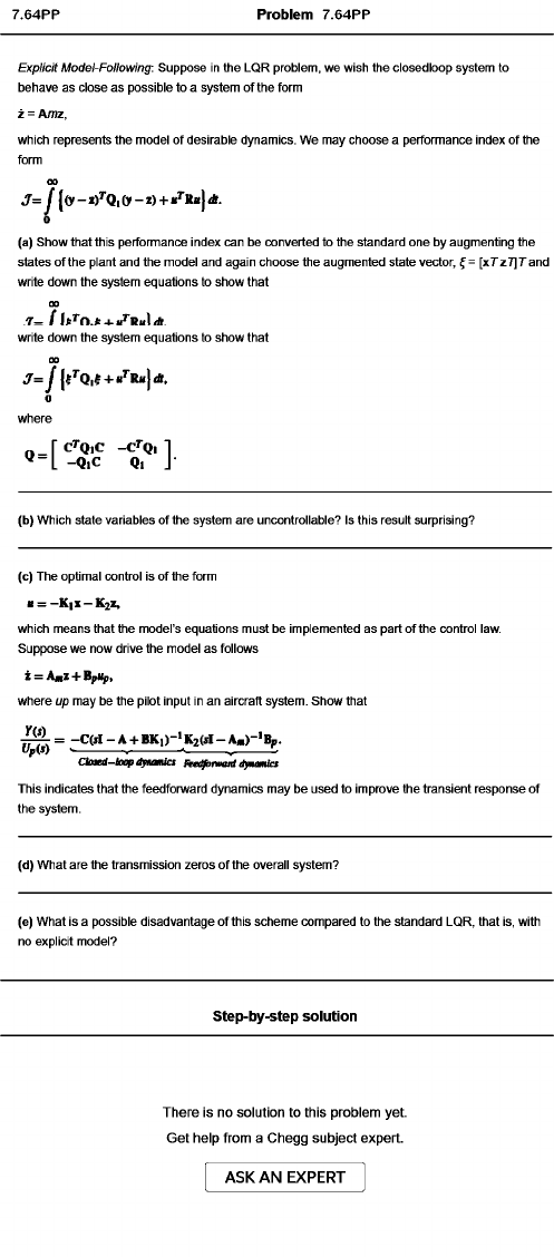 Problem 7.64PP Explicit Model-Following: Suppose in the LQR problem, we wish the closedloop system to behave as close as possible to a system of the form which represents the model of desirable dynamics. We may choose a performance index of the form 00 7 = ̂ j(J r- i) ’ 'Q |C y-l) + ll’ ’K«j