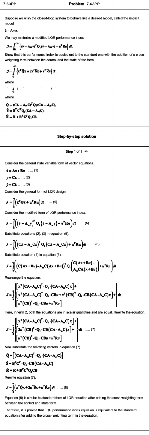 Problem 7.63PP Suppose we wish the closed-loop system to behave like a desired model, called the implicit model Z = A/77Z. We may minimize a modified LQR performance index j f “ [ (J - A ^ / q , » - A .y ) + a . Show that this performance Index Is > weighting term between the control s Show that this performance Index Is equivalent to the standard one with the addition of a cross weighting term between the control and the state of the form where " J 1 0 = (CA - A«C)’'Q i (CA - A .C), S = (CA - A«C), f i = R + B’'C’’Q,CB. Step-by-step solution step 1 of 1 Consider the general state variable form of vector equations. x = A i+ B i / .......(1) y = C r ...... (2) > = C i ...... (3) Consider the general form of LQR design. J = J (* ’'Qx + u’'R « ) * (4) 0 Consider the modified form of LQR performance index. J = J ( ( y - A . y f Q , ( y - A . y ) + (5) Substitute equations (2), (3) In equation (5). J = J^ (C x - A ^ C x ) Q j (C x - A ^C x) + Substitute equation (1) in equation (6). Rearrange the equation. [ x ^ ( C A -A .C ) ’ -Q , ( C A - A .C ) x ] + y = J [x ^ (C A -A .c y Q, CBH+i(’ (C B y Q, C B(CA -A .C )x]+ dt [ ii’' (C B y -Q , -CB b + ii’'R ii] Here, in term 2, both the equations are in scalar quantities and are equal. Rewrite the equation. [ x ^ ( C A -A .C ) ’ -Q , - (C A - A .C ) x ] + (6) y = [ (7)[2 « 4 (C B y Q , C B ( C A - A .C ) x ] + [ii’' (C B ^ -Q , •CBu + ii’'Rb ] Now substitute the following vectors in equation (7). Q -[(C A -A .C y Q, (CA-A.C)] S - Q , C B (C A - A ,C ) R - R + B ^ C ’ Q ,C B Rewrite equation (7). y = J(x ’^Qx+2a^Sx+i/^Ru)