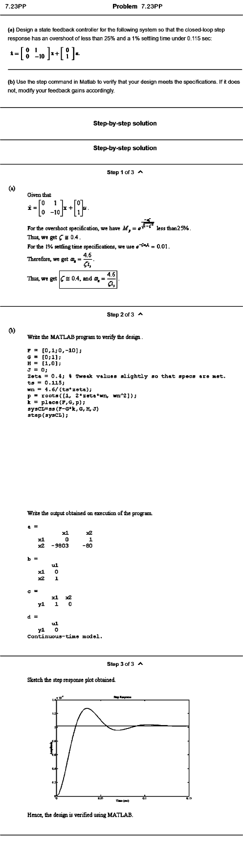 Problem 7.23PP (a) Design a state feedback controller for the following system so that the closed-loop step response has an overshoot of less than 25% and a 1% settling time under 0.115 sec: * = [ o -10 ]*+ [? ]■ ■ • (b) Use the step command in Matlab to verify that your design meets the specifications. If it does not, modify your feedback gains accordingly. Step-by-step solution Step-by-step solution step 1 of 3 (a) Given tliat i : .X = 1For tile overshoot specification, we have = e'^ Thus, we get ^ s 0.4. For tile lYo setting time specifications, we use = 0.01. 4.6'Hierefbre, we get = f t Thus, we get 4 6^ 'sO .4 , and