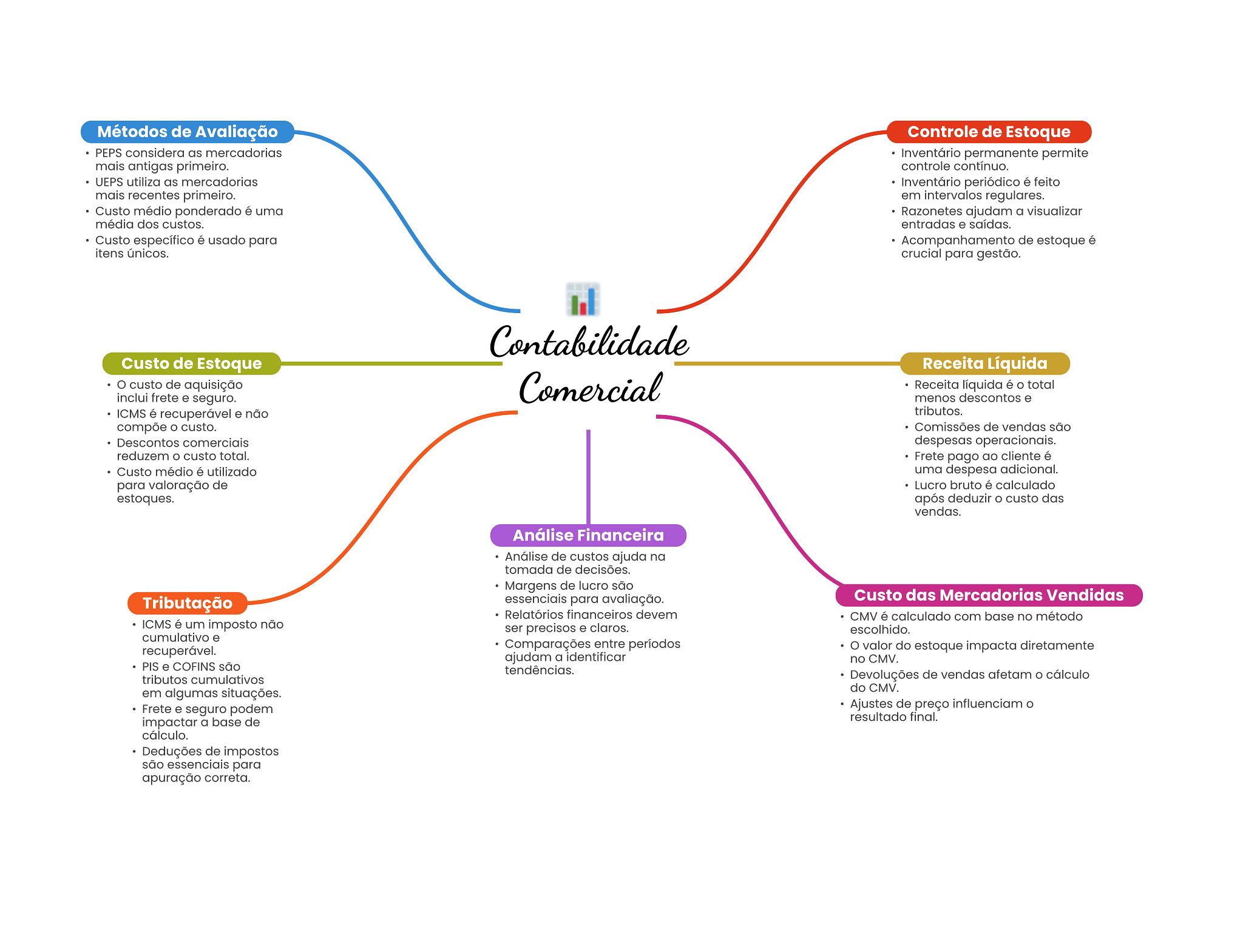 Métodos de Avaliação Controle de Estoque PEPS considera as mercadorias Inventário permanente permite mais antigas primeiro. controle contínuo. UEPS utiliza as mercadorias Inventário periódico é feito mais recentes primeiro. em intervalos regulares. Custo médio ponderado é uma Razonetes ajudam a visualizar média dos custos. entradas e saídas. Custo específico é usado para Acompanhamento de estoque é itens únicos. crucial para gestão. Contabilidade Custo de Estoque Receita Líquida custo de aquisição Comercial Receita líquida é O total inclui frete e seguro. menos descontos e ICMS é recuperável e não tributos. compõe custo. Comissões de vendas são Descontos comerciais despesas operacionais. reduzem custo total. Frete pago ao cliente é Custo médio é utilizado uma despesa adicional. para valoração de Lucro bruto é calculado estoques. após deduzir custo das vendas. Análise Financeira Análise de custos ajuda na tomada de decisões. Margens de lucro são Tributação essenciais para avaliação. Custo das Mercadorias Vendidas Relatórios financeiros devem CMV é calculado com base no método ICMS é um imposto não ser precisos e claros. escolhido. cumulativo e recuperável. Comparações entre períodos O valor do estoque impacta diretamente ajudam a identificar no CMV. PIS e COFINS são tendências. tributos cumulativos Devoluções de vendas afetam O cálculo do CMV. em algumas situações. Frete e seguro podem Ajustes de preço influenciam impactar a base de resultado final. cálculo. Deduções de impostos são essenciais para apuração correta.