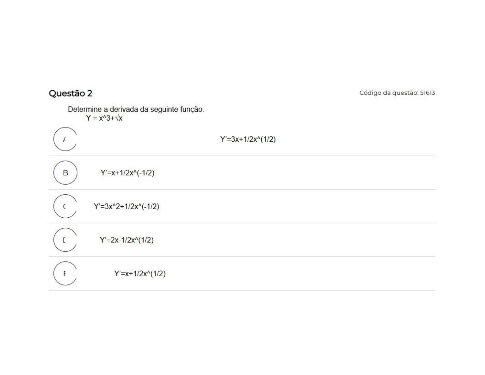 Questão 2 Código da questão: 51613 Determine a derivada da seguinte função: / Y'=3x+1/2x^(1/2) Y'=x+1/2x^(-1/2) ( Y'=3x^2+1/2x^(-1/2) [ Y'=2x-1/2x^(1/2) E Y'=x+1/2x^(1/2)