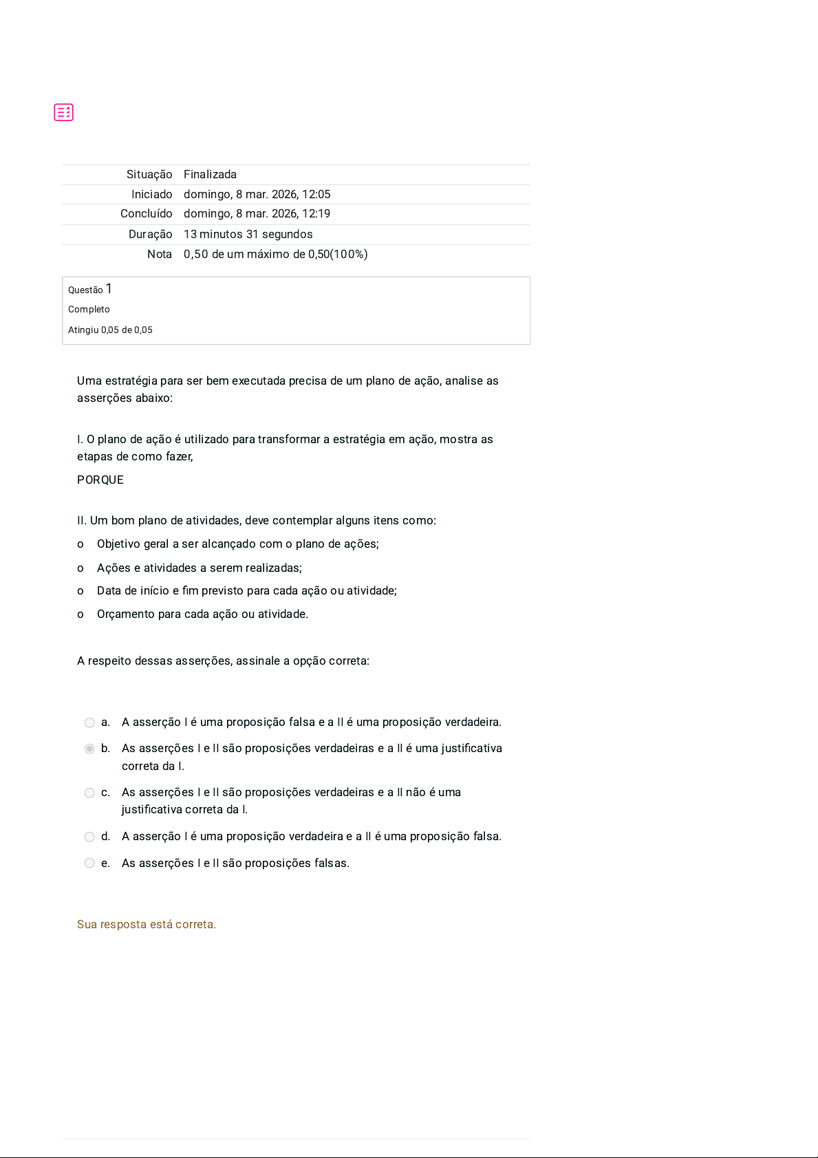 Situação Finalizada Iniciado domingo, 8 mar. 2026, 12:05 Concluído domingo, 8 mar. 2026, 12:19 Duração 13 minutos 31 segundos Nota 0,50 de um máximo de 0,50(100%) Questão 1 Completo Atingiu 0,05 de 0,05 Uma estratégia para ser bem executada precisa de um plano de ação, analise as asserções abaixo: I. O plano de ação é utilizado para transformar a estratégia em ação, mostra as etapas de como fazer, PORQUE II. Um bom plano de atividades, deve contemplar alguns itens como: o Objetivo geral a ser alcançado com o plano de ações; o Ações e atividades a serem realizadas; o Data de início e �m previsto para cada ação ou atividade; o Orçamento para cada ação ou atividade. A respeito dessas asserções, assinale a opção correta: a. A asserção I é uma proposição falsa e a II é uma proposição verdadeira. b. As asserções I e II são proposições verdadeiras e a II é uma justi�cativa correta da I. c. As asserções I e II são proposições verdadeiras e a II não é uma justi�cativa correta da I. d. A asserção I é uma proposição verdadeira e a II é uma proposição falsa. e. As asserções I e II são proposições falsas. Sua resposta está correta. Questão 2 Completo Atingiu 0,05 de 0,05 Há inovações que são chamadas como inovações internas e também as inovações por estratégia de cooperação. Com base nesse trecho, analise as alternativas e assinale a que apresenta as melhores de�nições destas estratégias de inovação. a. São estratégias complementares. b. Inovação interna, são aquelas que ocorrem mediante a ações internas, geralmente, após a realização de pesquisas internas pela área de pesquisa e desenvolvimento, já as inovações por cooperação são empresas com poucos recursos para suas atividades de Pesquisa e Desenvolvimento (P&D), e desta forma complementam por meio das estratégias de cooperação, pode ser: alianças estratégicas e joint ventures. c. Inovação interna, são aquelas que ocorrem mediante a ações internas, geralmente, após a realização de pesquisas com os consumidores mais frequentes, já as inovações por cooperação são empresas com poucos recursos para suas atividades de Pesquisa e Desenvolvimento (P&D), e desta forma complementam por meio das estratégias de cooperação, pode ser: alianças estratégicas e joint ventures. d. Ambas estratégias são semelhantes, a única diferença é que a inovação de cooperação acontece pela cooperação de todos os envolvidos internamente na empresa. e. Ambas estratégias são semelhantes, a única diferença que a inovação interna, ocorre a partir da promoção de funcionários internamente para cargos de liderança e estratégicos. Sua resposta está correta. Questão 3 Completo Atingiu 0,05 de 0,05 Questão 4 Completo Atingiu 0,05 de 0,05 Após formular a estratégia é necessário implementá-la e para isso algumas etapas precisam ser seguidas. Veja as seguintes informações sobre a implementação da estratégia e assinale a alternativa correta: I – Uma das etapas é analisar a mudança estratégica, veri�car qual impacto que essa estratégia terá na organização. II – Outra etapa da implementação é a estratégia de a�rmação, onde é realizado um checklist para con�rmar se a empresa está preparada para a nova estratégia. III – uma etapa é a estratégia de mudança limitada, onde implica a oferta de novos produtos em mercados novos dentro da mesma classe de produtos. a. Apenas I e II estão corretas. b. Apenas II e III estão corretas. c. Apenas I e III estão corretas. d. Apenas I está correta. e. As alternativas I, II, III e IV estão corretas. Sua resposta está correta. Ferramentas estratégicas contribuem para a tomada de decisão, orientando a implementação do plano estratégico. Quais das alternativas abaixo é uma ferramenta estratégica para implementação do plano estratégico? a. Swot. b. Diagrama de Pareto. c. Cronograma. d. 5w2h. e. Fluxograma. Sua resposta está correta. Questão 5 Completo Atingiu 0,05 de 0,05 Questão 6 Completo Atingiu 0,05 de 0,05 Outro tipo de estratégia adotado pelas empresas é a “estratégia baseada em conhecimento”. O que esse tipo de estratégia tem como foco? a. Transformar o conhecimento coletivo em conhecimento individual. b. Transformar o conhecimento individual em conhecimento coletivo. c. Contratar somente pessoas com mais de 5 anos de experiência na área desejada. d. Ser conhecida como empresa que gera mais inovação e conhecimento para o mundo. e. Contratação somente de pessoas com formações especí�cas na área de atuação da empresa. Sua resposta está correta. Sobre a estratégia de desinvestimento observe as a�rmativas: I. O conhecimento organizacional, é um importante recurso de uma empresa, para que ela seja vista como uma organização do conhecimento PORQUE II. É preciso que ela seja capaz de integrar os processos que ocorrem em três situações: criação de signi�cado, construção de conhecimento e tomada de decisões. Assinale a alternativa correta: a. A asserção I é uma proposição falsa e a II é uma proposição verdadeira. b. As asserções I e II são proposições verdadeiras, mas a II não é uma justi�cativa correta da I. c. A asserção I é uma proposição verdadeira e a II é uma proposição falsa. d. As asserções I e II são proposições falsas. e. As asserções I e II são proposições verdadeiras e a II é uma justi�cativa correta da I. Sua resposta está correta. Questão 7 Completo Atingiu 0,05 de 0,05 Questão 8 Completo Atingiu 0,05 de 0,05 A etapa de elaboração do plano de ação é uma etapa bastante importante para conscientizar todos dos processos, contudo a etapa de elaboração do plano de ação apresenta 5 etapas. Assinale a alternativa que apresenta corretamente todas essas etapas: a. Iniciação, análise, ação, controle e revisão. b. Iniciação, planejamento, execução, mo