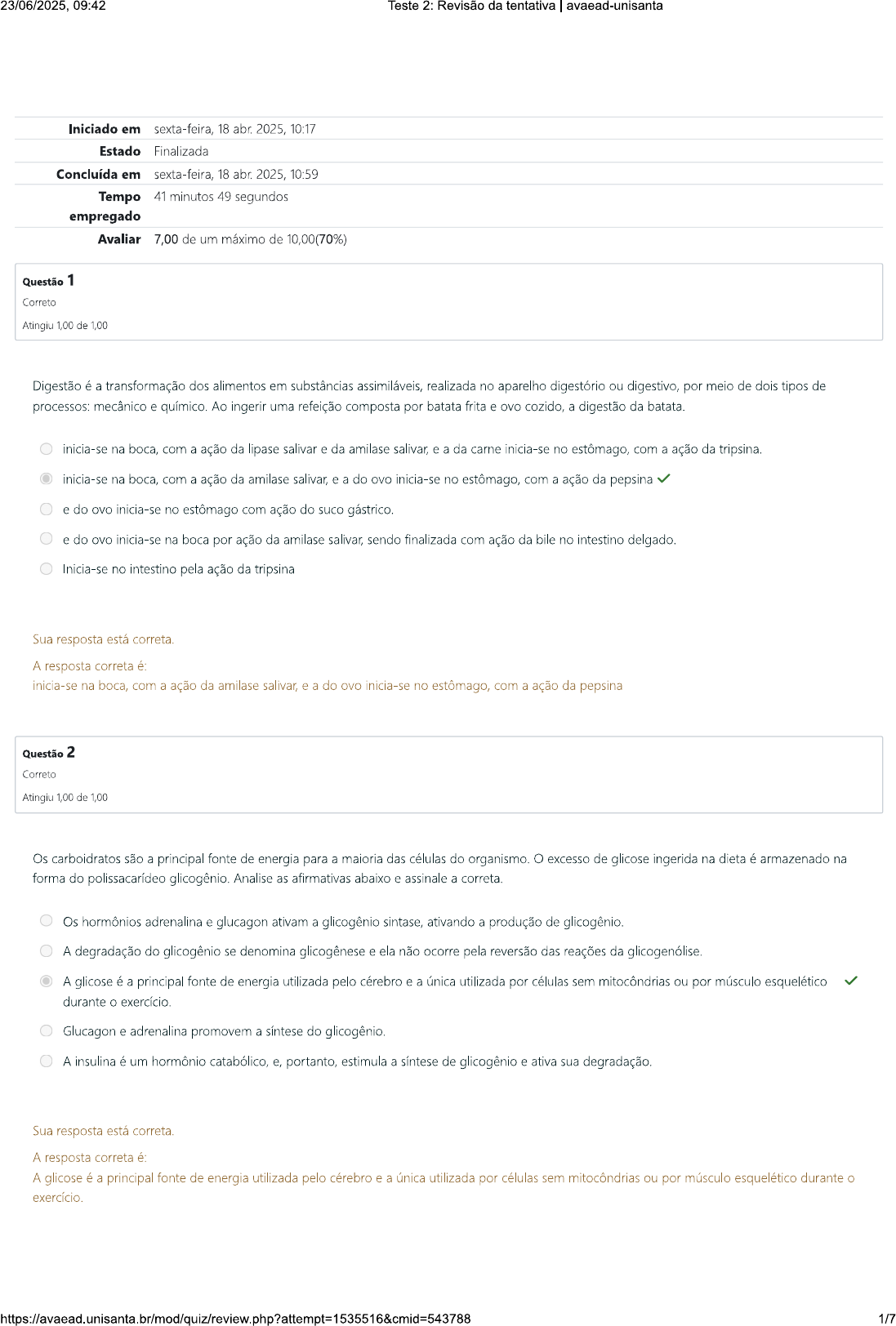 23/06/2025, 09:42 Teste 2: Revisão da tentativa avaead-unisanta Iniciado em sexta-feira, 18 abr. 2025, 10:17 Estado Finalizada Concluída em sexta-feira, 18 abr. 2025, 10:59 Tempo 41 minutos 49 segundos empregado Avaliar 7,00 de um máximo de 10,00(70%) Questão 1 Correto Atingiu 1,00 de 1,00 Digestão é a transformação dos alimentos em substâncias assimiláveis, realizada no aparelho digestório ou digestivo, por meio de dois tipos de processos: mecânico e químico. Ao ingerir uma refeição composta por batata frita e cozido, a digestão da batata. inicia-se na boca, com a ação da lipase salivar e da amilase salivar, e a da carne inicia-se no estômago, com a ação da tripsina. inicia-se na boca, com a ação da amilase salivar, e a do inicia-se no estômago, com a ação da pepsina e do inicia-se no estômago com ação do suco gástrico. e do inicia-se na boca por ação da amilase salivar, sendo finalizada com ação da bile no intestino delgado. Inicia-se no intestino pela ação da tripsina Sua resposta está correta. A resposta correta é: inicia-se na boca, com a ação da amilase salivar, e a do inicia-se no estômago, com a ação da pepsina Questão 2 Correto Atingiu 1,00 de 1,00 Os carboidratos são a principal fonte de energia para a maioria das células do organismo. O excesso de glicose ingerida na dieta é armazenado na forma do polissacarídeo glicogênio. Analise as afirmativas abaixo e assinale a correta. Os hormônios adrenalina e glucagon ativam a glicogênio sintase, ativando a produção de glicogênio. A degradação do glicogênio se denomina glicogênese e ela não ocorre pela reversão das reações da glicogenólise. A glicose é a principal fonte de energia utilizada pelo cérebro e a única utilizada por células sem mitocôndrias ou por músculo esquelético durante exercício. Glucagon e adrenalina promovem a síntese do glicogênio. A insulina é um hormônio catabólico, e, portanto, estimula a síntese de glicogênio e ativa sua degradação. Sua resposta está correta. A resposta correta é: A glicose é a principal fonte de energia utilizada pelo cérebro e a única utilizada por células sem mitocôndrias ou por músculo esquelético durante exercício. 1/723/06/2025, 09:42 Teste 2: Revisão da tentativa avaead-unisanta Questão 3 Correto Atingiu 1,00 de 1,00 Considerando processo da fotossíntese, escreva V ou F conforme seja verdadeiro ou falso que se afirma nos itens abaixo. As reações dependentes da luz ocorrem na fase fotoquímica. ( ) Na fase bioquímica, as moléculas de água são clivadas e O2 é liberado. A redução de moléculas carregadoras de elétrons NADP+ para NADPH ocorre na fase fotoquímica. A energia do ATP é usada para ligar CO2 a uma molécula orgânica na fase bioquímica. Na fase fotoquímica, poder redutor do NADPH é utilizado para reduzir um átomo de carbono a um carboidrato. A sequência correta, de cima para baixo, é: Sua resposta está correta. A resposta correta é: 2/723/06/2025, 09:42 Teste 2: Revisão da tentativa avaead-unisanta Questão 4 Incorreto Atingiu 0,00 de 1,00 Durante a aula de Biologia, professor propôs a realização de um experimento. Os estudantes deveriam cortar ao meio uma garrafa de refrigerante (do tipo PET), despejar no fundo da garrafa uma camada fina de cascalho, depois outra de areia, outra de carvão vegetal em pó e, por último, outra de terra vegetal. Em seguida, deveriam umedecer a terra e plantar mudas de alguma planta herbácea. Ao final, deveriam unir de volta as duas partes da garrafa com fita adesiva, conforme mostrado na figura a seguir, mantendo a garrafa completamente fechada e sob iluminação natural. Imagem associada para resolução da questão Fonte: LINHARES, S.; GEWANDZNAJDER, F. Biologia hoje. São Paulo: Ática, 2. ed., vol.3, 2013. p. 215 Os estudantes, então, levantaram diferentes hipóteses sobre que aconteceria com a planta depois de quatro semanas, mas a única que explica corretamente que eles encontraram é: a planta sobreviveu, já que tanto oxigênio, gás carbônico e a água eram reciclados ao longo do metabolismo da planta, pelo fato de a garrafa ter sido mantida completamente fechada. a planta sobreviveu, pois, em um ambiente fechado, ela não necessita de oxigênio, já que não faz respiração e retira do solo todos os elementos necessários ao seu metabolismo. a planta morreu por falta de água, necessária para seu metabolismo hídrico, já que a garrafa foi mantida completamente fechada. a planta morreu porque a garrafa fechada não possibilitou a entrada de gás carbônico, necessário para a fotossíntese. a planta morreu, porque a garrafa fechada não permitiu a entrada de oxigênio, necessário para sua respiração. Sua resposta está incorreta. A resposta correta é: a planta sobreviveu, já que tanto oxigênio, gás carbônico e a água eram reciclados ao longo do metabolismo da planta, pelo fato de a garrafa ter sido mantida completamente fechada. 3/723/06/2025, 09:42 Teste 2: Revisão da tentativa avaead-unisanta Questão 5 Incorreto Atingiu 0,00 de 1,00 Os carboidratos são a principal fonte de energia para a maioria das células do organismo, são consumidos geralmente na forma de polissacarídeos, sendo os mais comuns glicogênio e amido. Os polissacarídeos são degradados no trato gastrointestinal, e são, então, absorvidos no intestino delgado, sendo a glicose, monossacarídeo mais comum consumido e excesso de glicose ingerida na dieta é armazenada na forma do polissacarídeo glicogênio. glicogênio é armazenado no fígado e nos músculos onde desempenha papéis metabólicos diferentes. Os depósitos de glicogênio no fígado e a glicemia variam durante os diversos períodos do dia. Analise as afirmativas abaixo: I. Depois de uma refeição, os depósitos de glicogênio diminuem. II. Os depósitos de glicogênio entre as refeições diminuem conforme a glicose é liberada do glicogênio hepático para ajudar a manter 