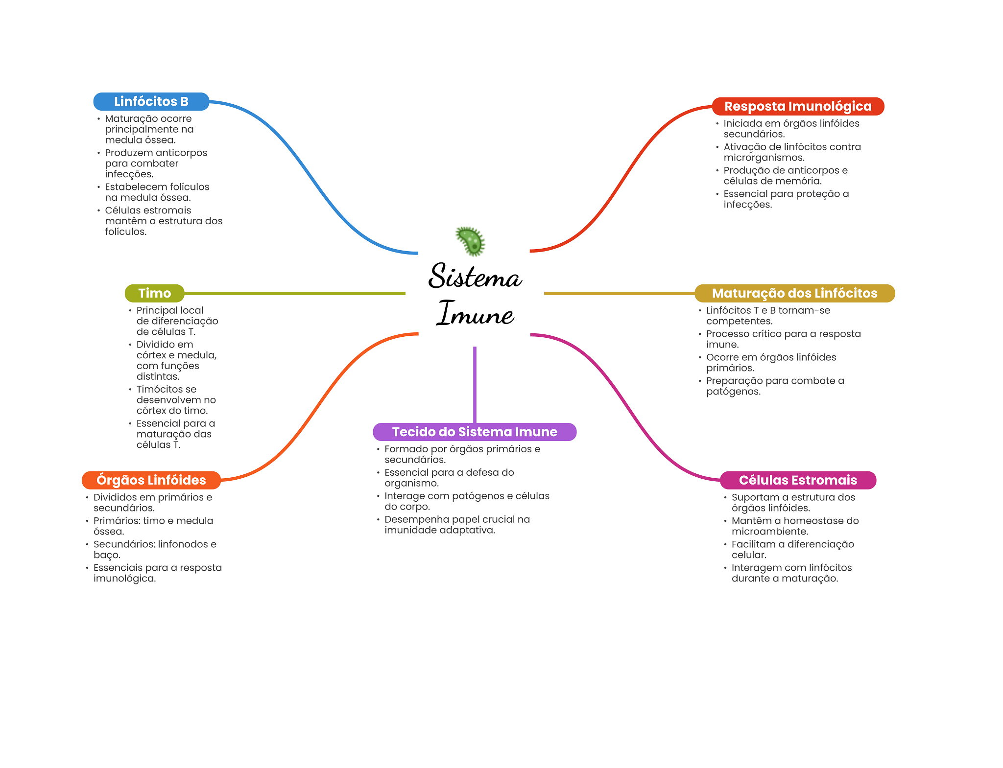 Linfócitos Resposta Imunológica Maturação ocorre principalmente na Iniciada em órgãos linfóides secundários. medula óssea. Ativação de linfócitos contra Produzem anticorpos microrganismos. para combater infecções. Produção de anticorpos e células de memória. Estabelecem folículos na medula óssea. Essencial para proteção a Células estromais infecções. mantêm a estrutura dos folículos. Sistema Timo Maturação dos Linfócitos Principal local Imune Linfócitos Te tornam-se de diferenciação competentes. de células T. Processo crítico para a resposta Dividido em imune. córtex e medula, Ocorre em linfóides com funções primários. distintas. Preparação para combate a Timócitos se patógenos. desenvolvem no córtex do timo. Essencial para a maturação das Tecido do Sistema Imune células T. Formado por órgãos primários e secundários. Órgãos Linfóides Essencial para a defesa do organismo. Células Estromais Divididos em primários e Interage com patógenos e células Suportam a estrutura dos secundários. do corpo. órgãos linfóides. Primários: timo e medula Desempenha papel crucial na Mantêm a homeostase do óssea. imunidade adaptativa. microambiente. Secundários: linfonodos e Facilitam a diferenciação baço. celular. Essenciais para a resposta Interagem com linfócitos imunológica. durante a maturação.