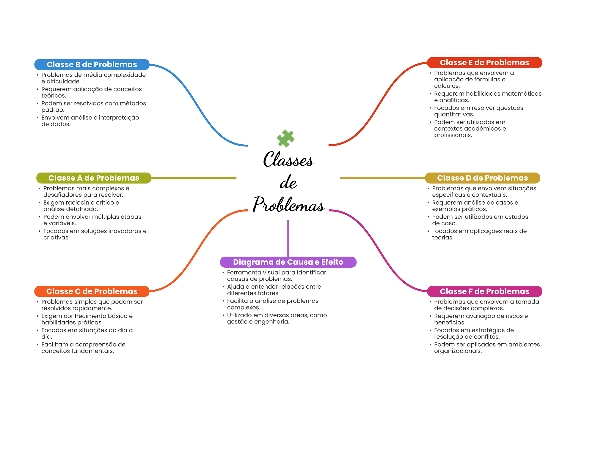 Classe de Problemas Classe E de Problemas Problemas de média complexidade Problemas que envolvem a e dificuldade. aplicação de fórmulas e cálculos. Requerem aplicação de conceitos teóricos. Requerem habilidades matemáticas e analíticas. Podem ser resolvidos com métodos padrão. Focados em resolver questões Envolvem análise e interpretação quantitativas. de dados. Podem ser utilizados em contextos acadêmicos e profissionais. Classes Classe A de Problemas de Classe D de Problemas Problemas mais complexos e Problemas que envolvem situações desafiadores para resolver. específicas e contextuais. Exigem raciocínio crítico e análise detalhada. Problemas Requerem análise de casos e exemplos práticos. Podem envolver múltiplas etapas Podem ser utilizados em estudos e variáveis. de caso. Focados em soluções inovadoras e Focados em aplicações reais de criativas. teorias. Diagrama de Causa e Efeito Ferramenta visual para identificar causas de problemas. Ajuda a entender relações entre Classe de Problemas diferentes fatores. Classe F de Problemas Problemas simples que podem ser Facilita a análise de problemas Problemas que envolvem a tomada resolvidos rapidamente. complexos. de decisões complexas. Exigem conhecimento básico e Utilizado em diversas áreas, como Requerem avaliação de riscos e habilidades práticas. gestão e engenharia. benefícios. Focados em situações do dia a Focados em estratégias de dia. resolução de conflitos. Facilitam a compreensão de Podem ser aplicados em ambientes conceitos fundamentais. organizacionais.