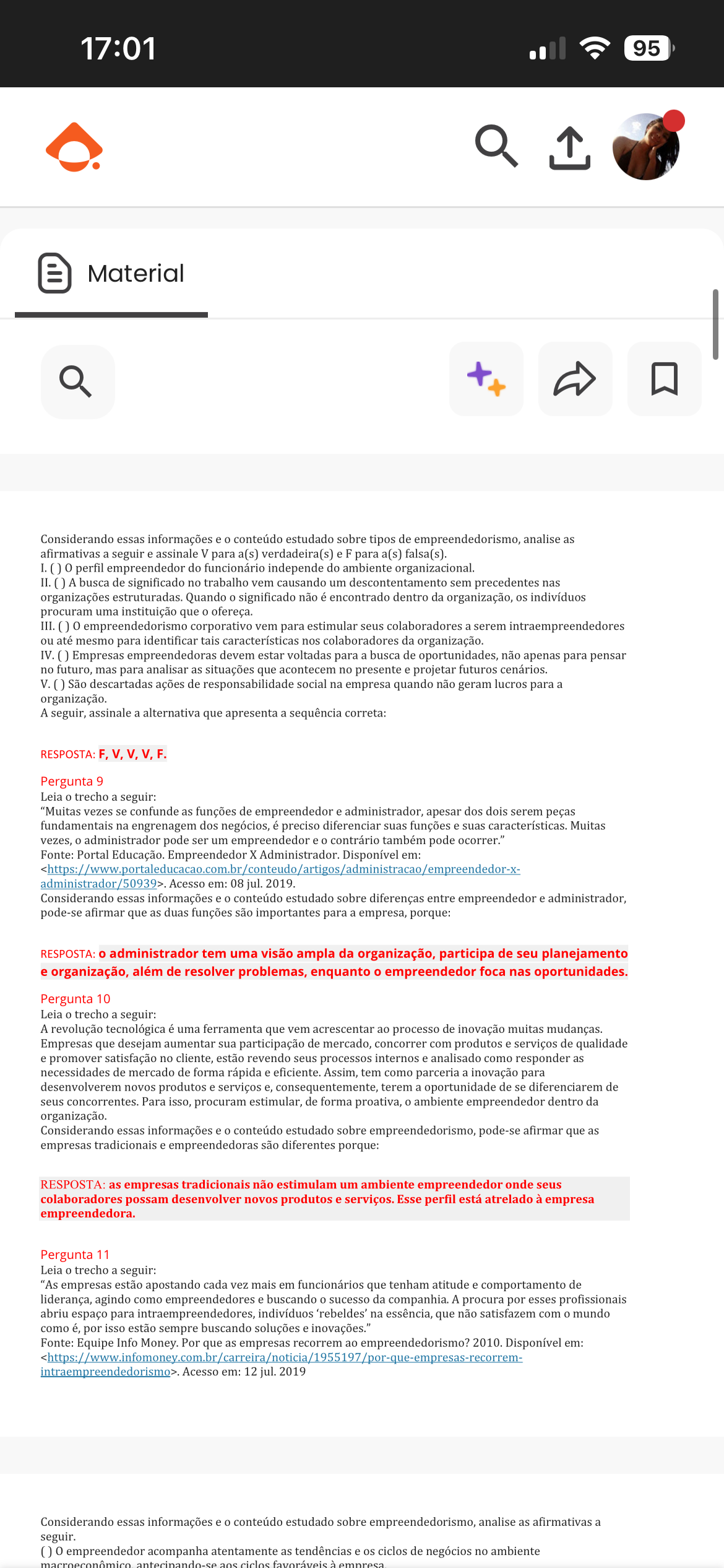 17:01 95 Material Considerando essas informações e conteúdo estudado sobre tipos de empreendedorismo, analise as afirmativas a seguir e assinale V para a(s) verdadeira(s) e F para a(s) falsa(s). I. () perfil empreendedor do funcionário independe do ambiente organizacional. II. A busca de significado no trabalho vem causando um descontentamento sem precedentes nas organizações estruturadas. Quando significado não é encontrado dentro da organização, os indivíduos procuram uma instituição que ofereça. III. empreendedorismo corporativo vem para estimular seus colaboradores a serem intraempreendedores ou até mesmo para identificar tais características nos colaboradores da organização. IV. () Empresas empreendedoras devem estar voltadas para a busca de oportunidades, não apenas para pensar no futuro, mas para analisar as situações que acontecem no presente e projetar futuros cenários. V. São descartadas ações de responsabilidade social na empresa quando não geram lucros para a organização. A seguir, assinale a alternativa que apresenta a sequência correta: RESPOSTA: F,V,V,V,F. Pergunta 9 Leia trecho a seguir: "Muitas vezes se confunde as funções de empreendedor e administrador, apesar dos dois serem peças fundamentais na engrenagem dos negócios, é preciso diferenciar suas funções e suas características. Muitas vezes, administrador pode ser um empreendedor e contrário também pode ocorrer." Fonte: Portal Educação. Empreendedor X Administrador. Disponível em: administrador/50939>. Acesso em: 08 jul. 2019. Considerando essas informações e 0 conteúdo estudado sobre diferenças entre empreendedor e administrador, pode-se afirmar que as duas funções são importantes para a empresa, porque: RESPOSTA: administrador tem uma visão ampla da organização, participa de seu planejamento e organização, além de resolver problemas, enquanto empreendedor foca nas oportunidades. Pergunta 10 Leia trecho a seguir: A revolução tecnológica é uma ferramenta que vem acrescentar ao processo de inovação muitas mudanças. Empresas que desejam aumentar sua participação de mercado, concorrer com produtos e serviços de qualidade e promover satisfação no cliente, estão revendo seus processos internos e analisado como responder as necessidades de mercado de forma rápida e eficiente. Assim, tem como parceria a inovação para desenvolverem novos produtos e serviços e, consequentemente, terem a oportunidade de se diferenciarem de seus concorrentes. Para isso, procuram estimular, de forma proativa, ambiente empreendedor dentro da organização. Considerando essas informações e conteúdo estudado sobre empreendedorismo, pode-se afirmar que as empresas tradicionais e empreendedoras são diferentes porque: RESPOSTA: as empresas tradicionais não estimulam um ambiente empreendedor onde seus colaboradores possam desenvolver novos produtos e serviços. Esse perfil está atrelado à empresa empreendedora. Pergunta 11 Leia trecho a seguir: "As empresas estão apostando cada vez mais em funcionários que tenham atitude e comportamento de liderança, agindo como empreendedores e buscando sucesso da companhia. A procura por esses profissionais abriu espaço para intraempreendedores, indivíduos 'rebeldes' na essência, que não satisfazem com mundo como é, por isso estão sempre buscando soluções e inovações." Fonte: Equipe Info Money. Por que as empresas recorrem ao empreendedorismo? 2010. Disponível em: . Acesso em: 12 jul. 2019 Considerando essas informações e conteúdo estudado sobre empreendedorismo, analise as afirmativas a seguir. () empreendedor acompanha atentamente as tendências e os ciclos de negócios no ambiente macroeconômico antecipando-se ciclos favoráveis empresa