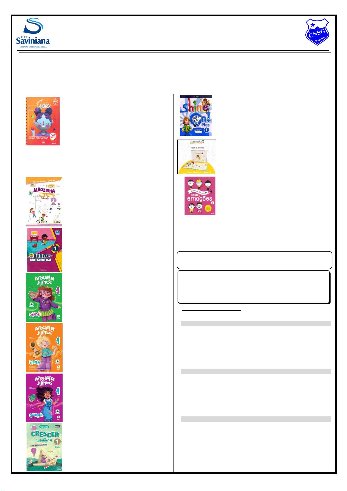 LITERATURA INFANTIL Obs.: Os livros de Literatura Infantil listados a seguir serão trabalhados em sistema de rodízio. Portanto, adquira somente os dois livros referentes à turma da sua criança. ANBEAS - Colégio Nossa Senhora das Graças Rua Pedro II, 1471 – Centro – Parnaíba-Pi – Cep: 64.200-420 Fone: (86) 3322–2750 / (86) 9-9929–1106 / E-mail: contato@cnsgparnaiba.com.br Consulte a relação com as capas no site: https://cnsgparnaiba.com.br RELAÇÃO DE LIVROS ADOTADOS PARA 2025 Ensino Fundamental – 1º Ano O INÍCIO DO ANO LETIVO SERÁ NO DIA: 23/01/2025 Horário de aulas: Manhã: 6h50 às 11h30 / Tarde: 12h50 às 17h30 Língua Portuguesa: Projeto Ápis – Língua Portuguesa Ensino Fundamental – (2º Ano) 4ª Edição Autoras: Ana Trinconi / Terezinha Bertin / Vera Marchezi Editora: Ática PARADIDÁTICO: ABC do trava-língua Autora: Rosinha Editora: Editora do Brasil Caligrafia: Essa mãozinha vai longe – 2º Ano Autoras: Thaynne Gabryelle – Vilza Carla Editora: Editora do Brasil Nova Edição 3º Ed. Reformulada - 2020 Matemática: Buriti Plus - Matemática / Volume 1 Autor: Edições Educativas da Editora Moderna Editora: Moderna Ciências: Aprender Juntos (1º Ano) Autores: Obra coletiva concebida, desenvolvida e produzida pela Editora SM Editora: SM – Edição 2024 História: Aprender Juntos – História Ensino Fundamental – 1 (1º Ano) Autoras: Mônica Lungov e Raquel dos Santos Funari Editora: SM – Edição 2024 Geografia: Aprender Juntos – Geografia Ensino Fundamental – 1 (1º Ano) Autores: Obra coletiva concebida, desenvolvida e produzida por SM Educação. Editora: SM – Edição 2024 Ensino Religioso: Crescer com Alegria e Fé – NOVA EDIÇÃO Anos iniciais - Vol. 1 Autoras: Ednilce Duran / Glair Arruda Editora: FTD – 3ª Edição 2024 Língua Inglesa: Shine On! Plus – 1 (Student book & extra practice) Autora: Susan Banman Sileci / Patrick Jackson Editora: Oxford Material de Robótica (ZOOM) Adquira o seu material através do Site: https://nossa-senhora-das-gracas-pi.carrinho.digital/home Mediante comprovante de pagamento, a entrega será feita na escola, a partir do mês de fevereiro. PROJETO: Cadernos das emoções - 1 Minhas emoções Autoras: Isabelle Filliozat / Virginie Limousin / Fred Veillé / Editora FTD (Prezados pais e responsáveis, gostaríamos de orientá-los sobre a aquisição do Caderno das Emoções para o próximo ano letivo. Informamos que os livros são consumíveis, ou seja, feitos para serem utilizados pelos alunos diretamente, incluindo atividades de escrita, recorte e colagem, entre outros, por esse motivo não recomendamos a compra de livros usados, pois isso pode comprometer o aproveitamento completo do material) Obs.: Em conformidade com a Lei 6.059/2011, não serão aceitos livros didáticos destinados ao professor. LIVROS PARADIDÁTICOS 1º A – MANHÃ • Breno esquentadinho Autora: Mailza de Fátima Barbosa - Ilustrações: Fábio Sgroi Editora: Editora do Brasil • O segredo da lagartixa Autores: Lecticia Dansa / Salmo Dansa - Ilustrador: Salmo Dansa / Editora: FTD 1º B – MANHÃ • A beija-flor e o girassol. Autora: Paula Valéria Andrade - Ilustrador: Luís San Vicente Editora: do Brasil • Folclorices de brincar Autora: Mércia Maria Leitão e Neide Duarte Editora: Editora do Brasil 1º C – MANHÃ • A velhinha que dava nome as coisas Autora: Cynthia Rylant / Tradutora: Gilda de Aquino / Ilustradora: Kathryn Brown / Editora: Brinque Book • Amanda no país das vitaminas Autor: Leonardo Mendes Cardoso Editora: Editora do Brasil http://www.cnsg-pi.com.br/ Observações: 1. Os livros e cadernos deverão ser encapados com plástico transparente e devidamente identificados com etiquetas contendo o nome completo, a série e a turma da sua criança. 2. O estojo com lápis, borracha, apontador, régua e lápis de cor, a criança trará sempre na bolsa. 3. Evite comprar estojo de metal ou outro material que chame a atenção da criança, pois eles provocam transtornos na hora dos trabalhos. O ideal é um estojo simples com zíper. Os lápis deverão ser simples. Se a opção for por grafite, sugerimos o de ponta 0,9 mm. 4. Uniforme: a) Bermuda de Oxford azul royal (uso diário); b) Tênis pretos (nem sapatos, nem botas); c) Meias brancas sem detalhes. Obs.: Os alunos que contrariam estas orientações criam problemas com a disciplina da Escola. 1º D – MANHÃ • A velha misteriosa Autora: Ana Maria Machado - Ilustrado por: Ionit Ziberman Editora: Salamandra • Enquanto seu lobo não vem (Coleção Mil e Uma Histórias) Autora: Telma Guimarães - Ilustração: Ina Carolina Editora: Editora do Brasil 1º E – TARDE • A primavera da lagarta Autora: Ruth Rocha Editora: Salamandra • Marcelo: de hora em hora Autora: Ruth Rocha Editora: Salamandra 1º F – TARDE • Uma joaninha diferente Autora: Regina Célia Melo – Ilustrações: Cristina Biazetto Editora: Paulinas • Os amigos do Marcelo Autora: Ruth Rocha - Ilustração: Alberto Llinares Editora: Salamandra MATERIAL INDIVIDUAL 01 garrafa tipo cantil (para água). 02 cadernos grandes capa dura 48 folhas sem espiral. 01 caderno de desenho grande (48 folhas). 03 revistas em quadrinhos (Turma da Mônica) para atividades de Língua Portuguesa. 01 Material Dourado (acoplado em caixa de madeira). 02 caixas de lápis de cor grande - conservar diariamente na mochila - para atividades artísticas. 01 tesoura sem ponta – para uso em atividades de recorte que desenvolva a coordenação motora. 01 marcador para retroprojetor – tinta permanente (preto) – para atividades artísticas e diárias. 01 régua de 15 cm (transparente sem detalhes) para atividades matemáticas, artísticas e diárias. 01 pasta fina tamanho ofício com elástico, para colecionar atividades fotocopiadas. 01 estojo de hidrocor fino (para atividades artísticas). 01 brinquedo didático da preferência da sua criança, para uso em atividades diversificadas. Sugestões: quebra-