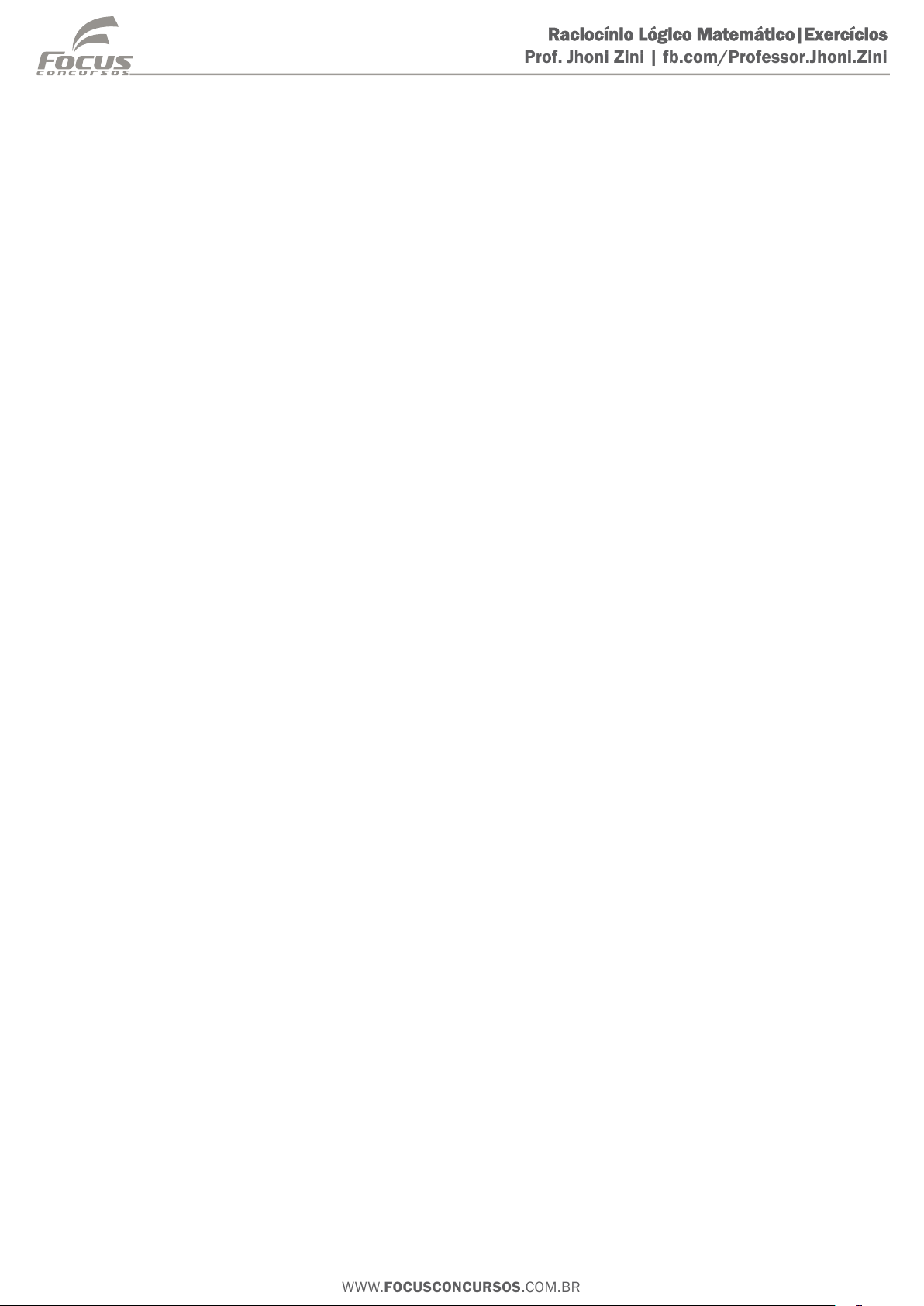 WWW.FOCUSCONCURSOS.COM.BR Raciocínio Lógico Matemático|Exercícios Prof. Jhoni Zini | fb.com/Professor.Jhoni.Zini 1 - FCC - AC TCE PR/TCE-PR/Jurídica/2011 Considere que as seguintes premissas são verdadeiras: I. Se um homem é prudente, então ele é competente. II. Se um homem não é prudente, então ele é ignorante. III. Se um homem é ignorante, então ele não tem esperanças. IV. Se um homem é competente, então ele não é violento. Para que se obtenha um argumento válido, é correto concluir que se um homem a) não é violento, então ele é prudente. b) não é competente, então ele é violento. c) é violento, então ele não tem esperanças. d) não é prudente, então ele é violento. e) não é violento, então ele não é competente. 2 - FCC - TJ TRT19/TRT 19/Administrativa/2014 Considere verdadeiras as afirmações: I. Se Ana for nomeada para um novo cargo, então Marina permanecerá em seu posto. II. Marina não permanecerá em seu posto ou Juliana será promovida. III. Se Juliana for promovida então Beatriz fará o concurso. IV. Beatriz não fez o concurso. A partir dessas informações, pode-se concluir corretamente que a) Beatriz foi nomeada para um novo cargo. b) Marina permanecerá em seu posto. c) Beatriz não será promovida. d) Ana não foi nomeada para um novo cargo. e) Juliana foi promovida. 3 - FCC - GP (SEAD PI)/SEAD PI/2013 Se é verdade que “nenhum maceronte é momorrengo” e “algum colemídeo é momorrengo”, então é necessariamente verdadeiro que a) algum colemídeo não é maceronte. b) algum colemídeo é maceronte. c) nenhum colemídeo é maceronte. d) nenhum maceronte é colemídeo. e) algum maceronte é colemídeo. 4 - CETRO - Bio (Campinas)/Pref Campinas/2013 Considere verdadeiras as premissas abaixo. I. Nenhum Agente de Saúde é responsável pelos testes de insumos. II. Alguns Biomédicos são responsáveis pelos testes de insumos. Então, é correto afirmar que a) nenhum Agente de Saúde é biomédico. b) alguns Agentes de Saúde são biomédicos. c) alguns Biomédicos não são Agentes de Saúde. d) nenhum Biomédico é agente de saúde. 5 - FCC - TJ TRF3/TRF 3/Administrativa/"Sem Especialidade"/2007 Rodolfo é mais alto que Guilherme, então Heloisa e Flávia têm a mesma altura. Se Heloisa e Flávia têm a mesma altura, então Alexandre é mais baixo que Guilherme. Se Alexandre é mais baixo que Guilherme, então Rodolfo é mais alto que Heloisa. Ora, Rodolfo não é mais alto que Heloisa. Logo: a) Rodolfo não é mais alto que Guilherme, e Heloisa e Flávia não têm a mesma altura. b) Rodolfo é mais alto que Guilherme, e Heloisa e Flávia têm a mesma altura. c) Rodolfo não é mais alto que Flávia, e Alexandre é mais baixo que Guilherme. d) Rodolfo e Alexandre são mais baixos que Guilherme. 1 WWW.FOCUSCONCURSOS.COM.BR Raciocínio Lógico Matemático|Exercícios Prof. Jhoni Zini | fb.com/Professor.Jhoni.Zini e) Rodolfo é mais alto que Guilherme, e Alexandre é mais baixo que Heloísa. 6 - FCC - AJ TRF3/TRF 3/Apoio Especializado/Arquivologia/2014 Diante, apenas, das premissas “Nenhum piloto é médico”, “Nenhum poeta é médico” e “Todos os astronautas são pilotos”, então é correto afirmar que a) algum astronauta é médico. b) todo poeta é astronauta. c) nenhum astronauta é médico. d) algum poeta não é astronauta. e) algum poeta é astronauta e algum piloto não é médico. 7 - FCC - TJ TRF4/TRF 4/Administrativa/"Sem Especialidade"/2014 Considere verdadeiras as afirmativas: Se não fui ao mercado, então não fiz compras. Comprei creme e sabonete. Ou comprei queijo ou comprei iogurte. Comprei cereal ou comprei pão. A partir dessas afirmações, pode-se concluir que a) não fui ao mercado. b) só comprei creme. c) fui ao mercado e comprei sabonete. d) não comprei nem queijo nem iogurte. e) não comprei cereal nem pão. 8 - CETRO - AFTM (Campinas)/Pref Campinas/2011 Considere as seguintes premissas: P1: Os peregrinos são americanos. P2: Pessoas americanas são jovens. P3: Quem sabe nadar não é jovem. Assinale a alternativa que não apresenta uma consequência lógica das três premissas apresentadas. a) Os peregrinos não sabem nadar. b) Pessoas jovens não sabem nadar. c) Americanos não sabem nadar. d) Pessoas jovens são americanas. e) Os peregrinos são jovens. 9 - FCC - AJ TRT8/TRT 8/Judiciária/"Sem Especialidade"/2010 Se Alceu tira férias, então Brenda fica trabalhando. Se Brenda fica trabalhando, então Clóvis chega mais tarde ao trabalho. Se Clóvis chega mais tarde ao trabalho, então Dalva falta ao trabalho. Sabendo-se que Dalva não faltou ao trabalho, é correto concluir que a) Alceu não tira férias e Clóvis chega mais tarde ao trabalho. b) Brenda não fica trabalhando e Clóvis chega mais tarde ao trabalho. c) Clóvis não chega mais tarde ao trabalho e Alceu não tira férias. d) Brenda fica trabalhando e Clóvis chega mais tarde ao trabalho. e) Alceu tira férias e Brenda fica trabalhando. 10 - ESAF - AFC (CGU)/CGU/2001 Se Vera viajou, nem Camile nem Carla foram ao casamento. Se Carla não foi ao casamento, Vanderléia viajou. Se Vanderléia viajou, o navio afundou. Ora, o navio não afundou. Logo, a) Vera não viajou e Carla não foi ao casa-mento 2 WWW.FOCUSCONCURSOS.COM.BR Raciocínio Lógico Matemático|Exercícios Prof. Jhoni Zini | fb.com/Professor.Jhoni.Zini b) Camile e Carla não foram ao casamento c) Carla não foi ao casamento e Vanderléia não viajou d) Carla não foi ao casamento ou Vanderléia viajou e) Vera e Vanderléia não viajaram 11 - ESAF - AFRFB/SRFB/2014 Se é verdade que alguns adultos são felizes e que nenhum aluno de matemática é feliz, então é necessariamente verdade que: a) algum adulto é aluno de matemática. b) nenhum adulto é aluno de matemática. c) algum adulto não é aluno de matemática. d) algum aluno de matemática é adulto. e) nenhum aluno de matemática é adulto. 12 - FCC - Ana Proc (PGE BA)/PGE BA/Administrativo/2013 Se Marcus