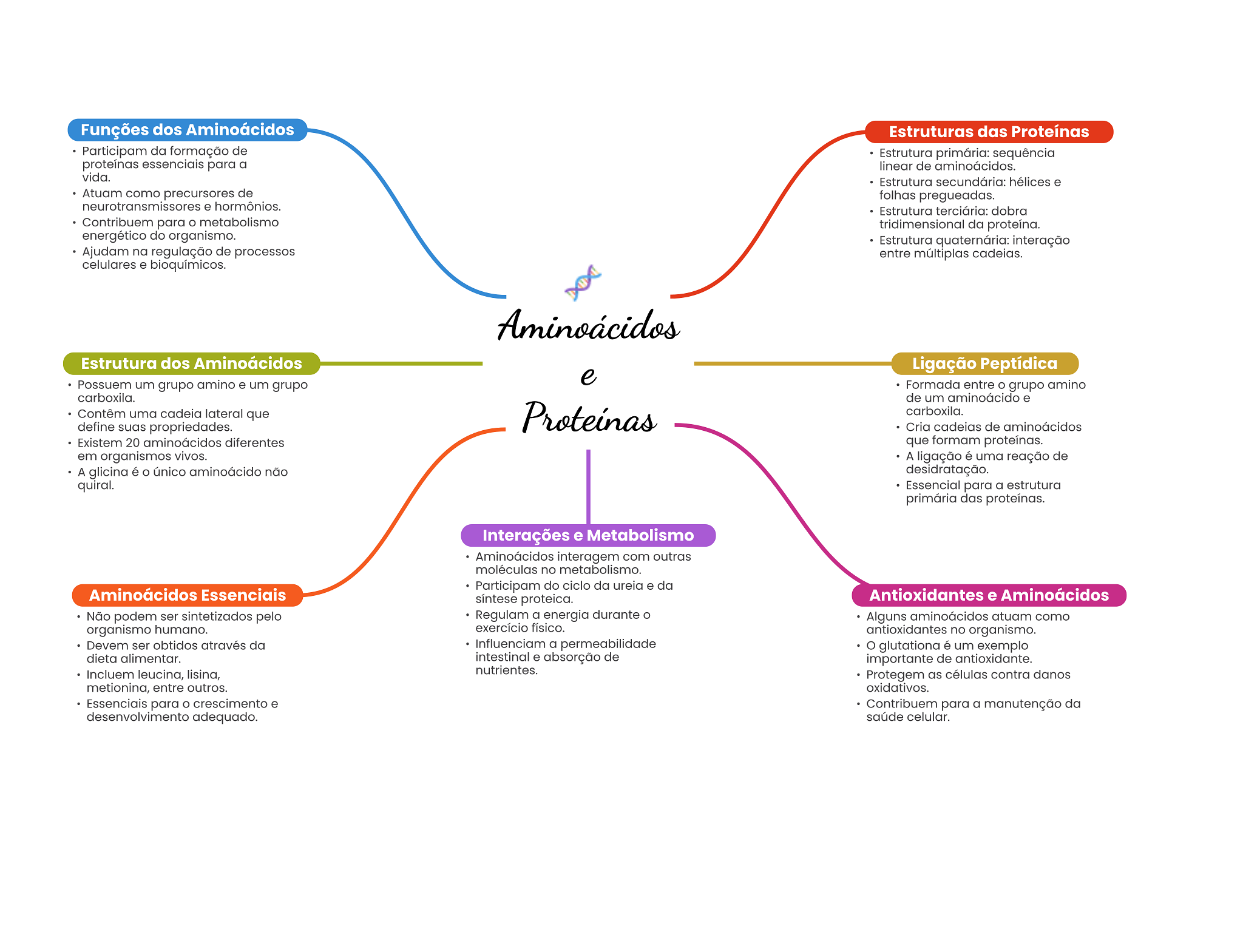Funções dos Aminoácidos Estruturas das Proteínas Participam da formação de Estrutura primária: sequência proteínas essenciais para a linear de aminoácidos. vida. Estrutura secundária: hélices e Atuam como precursores de folhas pregueadas. e hormônios. Estrutura terciária: dobra Contribuem para metabolismo tridimensional da proteína. energético do organismo. Estrutura quaternária: interação Ajudam na regulação de processos entre múltiplas cadeias. celulares e bioquímicos. Aminoácidos Estrutura dos Aminoácidos Ligação Peptídica e Possuem um grupo amino e um grupo Formada entre grupo amino carboxila. de um aminoácido e Contêm uma cadeia lateral que Proteínas carboxila. define suas propriedades. Cria cadeias de aminoácidos Existem 20 aminoácidos diferentes que formam proteínas. em organismos vivos. A ligação é uma reação de A glicina é único aminoácido não desidratação. quiral. Essencial para a estrutura primária das proteínas. Interações e Metabolismo Aminoácidos interagem com outras moléculas no metabolismo. Participam do ciclo da ureia e da Aminoácidos Essenciais síntese proteica. Antioxidantes e Aminoácidos Não podem ser sintetizados pelo Regulam a energia durante O Alguns aminoácidos atuam como organismo humano. exercício físico. antioxidantes no organismo. Devem ser obtidos através da Influenciam a permeabilidade glutationa é um exemplo dieta alimentar. intestinal e absorção de importante de antioxidante. Incluem leucina, lisina, nutrientes. Protegem as células contra danos metionina, entre outros. oxidativos. Essenciais para crescimento e Contribuem para a manutenção da desenvolvimento adequado. saúde celular.