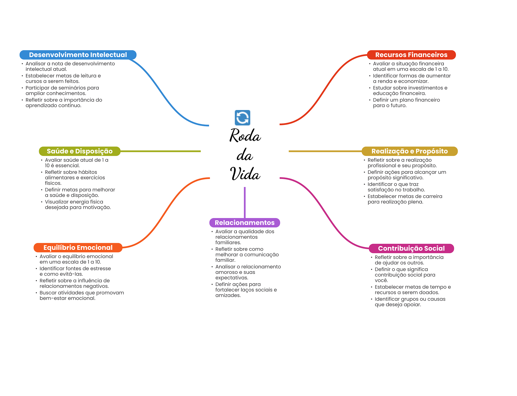 Desenvolvimento Intelectual Recursos Financeiros Analisar a nota de desenvolvimento Avaliar a situação financeira intelectual atual. atual em uma escala de 1 a 10. Estabelecer metas de leitura e Identificar formas de aumentar cursos a serem feitos. a renda e economizar. Participar de seminários para Estudar sobre investimentos e ampliar conhecimentos. educação financeira. Refletir sobre a importância do Definir um plano financeiro aprendizado contínuo. para futuro. Roda Saúde e Disposição da Realização e Propósito Avaliar saúde atual de 1 a Refletir sobre a realização 10 é essencial. profissional e seu propósito. Refletir sobre hábitos Vida Definir ações para alcançar um alimentares e exercícios propósito significativo. físicos. Identificar que traz Definir metas para melhorar satisfação no trabalho. a saúde e disposição. Estabelecer metas de carreira Visualizar energia física para realização plena. desejada para motivação. Relacionamentos Avaliar a qualidade dos relacionamentos familiares. Equilíbrio Emocional Refletir sobre como Contribuição Social Avaliar equilíbrio emocional melhorar a comunicação em uma escala de 1 a 10. familiar. Refletir sobre a importância de ajudar outros. Identificar fontes de estresse Analisar O relacionamento Definir O que significa e como evitá-las. amoroso e suas Refletir sobre a influência de expectativas. contribuição social para você. relacionamentos negativos. Definir ações para fortalecer laços sociais e Estabelecer metas de tempo e Buscar atividades que promovam recursos a serem doados. amizades. bem-estar emocional. Identificar grupos ou causas que deseja apoiar.