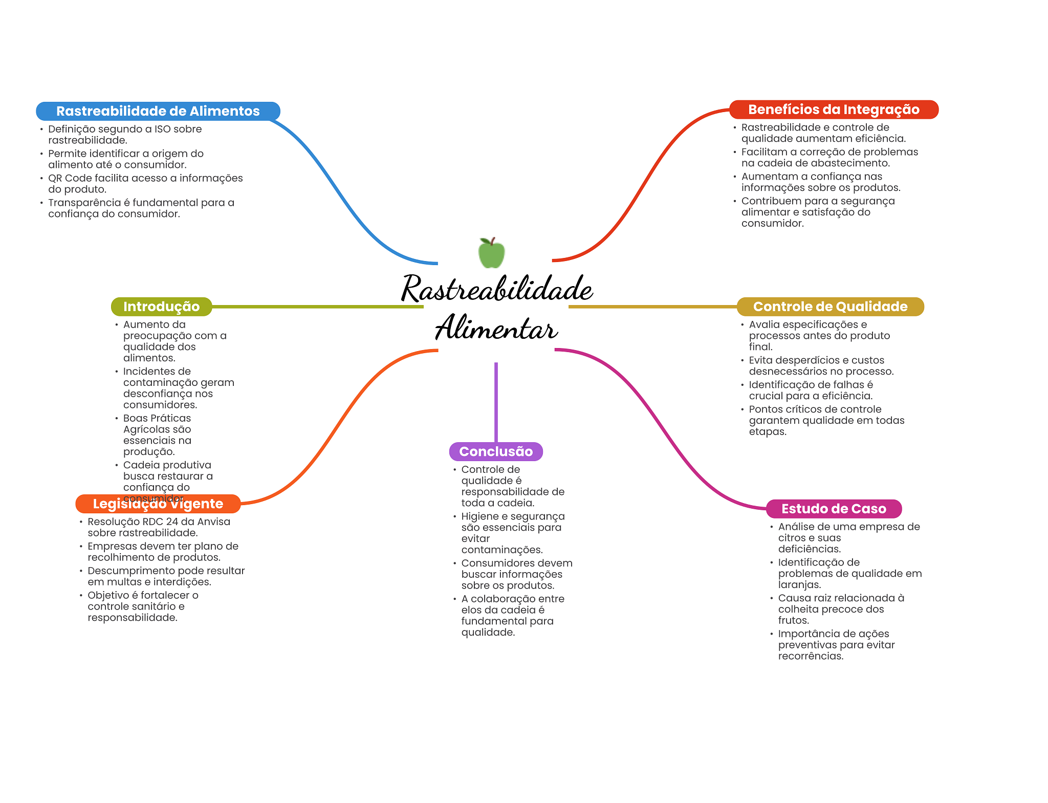 Rastreabilidade de Alimentos Benefícios da Integração Definição segundo a ISO sobre Rastreabilidade e controle de rastreabilidade. qualidade aumentam eficiência. Permite identificar a origem do Facilitam a correção de problemas alimento até consumidor. na cadeia de abastecimento. QR Code facilita acesso a informações Aumentam a confiança nas do produto. informações sobre produtos. Transparência é fundamental para a Contribuem para a segurança confiança do consumidor. alimentar e satisfação do consumidor. Rastreabilidade Introdução Controle de Qualidade Aumento da preocupação com a Alimentar Avalia especificações e processos antes do produto qualidade dos final. alimentos. Evita desperdícios e custos Incidentes de desnecessários no processo. contaminação geram Identificação de falhas é desconfiança nos crucial para a eficiência. consumidores. Pontos críticos de controle Boas Práticas garantem qualidade em todas Agrícolas são etapas. essenciais na produção. Conclusão Cadeia produtiva Controle de busca restaurar a qualidade é confiança do responsabilidade de Legislação Vigente toda a cadeia. Estudo de Caso Resolução RDC 24 da Anvisa Higiene e segurança sobre rastreabilidade. são essenciais para Análise de uma empresa de evitar citros e suas Empresas devem ter plano de contaminações. deficiências. recolhimento de produtos. Consumidores devem Identificação de Descumprimento pode resultar buscar informações problemas de qualidade em em multas e interdições. sobre OS produtos. laranjas. Objetivo é fortalecer A colaboração entre Causa raiz relacionada à controle sanitário e elos da cadeia é colheita precoce dos responsabilidade. fundamental para frutos. qualidade. Importância de ações preventivas para evitar recorrências.