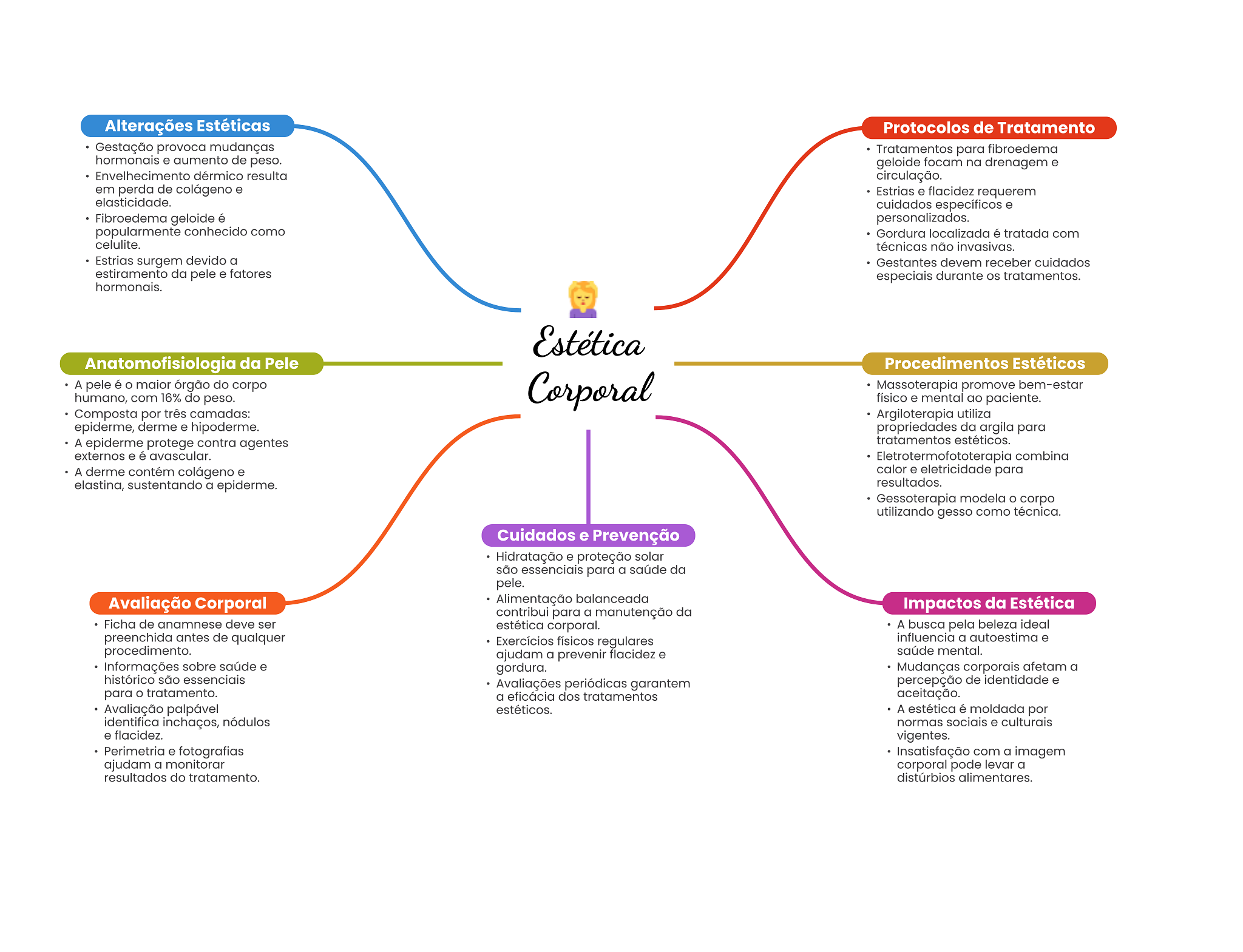 Alterações Estéticas Protocolos de Tratamento Gestação provoca mudanças Tratamentos para fibroedema hormonais e aumento de peso. geloide focam na drenagem e Envelhecimento dérmico resulta circulação. em perda de colágeno e Estrias e flacidez requerem elasticidade. cuidados específicos e Fibroedema geloide é personalizados. popularmente conhecido como Gordura localizada é tratada com celulite. técnicas não invasivas. Estrias surgem devido a Gestantes devem receber cuidados estiramento da pele e fatores especiais durante tratamentos. hormonais. Estética Anatomofisiologia da Pele Procedimentos Estéticos A pele é O maior órgão do corpo humano, com 16% do peso. Corporal Massoterapia promove bem-estar físico e mental ao paciente. Composta por três camadas: Argiloterapia utiliza epiderme, derme e hipoderme. propriedades da argila para A epiderme protege contra agentes tratamentos estéticos. externos e é avascular. Eletrotermofototerapia combina A derme contém colágeno e calor e eletricidade para elastina, sustentando a epiderme. resultados. Gessoterapia modela O corpo utilizando gesso como técnica. Cuidados e Prevenção Hidratação e proteção solar são essenciais para a saúde da pele. Avaliação Corporal Alimentação balanceada Impactos da Estética contribui para a manutenção da Ficha de anamnese deve ser estética corporal. A busca pela beleza ideal preenchida antes de qualquer Exercícios físicos regulares influencia a autoestima e procedimento. ajudam a prevenir flacidez e saúde mental. Informações sobre saúde e gordura. Mudanças corporais afetam a histórico são essenciais Avaliações periódicas garantem percepção de identidade e para tratamento. a eficácia dos tratamentos aceitação. Avaliação palpável estéticos. A estética é moldada por identifica inchaços, nódulos normas sociais e culturais e flacidez. vigentes. Perimetria e fotografias Insatisfação com a imagem ajudam a monitorar corporal pode levar a resultados do tratamento. distúrbios alimentares.