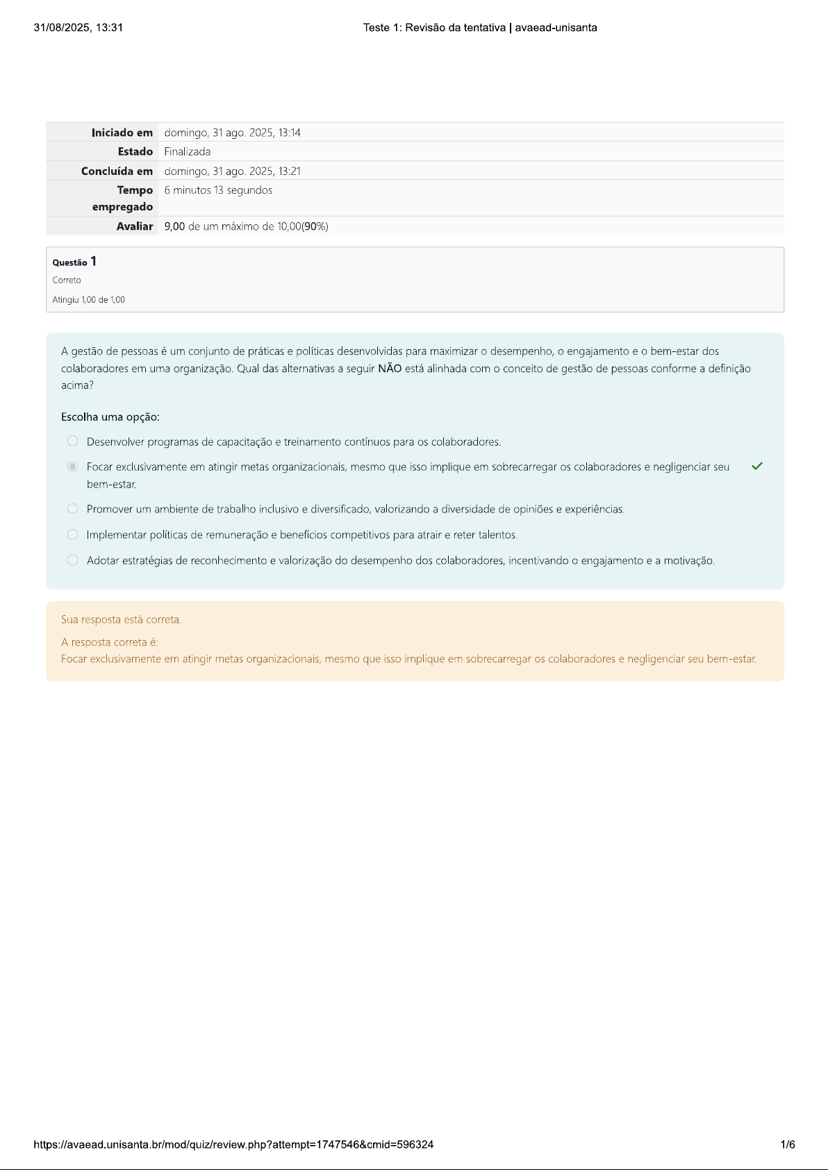31/08/2025, 13:31 Teste 1: Revisão da tentativa avaead-unisanta Iniciado em domingo, 31 ago. 2025, 13:14 Estado Finalizada Concluída em domingo, 31 ago. 2025, 13:21 Tempo 6 minutos 13 segundos empregado Avaliar 9,00 de um máximo de 10,00(90%) Questão 1 Correto Atingiu 1,00 de 1,00 A gestão de pessoas é um conjunto de práticas e políticas desenvolvidas para maximizar desempenho, engajamento e bem-estar dos colaboradores em uma organização. Qual das alternativas a seguir NÃO está alinhada com conceito de gestão de pessoas conforme a definição acima? Escolha uma opção: Desenvolver programas de capacitação e treinamento contínuos para os colaboradores. Focar exclusivamente em atingir metas organizacionais, mesmo que isso implique em sobrecarregar os colaboradores e negligenciar seu bem-estar. Promover um ambiente de trabalho inclusivo e diversificado, valorizando a diversidade de opiniões e experiências. Implementar políticas de remuneração e benefícios competitivos para atrair e reter talentos. Adotar estratégias de reconhecimento e valorização do desempenho dos colaboradores, incentivando engajamento e a motivação. Sua resposta está correta. A resposta correta é: Focar exclusivamente em atingir metas organizacionais, mesmo que isso implique em sobrecarregar colaboradores e negligenciar seu bem-estar. 1/631/08/2025, 13:31 Teste 1: Revisão da tentativa avaead-unisanta Questão 2 Correto Atingiu 1,00 de 1,00 No contexto profissional, as soft skills e hard skills são ambas essenciais para sucesso no trabalho. Qual das alternativas a seguir descreve corretamente a diferença entre essas duas categorias de competências? Escolha uma opção: Hard skills são competências técnicas e específicas de uma profissão, enquanto soft skills são habilidades interpessoais e comportamentais. Soft skills são competências relacionadas ao uso de tecnologias e ferramentas específicas, enquanto hard skills são relacionadas à comunicação e liderança. Soft skills são competências técnicas específicas de uma profissão, enquanto hard skills são habilidades interpessoais e sociais. Soft skills e hard skills são sinônimos e podem ser usadas de forma intercambiável no contexto profissional. Hard skills são competências adquiridas através da experiência de vida, enquanto soft skills são desenvolvidas exclusivamente através de cursos e treinamentos. Sua resposta está correta. A resposta correta é: Hard skills são competências técnicas e específicas de uma profissão, enquanto soft skills são habilidades interpessoais e comportamentais. Questão 3 Correto Atingiu 1,00 de 1,00 No contexto da gestão de pessoas, desenvolvimento de competências é essencial para garantir que os colaboradores estejam preparados para contribuir efetivamente para os objetivos organizacionais. Qual das alternativas abaixo descreve melhor uma prática eficaz de desenvolvimento de competências? Escolha uma opção: Substituir funcionários que não possuem as competências necessárias por novos colaboradores que já possuem essas competências, em vez de investir em seu desenvolvimento. Realizar avaliações periódicas de desempenho e fornecer feedback construtivo, alinhado a programas de desenvolvimento individualizados que considerem as aspirações de carreira dos funcionários. Investir em programas de desenvolvimento apenas para cargos de liderança, pois são eles que tomam as principais decisões na organização. Oferecer treinamentos obrigatórios e padronizados para todos os funcionários, independentemente de suas funções ou necessidades individuais. Focar exclusivamente no desenvolvimento de competências técnicas, pois são as mais importantes para a realização das tarefas diárias. Sua resposta está correta. A resposta correta é: Realizar avaliações periódicas de desempenho e fornecer feedback construtivo, alinhado a programas de desenvolvimento individualizados que considerem as aspirações de carreira dos funcionários. 2/631/08/2025, 13:31 Teste 1: Revisão da tentativa avaead-unisanta Questão 4 Incorreto Atingiu 0,00 de 1,00 Considere as afirmações abaixo: Conteúdo do cargo é um conjunto de tarefas ou atribuições que ocupante deve desempenhar. II. Métodos e processos de trabalho é como as tarefas ou atribuições devem ser desempenhadas. III. Responsabilidade quem ocupante do cargo deve supervisionar ou dirigir, isto é, quem são seus subordinados ou as pessoas que dele dependem para trabalhar. IV. Autoridade: a quem ocupante do cargo deve se reportar, isto é, quem é seu superior imediato. Assinale a alternativa correta: Escolha uma opção: Todas as afirmações são verdadeiras. Somente as afirmações II, III e IV são verdadeiras. Somente as afirmações e são verdadeiras. Somente as afirmações I, e III são verdadeiras. Somente as afirmações e IV são verdadeiras. Sua resposta está incorreta. A resposta correta é: Somente as afirmações e são verdadeiras. Questão 5 Correto Atingiu 1,00 de 1,00 Considere que você é gerente de uma empresa que está planejando lançar um novo produto no mercado. Durante processo de planejamento, você identifica vários stakeholders que podem influenciar ou ser impactados pelo lançamento do produto. Com base na teoria dos stakeholders, qual das seguintes ações é mais apropriada para garantir uma gestão eficaz dos interesses desses grupos? Escolha uma opção: Concentrar esforços de engajamento nos fornecedores, garantindo que eles estejam prontos para atender à demanda do novo produto. Realizar uma análise detalhada das necessidades e expectativas de todos os grupos de stakeholders, e integrar essas informações no processo de tomada de decisão. Estabelecer uma política de comunicação interna rigorosa, voltada somente para os funcionários, para assegurar que todos estejam cientes das mudanças. Desenvolver uma campanha de marketing direcionada apenas aos clientes potenciais