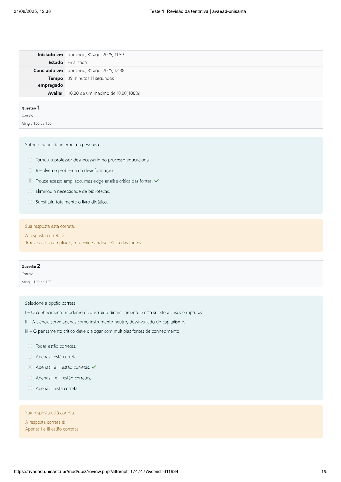 31/08/2025, 12:38 Teste 1: Revisão da tentativa avaead-unisanta Iniciado em domingo, 31 ago. 2025, 11:59 Estado Finalizada Concluída em domingo, 31 ago. 2025, 12:38 Tempo 39 minutos 11 segundos empregado Avaliar 10,00 de um máximo de 10,00(100%) Questão 1 Correto Atingiu 1,00 de 1,00 Sobre papel da internet na pesquisa: Tornou professor desnecessário no processo educacional. Resolveu problema da desinformação. Trouxe acesso ampliado, mas exige análise crítica das fontes. Eliminou a necessidade de bibliotecas. Substituiu totalmente livro didático. Sua resposta está correta. A resposta correta é: Trouxe acesso ampliado, mas exige análise crítica das fontes. Questão 2 Correto Atingiu 1,00 de 1,00 Selecione a opção correta: conhecimento moderno é construído dinamicamente e está sujeito a crises e rupturas. - A ciência serve apenas como instrumento neutro, desvinculado do capitalismo. III pensamento crítico deve dialogar com múltiplas fontes de conhecimento. Todas estão corretas. Apenas está correta. Apenas e III estão corretas. Apenas II e III estão corretas. Apenas está correta. Sua resposta está correta. A resposta correta é: Apenas le III estão corretas. 1/531/08/2025, 12:38 Teste 1: Revisão da tentativa avaead-unisanta Questão 3 Correto Atingiu 1,00 de 1,00 Segundo Silvia Federici, a exclusão das mulheres do saber científico na Idade Moderna deu-se porque: Seus conhecimentos de cuidado e cura foram deslegitimados em nome do capitalismo e patriarcado. As mulheres recusavam-se a aprender ciências. Os mosteiros eram exclusivos para homens por escolha feminina. conhecimento feminino era irrelevante para a sociedade. A medicina nunca teve contribuição de mulheres. Sua resposta está correta. A resposta correta é: Seus conhecimentos de cuidado e cura foram deslegitimados em nome do capitalismo e patriarcado. Questão 4 Correto Atingiu 1,00 de 1,00 paradoxo da tolerância, de Karl Popper, significa que: A democracia deve aceitar qualquer tipo de discurso, mesmo os que pregam violência. A tolerância ilimitada leva ao desaparecimento da própria tolerância. Estado nunca deve intervir frente a movimentos intolerantes. É preciso abolir a liberdade de expressão para preservar a democracia. Todos os discursos intolerantes devem ser aceitos sem contestação. Sua resposta está correta. A resposta correta é: A tolerância ilimitada leva ao desaparecimento da própria tolerância. 2/531/08/2025, 12:38 Teste 1: Revisão da tentativa avaead-unisanta Questão 5 Correto Atingiu 1,00 de 1,00 Assinale a alternativa correta a partir das assertivas abaixo: conhecimento sempre foi produzido de forma neutra e livre de poder. Os arquivos centrais do Estado (Europa) foram instrumentos de controle e exclusão. III A interdisciplinaridade ajuda a superar exclusões epistemológicas. Todas estão corretas. Apenas II e III estão corretas. Apenas está correta. Apenas III está correta. Apenas e estão corretas. Sua resposta está correta. A resposta correta é: Apenas e III estão corretas. Questão 6 Correto Atingiu 1,00 de 1,00 Um dos impactos mais relevantes da Revolução Científica e do sobre as universidades foi: Rejeitarem totalmente a aplicação prática da ciência. Tornarem-se instituições produtoras de pesquisa original, não apenas reprodutoras de tradição. Manterem papel passivo de conservar conhecimentos antigos. Abandonarem a experimentação sistemática. Permanecerem exclusivamente ligadas à teologia medieval. Sua resposta está correta. A resposta correta é: Tornarem-se instituições produtoras de pesquisa original, não apenas reprodutoras de tradição. 3/531/08/2025, 12:38 Teste 1: Revisão da tentativa avaead-unisanta Questão 7 Correto Atingiu 1,00 de 1,00 Para John Dewey, Paulo Freire e bell hooks, pensamento crítico está relacionado principalmente: À neutralidade absoluta da ciência. Ao dogmatismo religioso. Ao treinamento técnico isolado. Ao simples acúmulo de informações. À cidadania e emancipação por meio da educação. Sua resposta está correta. A resposta correta é: À cidadania e emancipação por meio da educação. Questão 8 Correto Atingiu 1,00 de 1,00 No uso pedagógico da internet, segundo Ramos e Copolla (2009): professor deve orientar criticamente, pois perdeu monopólio do "conteúdo de referência". A internet substituiu integralmente a didática presencial. A pesquisa online elimina a necessidade de avaliação crítica. livro didático passou a ser inútil. aluno sempre encontrará informações confiáveis. Sua resposta está correta. A resposta correta é: professor deve orientar criticamente, pois perdeu monopólio do "conteúdo de referência". 4/531/08/2025, 12:38 Teste 1: Revisão da tentativa avaead-unisanta Questão 9 Correto Atingiu 1,00 de 1,00 Assinale V (verdadeiro) ou F (falso): Sobre pensamento crítico: () Desenvolveu-se também na academia norte-americana como resposta à insuficiência da lógica formal. Trabalha com falácias e análise de cotidianos como publicidades e discursos. Se limita a debates teológicos e metafísicos. Tem foco em habilidades cognitivas e revisão de ideias. F-V-V-F V-V-V-V V-F-V-V V-V-F-V Sua resposta está correta. A resposta correta é: V-V-F-V Questão 10 Correto Atingiu 1,00 de 1,00 Segundo Silvia Federici, as caças às bruxas devem ser entendidas como: Meras superstições sem relação com capitalismo ou patriarcado. Resultado direto das ciências iluministas. Um movimento de reconhecimento da autonomia feminina. Um processo de controle político-social, com eliminação dos saberes femininos ligados à cura. Exemplo da inclusão das mulheres na ciência. Sua resposta está correta. A resposta correta é: Um processo de controle político-social, com eliminação dos saberes femininos ligados à cura. 5/5