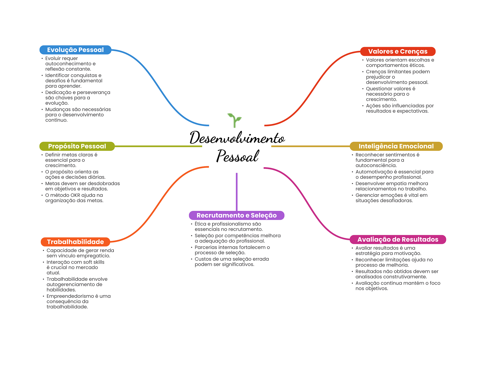 Evolução Pessoal Valores e Crenças Evoluir requer Valores orientam escolhas e autoconhecimento e comportamentos éticos. reflexão constante. Crenças limitantes podem Identificar conquistas e prejudicar desafios é fundamental desenvolvimento pessoal. para aprender. Questionar valores é Dedicação e perseverança necessário para são chaves para a crescimento. evolução. Ações são influenciadas por Mudanças são necessárias resultados e expectativas. para O desenvolvimento contínuo. Desenvolvimento Propósito Pessoal Inteligência Emocional Definir metas claras é Pessoal Reconhecer sentimentos é essencial para O fundamental para a crescimento. autoconsciência. propósito orienta as Automotivação é essencial para ações e decisões diárias. desempenho profissional. Metas devem ser desdobradas Desenvolver empatia melhora em objetivos e resultados. relacionamentos no trabalho. método OKR ajuda na Gerenciar emoções é vital em organização das metas. situações desafiadoras. Recrutamento e Seleção Ética e profissionalismo são essenciais no recrutamento. Seleção por competências melhora Trabalhabilidade a adequação do profissional. Avaliação de Resultados Parcerias internas fortalecem O Avaliar resultados é uma Capacidade de gerar renda processo de seleção. sem vínculo estratégia para motivação. Custos de uma seleção errada Interação com soft skills Reconhecer limitações ajuda no é crucial no mercado podem ser significativos. processo de melhoria. atual. Resultados não obtidos devem ser Trabalhabilidade envolve analisados construtivamente. autogerenciamento de Avaliação contínua mantém foco habilidades. nos objetivos. Empreendedorismo é uma consequência da trabalhabilidade.