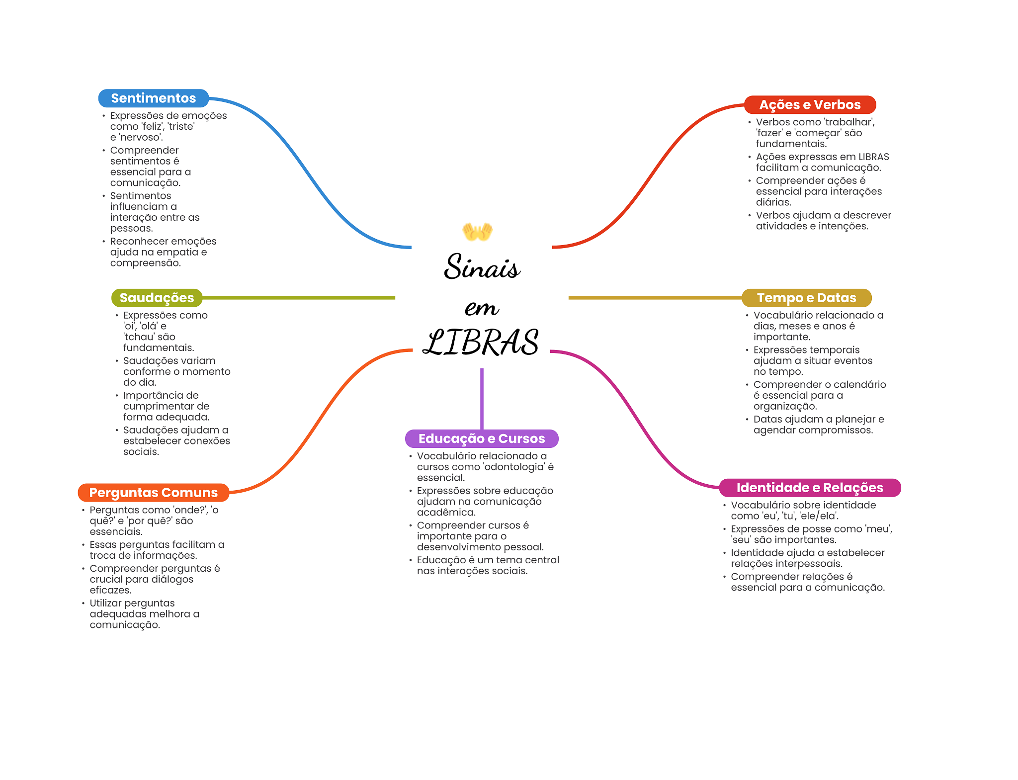 Sentimentos Ações e Verbos Expressões de emoções como 'feliz', 'triste' Verbos como 'trabalhar', e 'nervoso'. 'fazer' e 'começar' são fundamentais. Compreender sentimentos é Ações expressas em LIBRAS essencial para a facilitam a comunicação. comunicação. Compreender ações é Sentimentos essencial para interações influenciam a diárias. interação entre as Verbos ajudam a descrever pessoas. atividades e intenções. Reconhecer emoções ajuda na empatia e compreensão. Sinais Saudações Tempo e Datas em Expressões como Vocabulário relacionado a 'oi', 'olá' e dias, meses e anos é 'tchau' são fundamentais. LIBRAS importante. Expressões temporais Saudações variam ajudam a situar eventos conforme momento no tempo. do dia. Compreender O calendário Importância de é essencial para a cumprimentar de organização. forma adequada. Datas ajudam a planejar e Saudações ajudam a agendar compromissos. estabelecer conexões Educação e Cursos sociais. Vocabulário relacionado a cursos como 'odontologia' é essencial. Perguntas Comuns Expressões sobre educação Identidade e Relações ajudam na comunicação Vocabulário sobre identidade Perguntas como 'onde?', 'o acadêmica. e quê?' são como 'eu', 'tu', Compreender cursos é essenciais. Expressões de posse como 'meu', importante para Essas perguntas facilitam a 'seu' são importantes. desenvolvimento pessoal. troca de informações. Identidade ajuda a estabelecer Educação é um tema central Compreender perguntas é relações interpessoais. nas interações sociais. crucial para diálogos Compreender relações é eficazes. essencial para a comunicação. Utilizar perguntas adequadas melhora a comunicação.