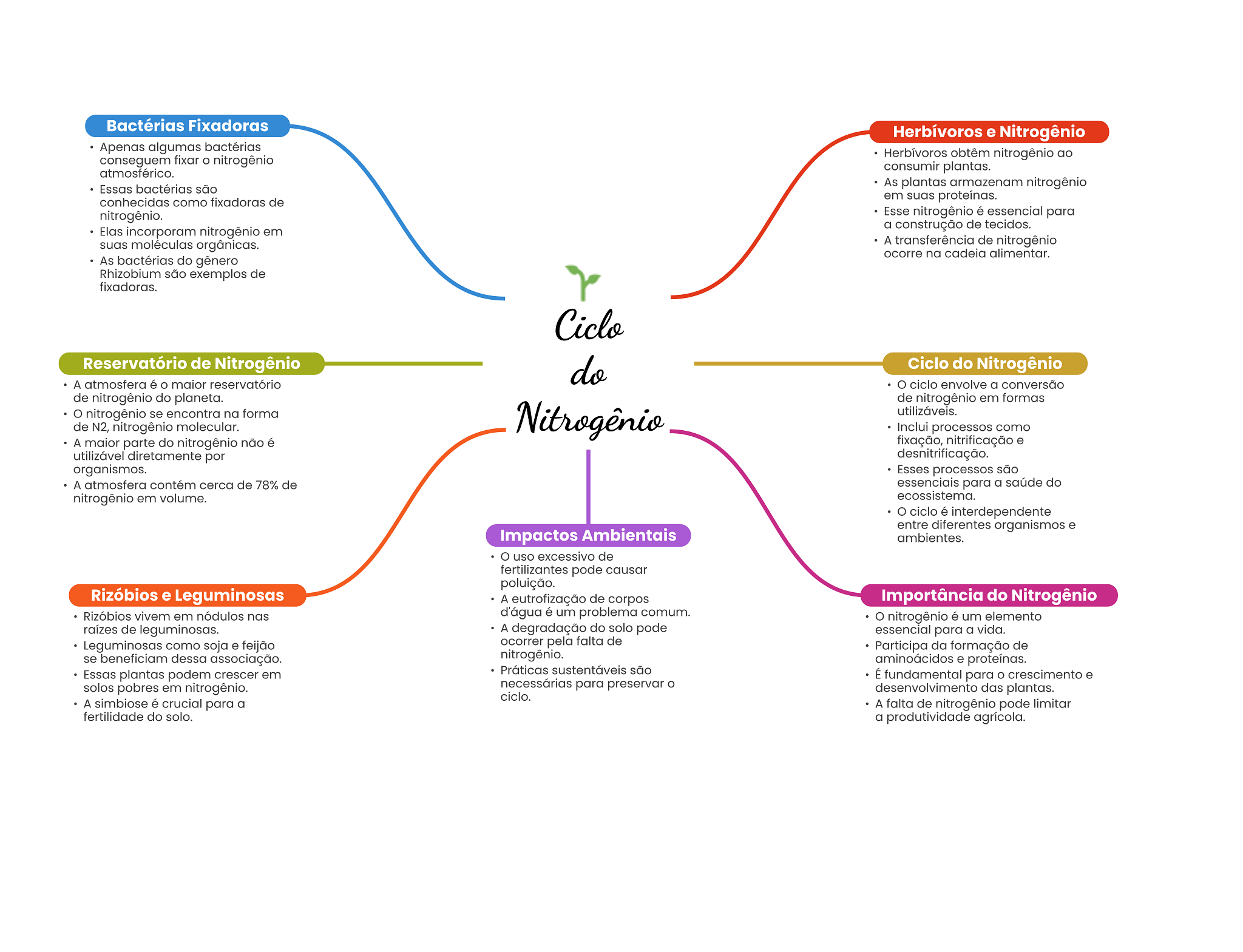 Bactérias Fixadoras Herbívoros e Nitrogênio Apenas algumas bactérias conseguem fixar nitrogênio Herbívoros obtêm nitrogênio ao atmosférico. consumir plantas. Essas bactérias são As plantas armazenam nitrogênio conhecidas como fixadoras de em suas proteínas. nitrogênio. Esse nitrogênio é essencial para Elas incorporam nitrogênio em a construção de tecidos. suas moléculas orgânicas. A transferência de nitrogênio ocorre na cadeia alimentar. As bactérias do gênero Rhizobium são exemplos de fixadoras. Ciclo Reservatório de Nitrogênio do Ciclo do Nitrogênio A atmosfera é maior reservatório ciclo envolve a conversão de nitrogênio do planeta. de nitrogênio em formas nitrogênio se encontra na forma de N2, nitrogênio molecular. Nitrogênio utilizáveis. Inclui processos como A maior parte do nitrogênio não é fixação, nitrificação e utilizável diretamente por desnitrificação. organismos. Esses processos são A atmosfera contém cerca de 78% de essenciais para a saúde do nitrogênio em volume. ecossistema. ciclo é interdependente entre diferentes organismos e Impactos Ambientais ambientes. uso excessivo de fertilizantes pode causar poluição. Rizóbios e Leguminosas A eutrofização de corpos Importância do Nitrogênio Rizóbios vivem em nódulos nas d'água é um problema comum. nitrogênio é um elemento raízes de leguminosas. A degradação do solo pode essencial para a vida. Leguminosas como soja e feijão ocorrer pela falta de Participa da formação de se beneficiam dessa associação. nitrogênio. aminoácidos e proteínas. Essas plantas podem crescer em Práticas sustentáveis são É fundamental para crescimento e solos pobres em nitrogênio. necessárias para preservar desenvolvimento das plantas. ciclo. A simbiose é crucial para a A falta de nitrogênio pode limitar fertilidade do solo. a produtividade agrícola.