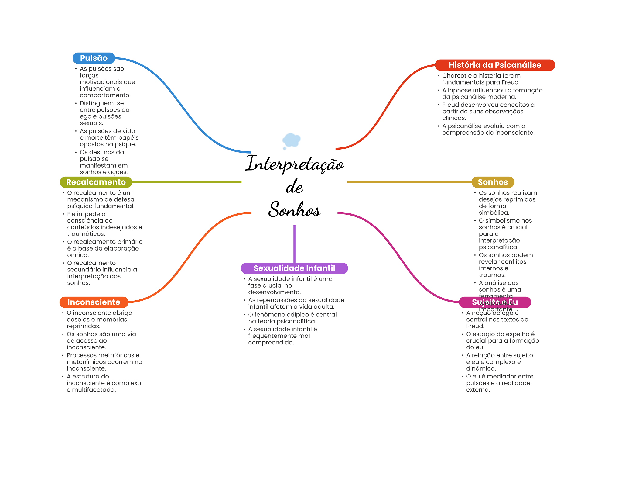 Pulsão História da Psicanálise As pulsões são forças Charcot e a histeria foram motivacionais que fundamentais para Freud. influenciam A hipnose influenciou a formação comportamento. da psicanálise moderna. Distinguem-se Freud desenvolveu conceitos a entre pulsões do partir de suas observações ego e pulsões clínicas. sexuais. A psicanálise evoluiu com a As pulsões de vida compreensão do inconsciente. e morte têm papéis opostos na psique. Os destinos da pulsão se manifestam em Interpretação sonhos e ações. Recalcamento de Sonhos recalcamento é um Os sonhos realizam mecanismo de defesa desejos reprimidos psíquica fundamental. Sonhos de forma Ele impede a simbólica. consciência de O simbolismo nos conteúdos indesejados e sonhos é crucial traumáticos. para a recalcamento primário interpretação é a base da elaboração psicanalítica. onírica. Os sonhos podem recalcamento revelar conflitos secundário influencia a Sexualidade Infantil internos e interpretação dos traumas. A sexualidade infantil é uma sonhos. fase crucial no A análise dos desenvolvimento. sonhos é uma ferramenta Inconsciente As repercussões da sexualidade Eu infantil afetam a vida adulta. inconsciente abriga fenômeno edípico é central A noção de ego é desejos e memórias na teoria central nos textos de reprimidas. Freud. A sexualidade infantil é Os sonhos são uma via frequentemente mal estágio do espelho é de acesso ao compreendida. crucial para a formação inconsciente. do eu. Processos metafóricos e A relação entre sujeito metonímicos ocorrem no e eu é complexa e inconsciente. dinâmica. A estrutura do eu é mediador entre inconsciente é complexa pulsões e a realidade e multifacetada. externa.