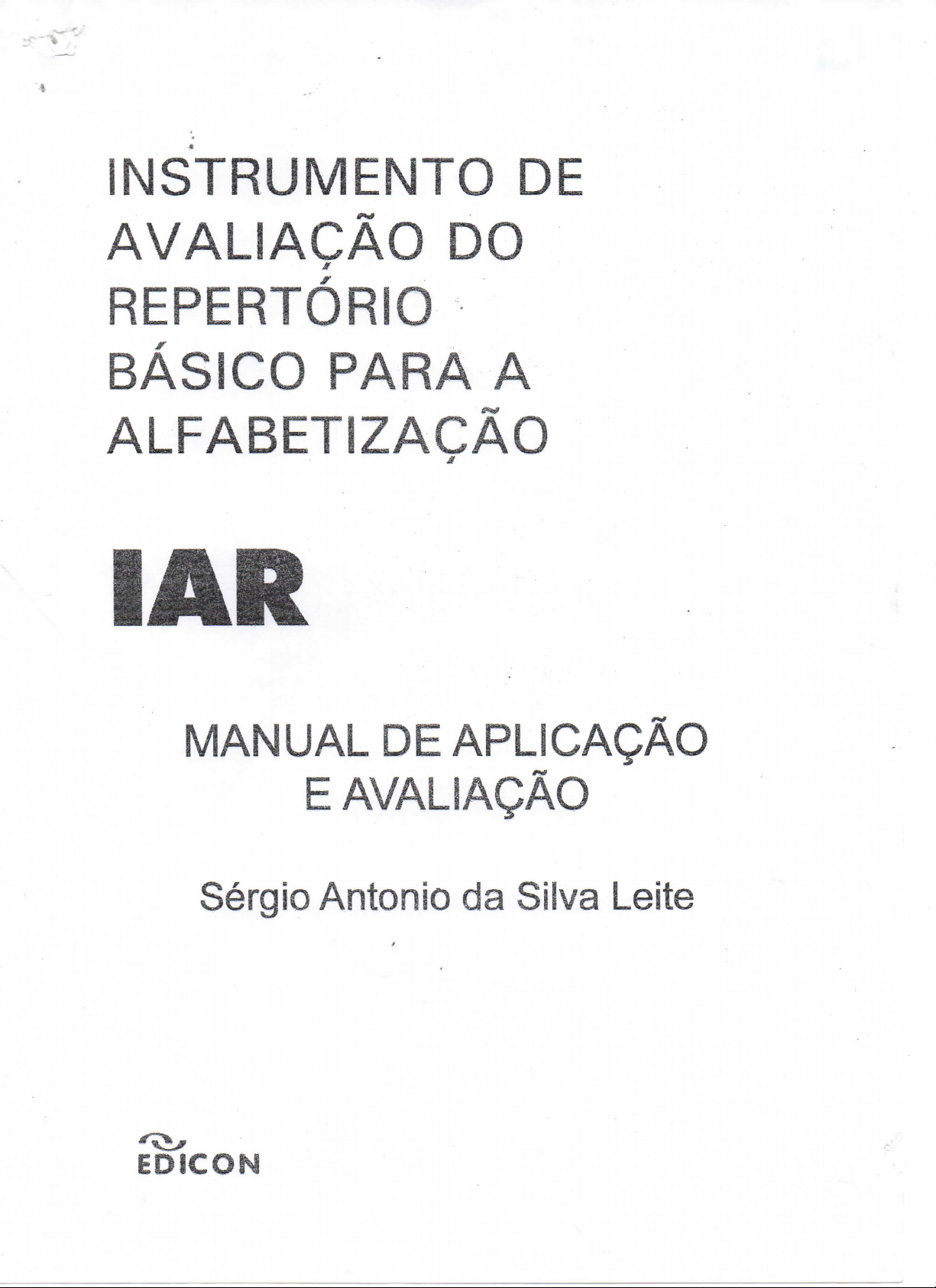 INSTRUMENTO DE AVALIAÇÃO DO REPERTORIO BÁSICO PARA A ALFABETIZAÇÃO IAR MANUAL DE APLICAÇÃO E AVALIAÇÃO Sérgio Antonio da Silva Leite EDICONCIP - Brasil. Câmara Brasileira do Livro, SP L555i v.1-2 Leite, Sérgio Antônio da Silva, 1946 Instrumento para a avaliação do repertório básico para a alfabetização IAR / Sérgio Antônio da Silva Leite. São Paulo EDICON, 1984. Fundamentos do IAR e sugestões de programas para desenvolver os pré-requisitos para a alfabetização, encontram-se em livro precedente do A.: Preparando a alfabetização. Bibliografia. Conteúdo: v.1. Manual de aplicação e avaliação. v.2. de respostas. 1. Alfabetização Preparação Avaliação 2. Alfabetização Preparação Manual do professor 3. Leitura (1° grau) I. Título. 17. CDD 372.410202] 18. 372.41420202 17. 372.41076 18. 372.4142076 84-0727 Índices para catálogo sistemático: 1. Alfabetização Preparação Manual do professor Ensino de 1° grau 372.410202 (17.) 372.41420202 (18.) 2. Avaliação : Alfabetização : Preparação : Ensino de 1° grau 372.41076 (17.) 372.4142076 (18.) 3. Avaliação : Prontidão para a alfabetização : Ensino de grau 372.41076 (17.) 372.4142076 (18.) 4. Avaliação Prontidão para a leitura : Ensino de 1° grau 372.41076 (17.) 372.4142076 (18.) Impresso no Brasil Printed in Brazil São Paulo 1984 Coordenação editorial Valentina Ljubtschenko Produção Antônio Jayro da Fonseca Motta Fagundes Capa e ilustrações Vanderlei Rotta Gomide Revisão Marilena Kerches O. Silva Leite Os direitos desta obra estão reservados por lei. Sua reprodução parcial ou total, por xerox ou qualquer outro meio, sem consentimento da editora, sujeita os infratores, de acordo com a Lei 6.895. de 17/12/1980, à reclusão de 1 a 4 anos e à aplicação de multas. Os pedidos desta obra podem ser feitos também por telefone ou carta. Damos descontos para pedidos acima de 10 exemplares. O IAR compõe-se de dois volumes Manual de aplicação e avaliação e Caderno de respostas. Para saber fundamentos do IAR e ter sugestões de programas para desenvolver os pré-requisitos para a alfabetização, leia, do mesmo autor: Preparando a alfabetização. São Paulo EDICON, 1984. . Para conhecer programa de alfabetização desenvolvido pelo autor, juntamente com educadores da rede de ensino público, leia: Alfabetização: um projeto bem sucedido. São Paulo EDICON, 1984 edição). EDICON Editora e Consultoria Ltda HERCUL AND DE 181 01308-020 PAULO /APRESENTAÇÃO O presente IAR foi planejado para ser um instrumento de auxílio para educadores que atuam com crianças da faixa pré-escolar (5-6 anos) e da primeira série do ensino de primeiro grau. Seus objetivos específicos são: a) avaliar O repertório comportamental das crianças no que diz respeito aos pré- requisitos fundamentais para a aprendizagem da leitura e escrita; b) possibilitar informações que indicarão se a criança está em condições ideais de iniciar a alfabetização propriamente dita; c) fornecer aos professores informações seguras sobre que habilidades ou conceitos deverão ser treinados para que a criança possa iniciar a aprendizagem da leitura e escrita. Em termos práticos, O IAR pode ser aplicado no início do ano escolar, tanto na primeira série (7 anos ou mais) como na pré-escola (6 anos), pois indicará no primeiro caso, quais as crianças que estão em condições de iniciarem diretamente a alfabetização e, para ambos casos, quais as crianças que deverão ser treinadas e em quais habilidades específicas, Algumas escolas têm utilizado O IAR após chamado período preparatório para formação de classes. O ideal é que seja aplicado antes e após referido período: antes para orientar professor sobre as principais habilidades que deverão ser treinadas e após, para verificar efeitos do treino e indicar as crianças que deverão ser encaminhadas para as classes de alfabetização ou para um período preparatório mais longo. Do mesmo modo, IAR poderá ser aplicado em alunos repetentes da primeira série ou séries diferentes, que possam necessitar de programas remediativos para suprir "déficits" de pré-requisitos. O leitor encontrará exemplos de projetos onde presente IAR foi aplicado, no livro de Sérgio Antônio da Silva Leite Preparando a alfabetização (EDICON, 1984). ESTRUTURA DO IAR O IAR é constituído por uma série de situações em que aluno deve emitir respostas escritas ou verbais, podendo ser aplicado coletiva ou individualmente. Para ambos os casos, O IAR foi confeccionado na forma de um caderno de manuseio individual pela criança, O qual poderá posteriormente arquivado. A sua estrutura abrange 13 áreas envolvendo habilidades e conceitos considerados pré-requisitos fundamentais para a alfabetização, a saber: I esquema corporal II lateralidade III posição IV direção V - espaço VI tamanho 3VII quantidade VIII forma IX discriminação visual X discriminação auditiva XI verbalização de palavras XII análise-síntese XIII coordenação motora fina Obviamente há outros pré-requisitos que poderiam ser incluídos, mas critério foi ater-se aos realmente fundamentais. Cada área, por sua vez, apresenta uma série de exercícios com um número correspondente no início do mesmo. Deve-se ressaltar que em cada área consideraram-se conteúdos finais teoricamente mais complexos, mas sem quais aluno certamente encontrará dificuldades na aprendizagem da leitura e escrita. PROCEDIMENTOS PARA APLICAÇÃO COLETIVA A eficiência do IAR dependerá essencialmente do professor seguir exatamente as instruções Instruções gerais O professor deverá aplicar O IAR em grupos de 10 a 15 alunos por vez, dispostos na sala de aula de tal forma que não consigam enxergar a folha do colega. Uma sugestão é deixar carteiras livres ao lado de cada criança. - O professor poderá contar com um auxiliar em sala de aula, caso julgue necessário. Cada criança deve estar munida de lápis preto