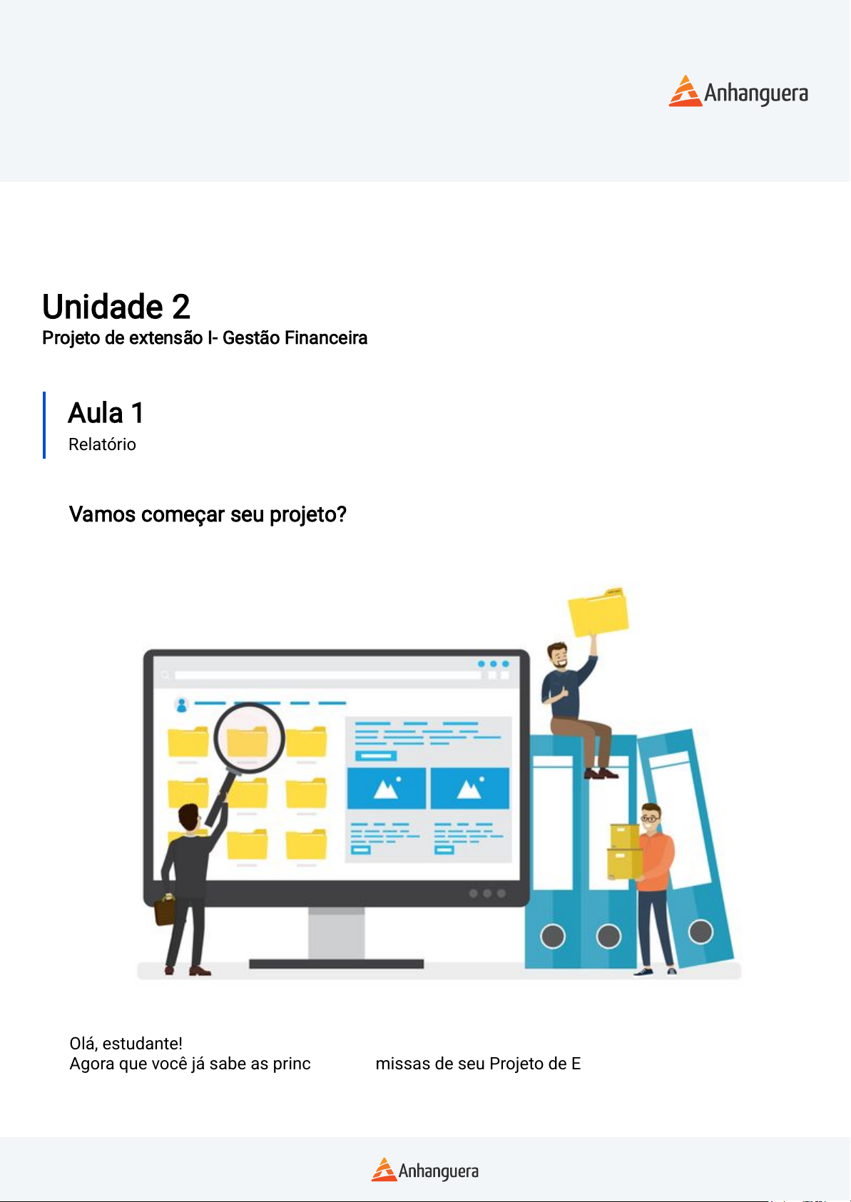 Unidade 2 Projeto de extensão I- Gestão Financeira Aula 1 Relatório Vamos começar seu projeto? Olá, estudante! Agora que você já sabe as principais premissas de seu Projeto de Extensão, disponibilizamos dois importantes arquivos: Disciplina PROJETO DE EXTENSÃO I - GESTÃO FINANCEIRA Carta de Apresentação: esse documento serve para você comprovar seu vínculo com a IES ao fazer contato com a instituição parceira onde pretende aplicar o seu projeto de extensão. Template PDCA: modelo de documento para auxiliar na condução da aplicação da metodologia PDCA, estão organizados em cada fase de aplicação. Esse template não precisa ser entregue, ele existe para ajudar você na condução da elaboração de seu projeto extensionista. Relatório Final de Atividades Extensionistas: modelo de documento para escrita final de seu relatório após a realização das atividades/ações planejadas junto ao local escolhido para a realização das atividades extensionistas. Esse é o documento comprobatório da realização da atividade in loco. Importante, esse documento deve ser entregue em seu Ambiente Virtual, pois será avaliado para posterior atribuição de sua nota. Disciplina PROJETO DE EXTENSÃO I - GESTÃO FINANCEIRA https://cm-kls-content.s3.amazonaws.com/DESEN_WEBAULA/EXTENSAO/template_carta_apresentacao_projetos_ampli.pdf https://cm-kls-content.s3.amazonaws.com/DESEN_WEBAULA/EXTENSAO/2023/_GESTAO%20FINANCEIRA/PROJETO%20DE%20EXTENS%C3%83O%20I%20-%20GEST%C3%83O%20FINANCEIRA/TEMPLATE%20PDCA_CST%20EM%20GEST%C3%83O%20FINANCEIRA_PROJETO%20DE%20EXTENS%C3%83O%20I%20-%20GEST%C3%83O%20FINANCEIRA.docx https://cm-kls-content.s3.amazonaws.com/DESEN_WEBAULA/EXTENSAO/2023/_GESTAO%20FINANCEIRA/PROJETO%20DE%20EXTENS%C3%83O%20I%20-%20GEST%C3%83O%20FINANCEIRA/RELAT%C3%93RIO%20FINAL_CST%20EM%20GEST%C3%83O%20FINANCEIRA_PROJETO%20DE%20EXTENS%C3%83O%20I%20-%20GEST%C3%83O%20FINANCEIRA.docx