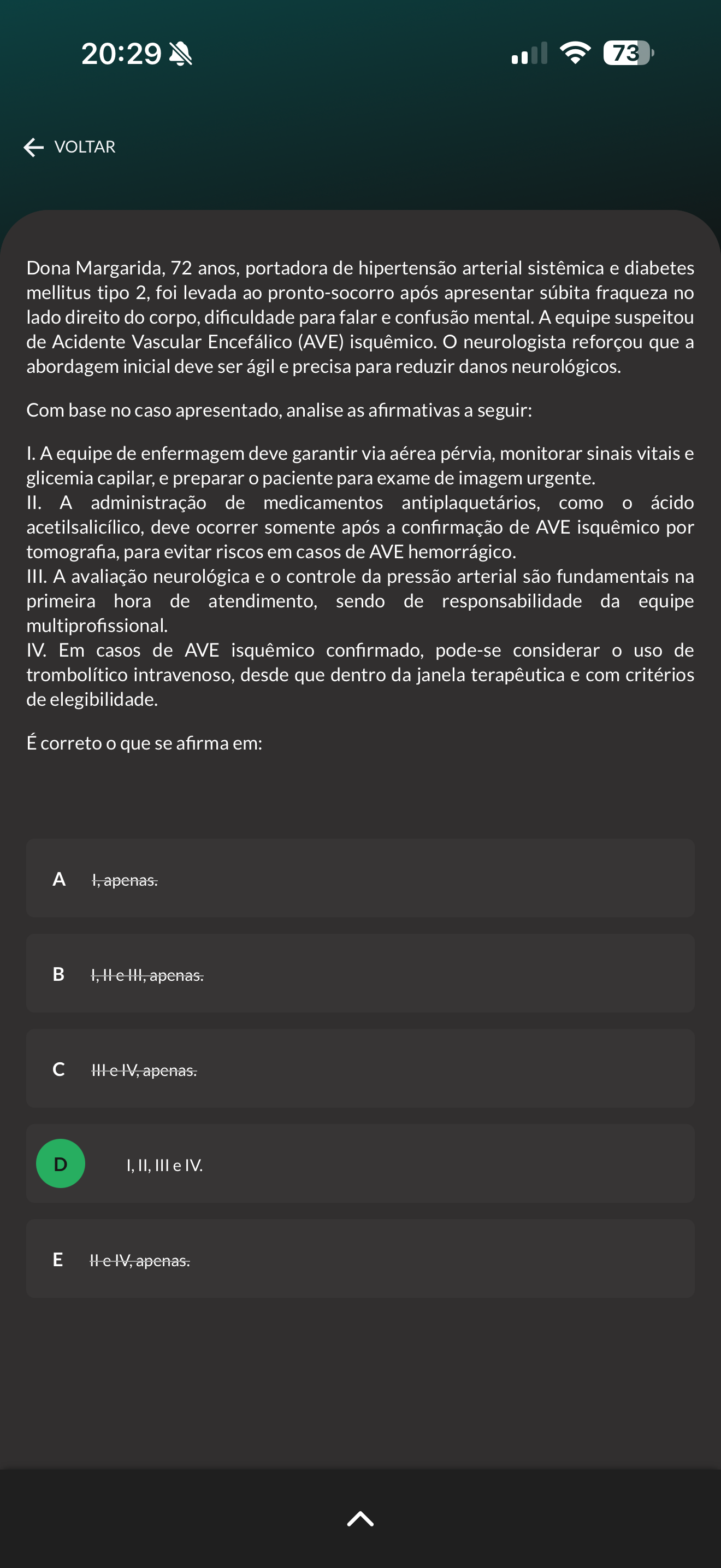 20:29 73 VOLTAR Dona Margarida, 72 anos, portadora de hipertensão arterial sistêmica e diabetes mellitus tipo 2, foi levada ao pronto-socorro após apresentar súbita fraqueza no lado direito do corpo, dificuldade para falar e confusão mental. A equipe suspeitou de Acidente Vascular Encefálico (AVE) isquêmico. neurologista reforçou que a abordagem inicial deve ser ágil e precisa para reduzir danos neurológicos. Com base no caso apresentado, analise as afirmativas a seguir: I. A equipe de enfermagem deve garantir via aérea pérvia, monitorar sinais vitais e glicemia capilar, e preparar o paciente para exame de imagem urgente. II. A administração de medicamentos antiplaquetários, como ácido acetilsalicílico, deve ocorrer somente após a confirmação de AVE isquêmico por tomografia, para evitar riscos em casos de AVE hemorrágico. III. A avaliação neurológica e controle da pressão arterial são fundamentais na primeira hora de atendimento, sendo de responsabilidade da equipe multiprofissional. IV. Em casos de AVE isquêmico confirmado, pode-se considerar uso de trombolítico intravenoso, desde que dentro da janela terapêutica e com critérios de elegibilidade. É correto que se afirma em: c D I, II, III e IV. E