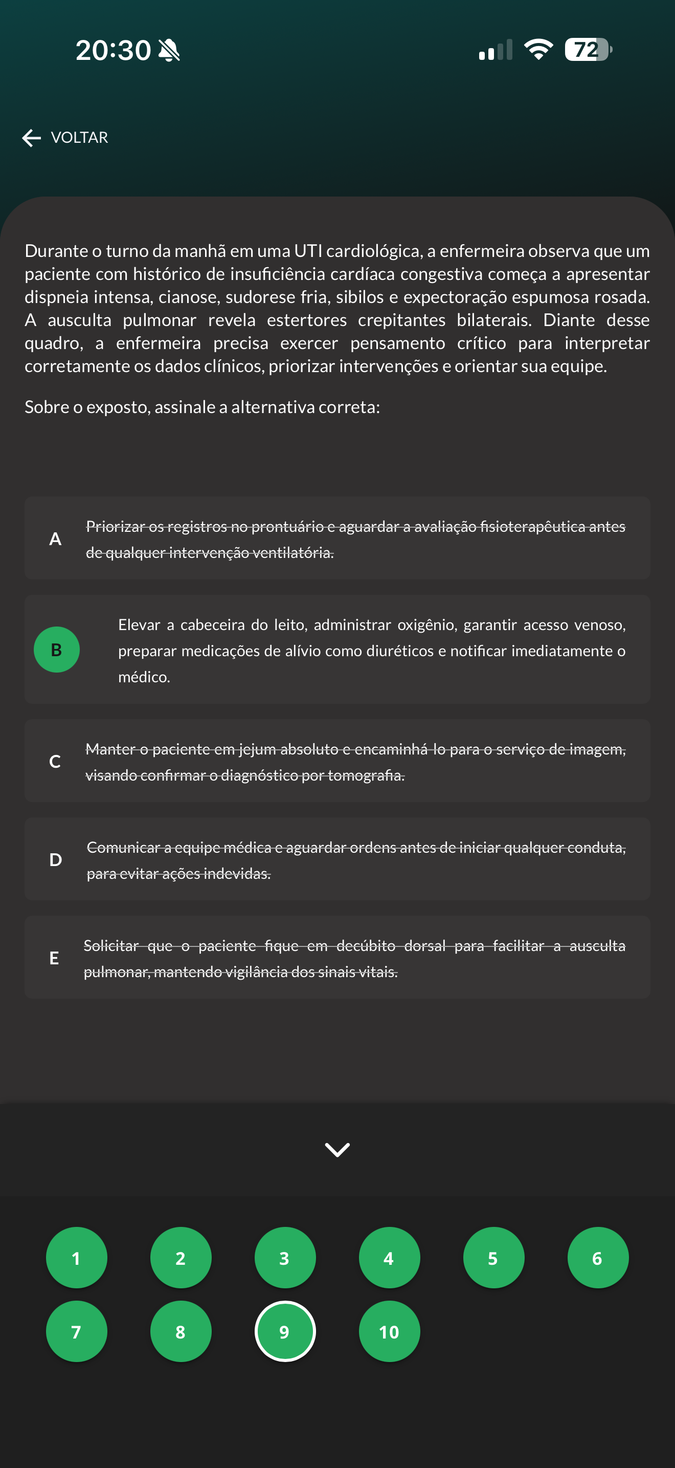 20:30 72 VOLTAR Durante o turno da manhã em uma UTI cardiológica, a enfermeira observa que um paciente com histórico de insuficiência cardíaca congestiva começa a apresentar dispneia intensa, cianose, sudorese fria, sibilos e expectoração espumosa rosada. A ausculta pulmonar revela estertores crepitantes bilaterais. Diante desse quadro, a enfermeira precisa exercer pensamento crítico para interpretar corretamente os dados clínicos, priorizar intervenções e orientar sua equipe. Sobre o exposto, assinale a alternativa correta: Priorizar registros no prontuário e aguardar a avaliação fisioterapêutica antes de qualquer intervenção ventilatória. Elevar a cabeceira do leito, administrar oxigênio, garantir acesso venoso, preparar medicações de alívio como diuréticos e notificar imediatamente o médico. Manter paciente em jejum absoluto e encaminhá lo para serviço de imagem, c visando confirmar diagnóstico por tomografia. Comunicar a equipe médica e aguardar ordens antes de iniciar qualquer conduta, D para evitar ações indevidas. Solicitar que paciente fique em decúbito dorsal para facilitar a ausculta E pulmonar, mantendo vigilância dos sinais vitais. 1 2 3 4 5 6 7 8 9 10