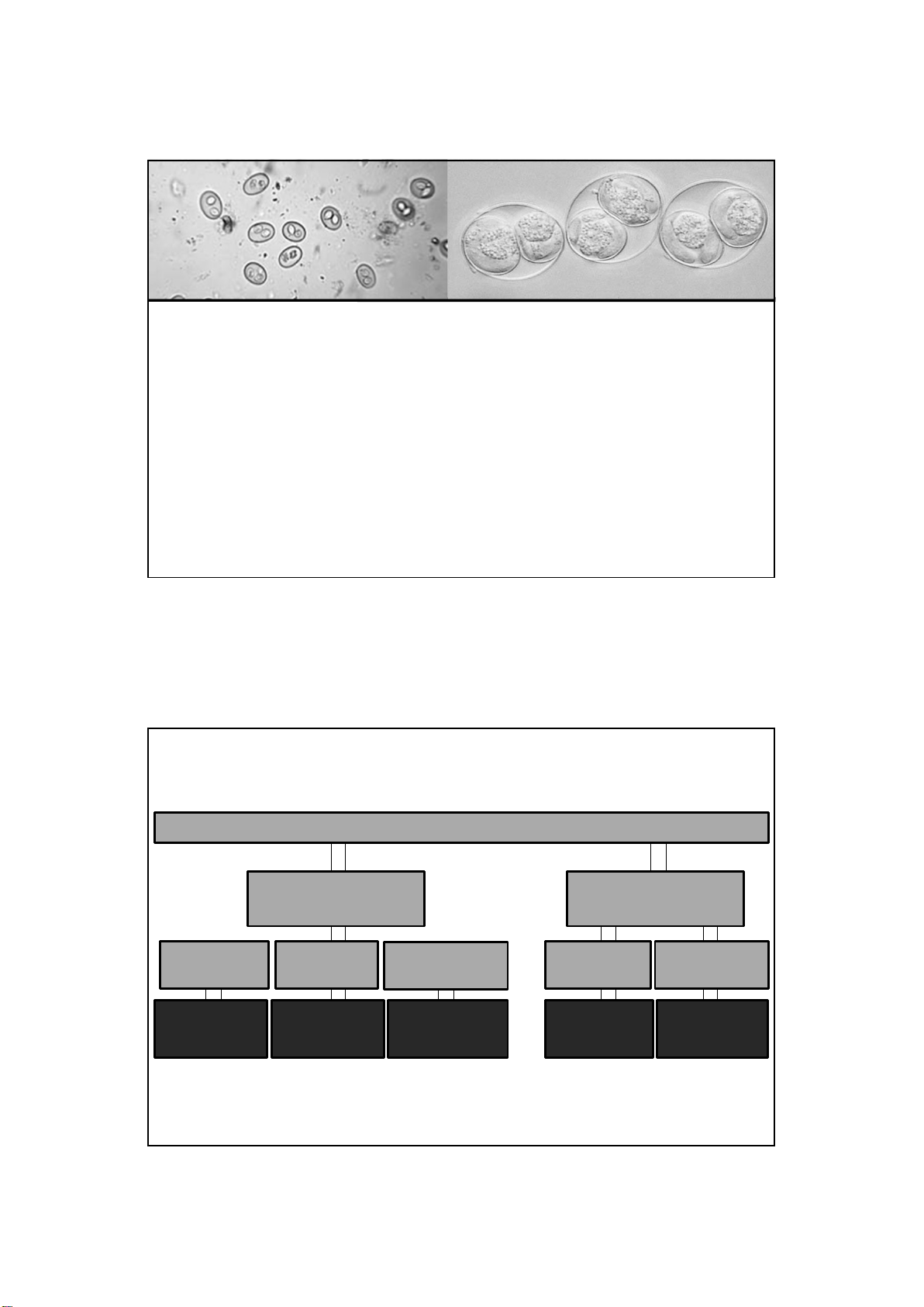 Filo APICOMPLEXAFilo APICOMPLEXA UNINASSAU – Centro Universitário Maurício de NassauUNINASSAU – Centro Universitário Maurício de Nassau EUCOCCIDIIDA Ordem PIROPLASMIDA Ordem BABESIIDAE Família Filo APICOMPLEXA THEILERIIDAE Família \ SARCOCYSTIDAE Família EIMERIDAE Família CRYPTOSPORIIDAE Família Toxoplasma gondii Neospora caninum Eimeira spp Cystoisospora spp. Cryptosporidium spp. Babesia spp. Theileria equi 1 2 TaxonomiaTaxonomia Filo APICOMPLEXA Ordem EUCOCCIDIIDA Família SARCOCYSTIDAE Neospora caninum Toxoplasma gondii • Parasitos intracelulares; • Reprodução assexuada nos HI; • Reprodução sexuada nos HD: micro e macrogameta; • Esporulação exógena. Características GeraisCaracterísticas Gerais 3 4 • Agente etiológico: Toxoplasma gondii • Agente causador da Toxoplasmose; • HD: felinos domésticos e silvestres; • HI: várias espécies Agente etiológicoAgente etiológico Hospedeiros IntermediáriosHospedeiros Intermediários • HI: humanos; mamíferos domésticos e silvestres; aves; répteis; • Localização: sistêmica (olhos, musculaturas, SNC, vísceras); • Formas evolutivas: taquizoítos (forma aguda) e bradizoítos (forma crônica). 5 6 Hospedeiros DefinitivosHospedeiros Definitivos • HD: felinos domésticos e silvestres; • Localização: intestino delgado e outros órgãos; • Formas evolutivas: taquizoítos e bradizoítos; micro e macrogametas; oocistos não-esporulados. BiologiaBiologia • Esporulação: 1-5 dias; • PPP: 1- 10 dias (cistos) ou 18-44 dias (oocistos); • 100.000 oocistos/g de fezes na primoinfecção; • Imunidade felina: anos. 7 8 BiologiaBiologia Vias de transmissãoVias de transmissão • Oral: água e alimentos vegetais contaminados (oocistos esporulados); • Oral: alimentos de origem animal crus ou mal-cozidos (taquizoítos ou bradizoítos); • Congênita ou transplacentária: taquizoítos; • Iatrogênica: transplantes, transfusões (taquizoítos ou bradizoítos). 9 10 ImportânciaImportância • Ação mecânica do parasito; • Infecção primária (primo-infecção) x infecção latente; • Imunossupressão; • Zoonose: saúde pública. ImportânciaImportância • Toxoplasmose animal Caprinos, ovinos e suínos: abortos no primeiro terço da gestação, natimortos ou crias fracas; Gatos: pneumonia, problemas oftálmicos e encefalites em filhotes ou em adultos imunossuprimidos; Equinos: mieloencefalite equina por protozoário (MEP) – Sarcocystis neurona. 11 12 ImportânciaImportância • Toxoplasmose humana Doença benigna com sintomas inespecíficos e de curta duração; Aborto ou má-formação fetal na infecção aguda; Infecção crônica: doença ocular e doença cerebral; Toxoplasmose x HIV. ImportânciaImportância 13 14 ImportânciaImportância • Agente etiológico: Neospora caninum • Agente causador da Neospose; • HD: canídeos domésticos e silvestres; • HI: várias espécies. Agente etiológicoAgente etiológico 15 16 Hospedeiros IntermediáriosHospedeiros Intermediários • HI: ruminantes domésticos e silvestres, equinos; • Localização: sistêmica (olhos, musculaturas, SNC, vísceras); • Formas evolutivas: taquizoítos (forma aguda) e bradizoítos (forma crônica). Hospedeiros DefinitivosHospedeiros Definitivos • HD: canídeos domésticos e silvestres (coiote); • Localização: intestino delgado e outros órgãos; • Formas evolutivas: taquizoítos e bradizoítos; micro e macrogametas; oocistos não-esporulados. 17 18 BiologiaBiologia • Esporulação: 1-4 dias; • Não se sabe a qtde de oocistos eliminados; • Não há dados sobre a imunidade canina. Vias de transmissãoVias de transmissão • Herbívoros (HI): água e alimentos vegetais contaminados (oocistos esporulados); • Canídeos (HD): alimentos de origem animal crus (placenta) ou mal-cozidos (taquizoítos ou bradizoítos); • Congênita ou transplacentária: taquizoítos – principal forma de transmissão nos ruminantes. 19 20 ImportânciaImportância • Ação mecânica do parasito; • Infecção primária (primo-infecção) x infecção latente; • Imunossupressão. ImportânciaImportância • Neosporose animal Ruminantes Aborto (5-6 meses de gestação), natimortos, crias fracas; Fêmeas podem nascer assintomáticas; Caninos Pneumonia, miosite, hepatite, miocardite em filhotes ou em adultos imunossuprimidos. 21 22 ImportânciaImportância ImportânciaImportância 23 24 TaxonomiaTaxonomia Filo APICOMPLEXA Ordem EUCOCCIDIIDA Família EIMERIDAE Cystoisospora spp. Eimeira spp. Classe SPOROZOA • Parasitos intracelulares; • Reprodução assexuada (esquizogonia) e reprodução sexuada (gametogonia): micro e macrogameta; • Esporulação exógena; • Parasitos hospedeiros-específicos (estenoxenos). Características GeraisCaracterísticas Gerais 25 26 Agentes etiológicos e hospedeirosAgentes etiológicos e hospedeiros Agentes etiológicos e hospedeirosAgentes etiológicos e hospedeiros 27 28 Agentes etiológicos e hospedeirosAgentes etiológicos e hospedeiros BiologiaBiologia PPP: 6-10 dias 29 30 Agente etiológicoAgente etiológico Características dos oocistos esporulados Vias de transmissãoVias de transmissão • Oral: água e alimentos vegetais contaminados (oocistos esporulados) 31 32 ImportânciaImportância • Ação mecânica do parasito; • Diarreia sanguinolenta ou não; • Baixa na produção, baixa conversão alimentar; • Coccidiose/Eimeriose: aves, suínos, caprinos, ovinos e coelhos. ImportânciaImportância 33 34 ImportânciaImportância • Eimeriose cecal em aves: parasitos chegam até a submucosa. • Medidas de controle: - Adequado manejo da cama das aves; - Água limpa; - Rotação de drogas anti-coccídeos. TaxonomiaTaxonomia Filo APICOMPLEXA Ordem EUCOCCIDIIDA Família CRYPTOSPORIIDAE Cryptosporidium spp. Classe SPOROZOA 35 36 • Parasitos intracelulares, porém extra-citoplasmático, formando o vacúolo parasitóforo; • Não ocorre destruição celular, mas