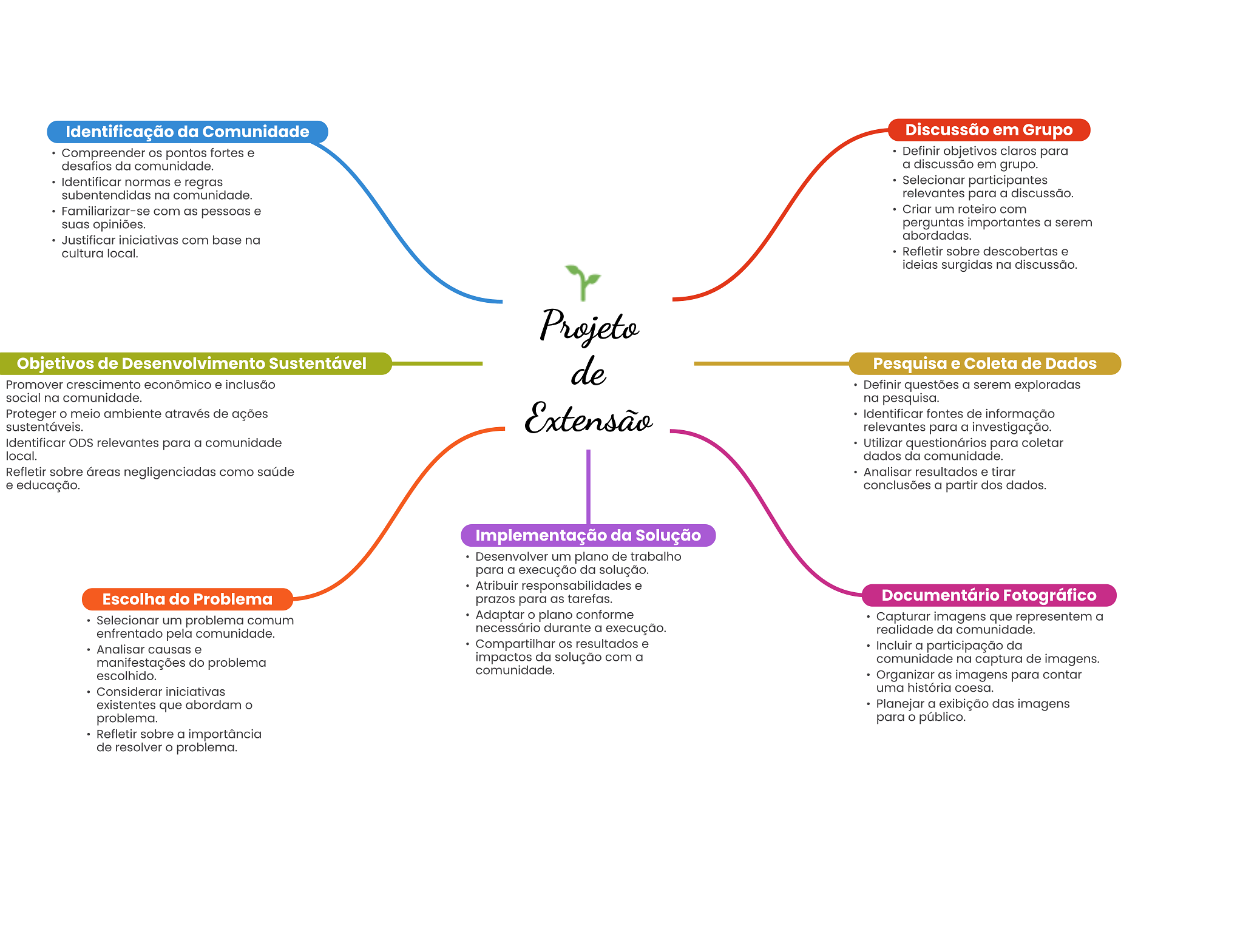 Identificação da Comunidade Discussão em Grupo Compreender pontos fortes e Definir objetivos claros para desafios da comunidade. a discussão em grupo. Identificar normas e regras Selecionar participantes subentendidas na comunidade. relevantes para a discussão. Familiarizar-se com as pessoas e Criar um roteiro com suas opiniões. perguntas importantes a serem Justificar iniciativas com base na abordadas. cultura local. Refletir sobre descobertas e ideias surgidas na discussão. Projeto Objetivos de Desenvolvimento Sustentável de Pesquisa e Coleta de Dados Promover crescimento econômico e inclusão Definir questões a serem exploradas social na comunidade. na pesquisa. Proteger meio ambiente através de ações Extensão Identificar fontes de informação sustentáveis. relevantes para a investigação. Identificar ODS relevantes para a comunidade Utilizar questionários para coletar local. dados da comunidade. Refletir sobre áreas negligenciadas como saúde Analisar resultados e tirar e educação. conclusões a partir dos dados. Implementação da Solução Desenvolver um plano de trabalho para a execução da solução. Atribuir responsabilidades e Escolha do Problema prazos para as tarefas. Documentário Fotográfico Selecionar um problema comum Adaptar plano conforme Capturar imagens que representem a enfrentado pela comunidade. necessário durante a execução. realidade da comunidade. Analisar causas e Compartilhar OS resultados e Incluir a participação da manifestações do problema impactos da solução com a comunidade na captura de imagens. escolhido. comunidade. Organizar as imagens para contar Considerar iniciativas uma história coesa. existentes que abordam Planejar a exibição das imagens problema. para O público. Refletir sobre a importância de resolver problema.