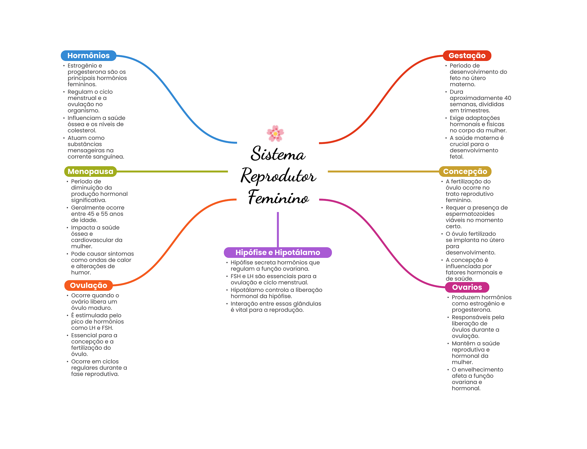 Hormônios Gestação Estrogênio e Período de progesterona são desenvolvimento do principais hormônios feto no útero femininos. materno. Regulam ciclo Dura menstrual e a aproximadamente 40 ovulação no semanas, divididas organismo. em trimestres. Influenciam a saúde Exige adaptações óssea e OS níveis de hormonais e físicas colesterol. no corpo da mulher. Atuam como A saúde materna é substâncias crucial para mensageiras na Sistema desenvolvimento corrente sanguínea. fetal. Menopausa Reprodutor Concepção Período de A fertilização do diminuição da óvulo ocorre no produção hormonal significativa. Feminino trato reprodutivo feminino. Geralmente ocorre Requer a presença de entre 45 e 55 anos espermatozoides de idade. viáveis no momento Impacta a saúde certo. óssea e óvulo fertilizado cardiovascular da se implanta no útero mulher. para Pode causar sintomas Hipófise e Hipotálamo desenvolvimento. como ondas de calor Hipófise secreta hormônios que A concepção é e alterações de regulam a função ovariana. influenciada por humor. fatores hormonais e FSH e LH são essenciais para a de saúde. Ovulação ovulação e ciclo menstrual. Hipotálamo controla a liberação Ovarios Ocorre quando O hormonal da hipófise. Produzem hormônios ovário libera um Interação entre essas glândulas como estrogênio e óvulo maduro. é vital para a reprodução. progesterona. É estimulada pelo Responsáveis pela pico de hormônios liberação de como LH e FSH. óvulos durante a Essencial para a ovulação. concepção e a Mantêm a saúde fertilização do reprodutiva e óvulo. hormonal da Ocorre em ciclos mulher. regulares durante a O envelhecimento fase reprodutiva. afeta a função ovariana e hormonal.