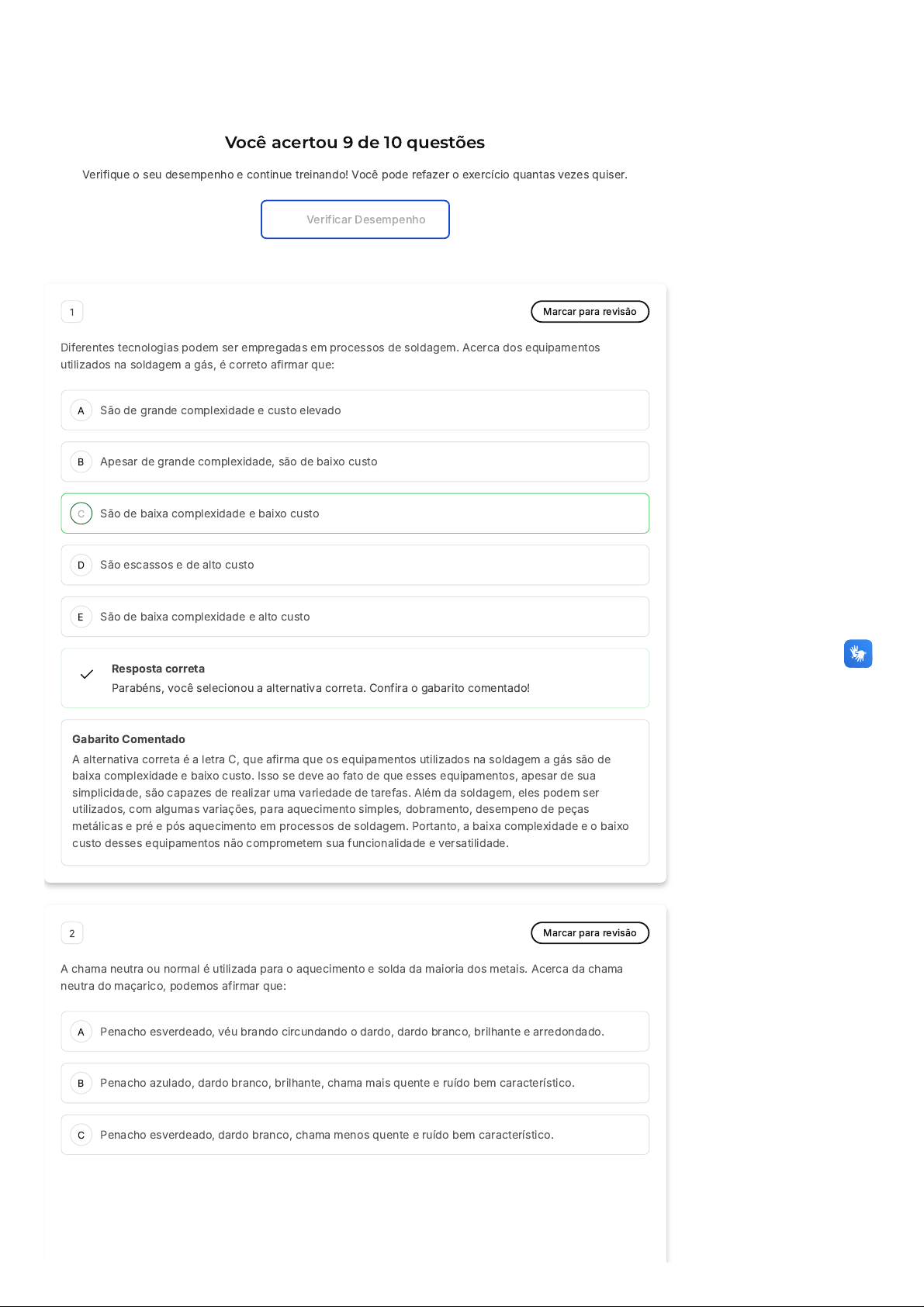 Você acertou 9 de 10 questões Verifique o seu desempenho e continue treinando! Você pode refazer o exercício quantas vezes quiser. Verificar Desempenho A B C D E A B C 1 Marcar para revisão Diferentes tecnologias podem ser empregadas em processos de soldagem. Acerca dos equipamentos utilizados na soldagem a gás, é correto afirmar que: São de grande complexidade e custo elevado Apesar de grande complexidade, são de baixo custo São de baixa complexidade e baixo custo São escassos e de alto custo São de baixa complexidade e alto custo Resposta correta Parabéns, você selecionou a alternativa correta. Confira o gabarito comentado! Gabarito Comentado A alternativa correta é a letra C, que afirma que os equipamentos utilizados na soldagem a gás são de baixa complexidade e baixo custo. Isso se deve ao fato de que esses equipamentos, apesar de sua simplicidade, são capazes de realizar uma variedade de tarefas. Além da soldagem, eles podem ser utilizados, com algumas variações, para aquecimento simples, dobramento, desempeno de peças metálicas e pré e pós aquecimento em processos de soldagem. Portanto, a baixa complexidade e o baixo custo desses equipamentos não comprometem sua funcionalidade e versatilidade. 2 Marcar para revisão A chama neutra ou normal é utilizada para o aquecimento e solda da maioria dos metais. Acerca da chama neutra do maçarico, podemos afirmar que: Penacho esverdeado, véu brando circundando o dardo, dardo branco, brilhante e arredondado. Penacho azulado, dardo branco, brilhante, chama mais quente e ruído bem característico. Penacho esverdeado, dardo branco, chama menos quente e ruído bem característico. D E A B C D E A B Penacho azulado, véu branco e dardo branco. Penacho longo, dardo branco, brilhante e arredondado. Resposta correta Parabéns, você selecionou a alternativa correta. Confira o gabarito comentado! Gabarito Comentado A chama neutra, também conhecida como chama normal, é caracterizada por um penacho longo, um dardo branco, brilhante e arredondado. Essas características são essenciais para o aquecimento e solda da maioria dos metais, tornando a chama neutra a mais utilizada para esses fins. Portanto, a alternativa correta é a letra E, que descreve corretamente as características da chama neutra. 3 Marcar para revisão Na fabricação industrial, muitos são os processos de fabricação que podem ser necessários para se confeccionar uma peça ou componente. Assinale a alternativa que complementa corretamente a afirmação abaixo. O processo de ____________ é industrialmente o mais importante processo de fabricação de peças metálicas. Usinagem Estampagem Trefilação Forjamento Soldagem Resposta correta Parabéns, você selecionou a alternativa correta. Confira o gabarito comentado! Gabarito Comentado A alternativa correta é a soldagem, que é considerada o mais importante processo industrial de fabricação de peças metálicas. Além da fabricação de peças, os processos de soldagem e processos afins são amplamente utilizados na recuperação de peças desgastadas, na aplicação de revestimentos de características especiais sobre superfícies metálicas e para corte. A popularidade e o sucesso da soldagem como processo de fabricação estão associados a diversos fatores, sendo um deles a sua relativa simplicidade operacional. 4 Marcar para revisão A respeito do processo de oxicorte, assinale a alternativa que complementa corretamente o trecho abaixo. O processo de oxicorte é definido como um processo no qual o corte do metal é obtido devido à reação ___________________ com o _________________ em ______________. Do oxigênio puro / metal / temperatura elevada Do nitrogênio puro / metal / baixa temperatura C D E A B C D E A B Do argônio puro / oxigênio / temperatura elevada Do oxigênio puro / metal / baixa temperatura Do argônio puro / metal / temperatura elevada Resposta correta Parabéns, você selecionou a alternativa correta. Confira o gabarito comentado! Gabarito Comentado O oxicorte, também conhecido como corte a gás, é um processo que envolve a utilização de oxigênio puro para cortar metais. A reação ocorre entre o oxigênio e o metal, e é facilitada por uma temperatura elevada. Portanto, a alternativa correta é a "A", que afirma que o corte do metal é obtido devido à reação do oxigênio puro com o metal em temperatura elevada. 5 Marcar para revisão Independentemente do tipo de chama, esta deve possuir uma elevada temperatura máxima. O responsável pelo tipo de chama é: A temperatura A vazão do gás A pressão do gás A composição química do gás A temperatura e vazão Resposta correta Parabéns, você selecionou a alternativa correta. Confira o gabarito comentado! Gabarito Comentado A composição química do gás é o fator determinante para o tipo de chama produzida. Isso ocorre porque diferentes gases possuem diferentes propriedades de combustão, que resultam em chamas de diferentes características. Portanto, a alternativa correta é a "D", que afirma que a composição química do gás é responsável pelo tipo de chama. 6 Marcar para revisão O processo de soldagem ou corte é influenciado diretamente pelo material que se deseja trabalhar. Assinale a alternativa que complementa corretamente o trecho abaixo. Em materiais que apresentam camada de óxido resistente, o corte é feito com auxílio de___________________________ e pós metálicos. CO2 Fluxo C D E A B C D E Nitrogênio Argônio Acetileno Resposta correta Parabéns, você selecionou a alternativa correta. Confira o gabarito comentado! Gabarito Comentado O corte de materiais que apresentam uma camada de óxido resistente é realizado com o auxílio de fluxo e pós metálicos. O fluxo é utilizado para proteger a área de corte do contato com o oxigênio do ar, evitando a formação de óxidos adicionais que poderiam prejudicar o processo de corte. Os pós metálicos, por sua vez, ajudam a aumentar a eficiê