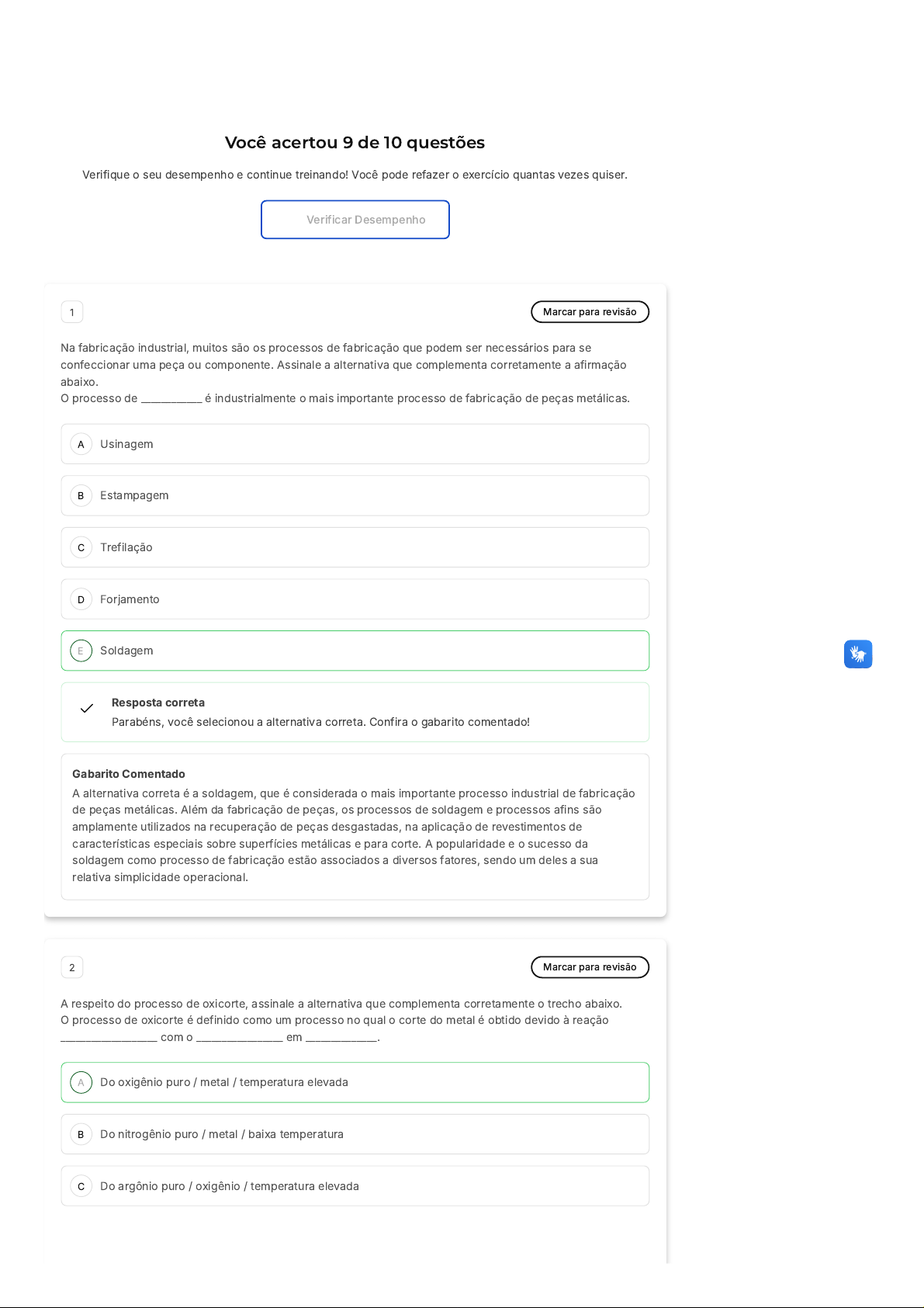 Você acertou 9 de 10 questões Verifique o seu desempenho e continue treinando! Você pode refazer o exercício quantas vezes quiser. Verificar Desempenho A B C D E A B C 1 Marcar para revisão Na fabricação industrial, muitos são os processos de fabricação que podem ser necessários para se confeccionar uma peça ou componente. Assinale a alternativa que complementa corretamente a afirmação abaixo. O processo de ____________ é industrialmente o mais importante processo de fabricação de peças metálicas. Usinagem Estampagem Trefilação Forjamento Soldagem Resposta correta Parabéns, você selecionou a alternativa correta. Confira o gabarito comentado! Gabarito Comentado A alternativa correta é a soldagem, que é considerada o mais importante processo industrial de fabricação de peças metálicas. Além da fabricação de peças, os processos de soldagem e processos afins são amplamente utilizados na recuperação de peças desgastadas, na aplicação de revestimentos de características especiais sobre superfícies metálicas e para corte. A popularidade e o sucesso da soldagem como processo de fabricação estão associados a diversos fatores, sendo um deles a sua relativa simplicidade operacional. 2 Marcar para revisão A respeito do processo de oxicorte, assinale a alternativa que complementa corretamente o trecho abaixo. O processo de oxicorte é definido como um processo no qual o corte do metal é obtido devido à reação ___________________ com o _________________ em ______________. Do oxigênio puro / metal / temperatura elevada Do nitrogênio puro / metal / baixa temperatura Do argônio puro / oxigênio / temperatura elevada D E A B C D E A B C Do oxigênio puro / metal / baixa temperatura Do argônio puro / metal / temperatura elevada Resposta correta Parabéns, você selecionou a alternativa correta. Confira o gabarito comentado! Gabarito Comentado O oxicorte, também conhecido como corte a gás, é um processo que envolve a utilização de oxigênio puro para cortar metais. A reação ocorre entre o oxigênio e o metal, e é facilitada por uma temperatura elevada. Portanto, a alternativa correta é a "A", que afirma que o corte do metal é obtido devido à reação do oxigênio puro com o metal em temperatura elevada. 3 Marcar para revisão Um dos principais processos de fabricação é a soldagem, que pode ser realizada de diferentes formas e com diferentes tecnologias. Assinale a alternativa que complementa corretamente a afirmação abaixo. Uma característica importante acerca da soldagem a gás é o _______________ controle que se pode exercer sobre a entrada de __________________ e ________________. Excelente / calor / gás Péssimo / calor / temperatura Excelente / gás / temperatura Excelente / calor / temperatura Excelente / calor / oxigênio Resposta incorreta Opa! A alternativa correta é a letra D. Confira o gabarito comentado! Gabarito Comentado A alternativa correta é a D. A soldagem a gás é um processo que permite um excelente controle sobre a entrada de calor e a temperatura. Isso ocorre porque a fonte de calor e a entrada do metal de adição podem ser controladas de forma independente. Assim, é possível ajustar a quantidade de calor e a temperatura das peças que estão sendo soldadas, garantindo a qualidade do processo de soldagem. 4 Marcar para revisão Diferentes tecnologias podem ser empregadas em processos de soldagem. Acerca dos equipamentos utilizados na soldagem a gás, é correto afirmar que: São de grande complexidade e custo elevado Apesar de grande complexidade, são de baixo custo São de baixa complexidade e baixo custo Questão 3 de 10 Corretas (9) Incorretas (1) Em branco (0) 1 2 3 4 5 6 7 8 9 10 Lista de exercícios Fundamentos e Processo De Soldagem e Corte Com Gás Sair D E A B C D E A B São escassos e de alto custo São de baixa complexidade e alto custo Resposta correta Parabéns, você selecionou a alternativa correta. Confira o gabarito comentado! Gabarito Comentado A alternativa correta é a letra C, que afirma que os equipamentos utilizados na soldagem a gás são de baixa complexidade e baixo custo. Isso se deve ao fato de que esses equipamentos, apesar de sua simplicidade, são capazes de realizar uma variedade de tarefas. Além da soldagem, eles podem ser utilizados, com algumas variações, para aquecimento simples, dobramento, desempeno de peças metálicas e pré e pós aquecimento em processos de soldagem. Portanto, a baixa complexidade e o baixo custo desses equipamentos não comprometem sua funcionalidade e versatilidade. 5 Marcar para revisão A soldagem a gás com coalescência dos metais é uma característica dos processos de solda por eletrodo revestido. Acerca da soldagem a gás, a coalescência dos metais é obtida pelo: Fusão das peças a partir de um arco elétrico Fusão das peças a partir de uma escória líquida Fusão dos metais a partir de um feixe de elétrons Fusão das peças pelo aquecimento destas até a fusão com uma chama de gás combustível e oxigênio Fusão das peças a partir de um feixe de luz Resposta correta Parabéns, você selecionou a alternativa correta. Confira o gabarito comentado! Gabarito Comentado No processo de soldagem a gás, também conhecido como soldagem oxi-combustível, a coalescência dos metais é alcançada através do aquecimento das peças até a fusão. Este aquecimento é realizado com uma chama produzida pela combinação de um gás combustível e oxigênio. Portanto, a alternativa D é a correta, pois descreve corretamente o processo de soldagem a gás. 6 Marcar para revisão Independentemente do tipo de chama, esta deve possuir uma elevada temperatura máxima. O responsável pelo tipo de chama é: A temperatura A vazão do gás C D E A B C D E A pressão do gás A composição química do gás A temperatura e vazão Resposta correta Parabéns, você selecionou a alternativa correta. Confira o gabarito comentado! Gabarito Comentado A composiç