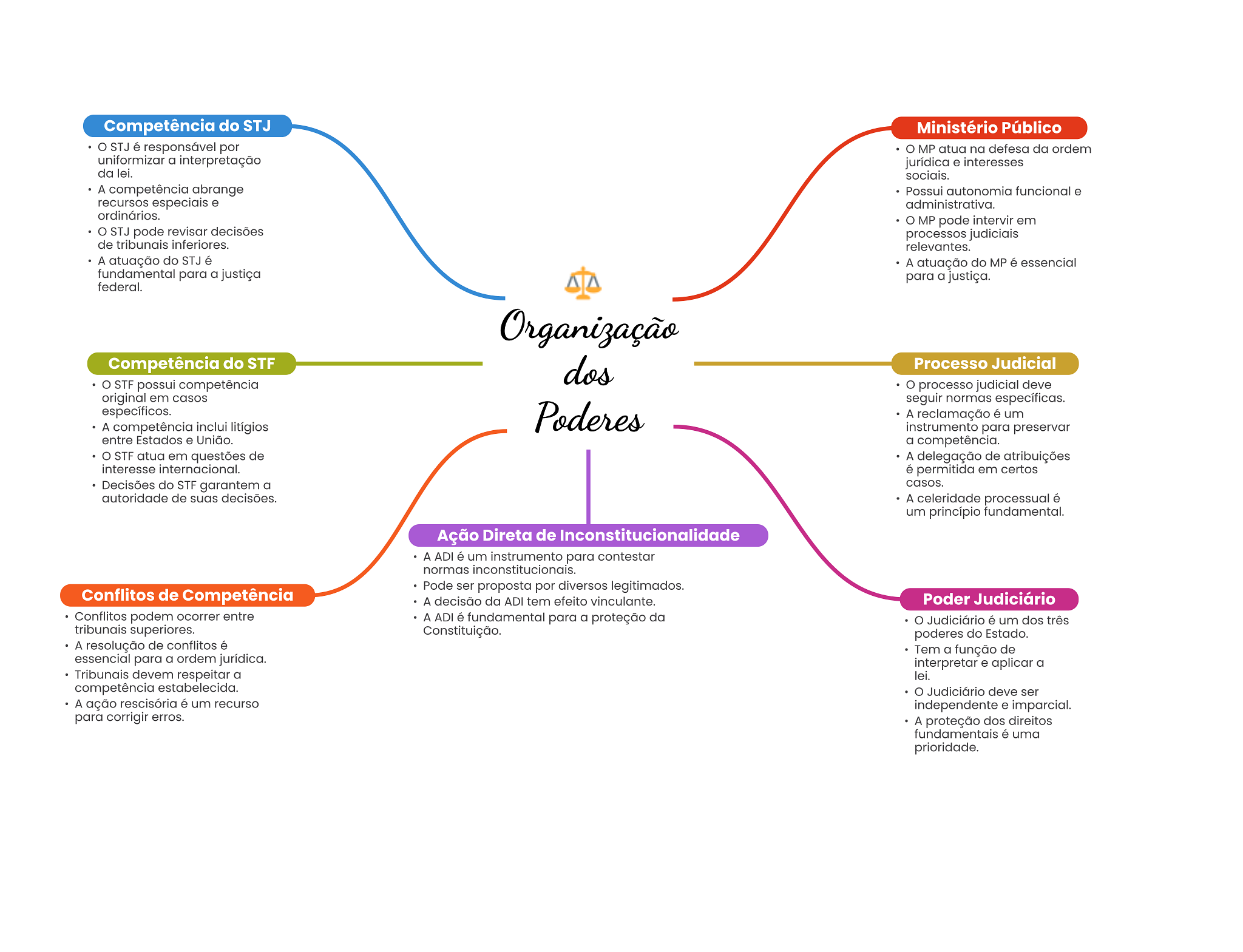 Competência do STJ Ministério Público STJ é responsável por MP atua na defesa da ordem uniformizar a interpretação jurídica e interesses da lei. sociais. A competência abrange Possui autonomia funcional e recursos especiais e administrativa. ordinários. O MP pode intervir em STJ pode revisar decisões processos judiciais de tribunais inferiores. relevantes. A atuação do STJ é A atuação do MP é essencial fundamental para a justiça para a justiça. federal. Organização Competência do STF dos Processo Judicial STF possui competência processo judicial deve original em casos seguir normas específicas. específicos. A competência inclui litígios Poderes A reclamação é um instrumento para preservar entre Estados e União. a competência. STF atua em questões de A delegação de atribuições interesse internacional. é permitida em certos Decisões do STF garantem a casos. autoridade de suas decisões. A celeridade processual é um princípio fundamental. Ação Direta de Inconstitucionalidade A ADI é um instrumento para contestar normas inconstitucionais. Pode ser proposta por diversos legitimados. Conflitos de Competência A decisão da ADI tem efeito vinculante. Poder Judiciário Conflitos podem ocorrer entre A ADI é fundamental para a proteção da Judiciário é um dos três tribunais superiores. Constituição. poderes do Estado. A resolução de conflitos é Tem a função de essencial para a ordem jurídica. interpretar e aplicar a Tribunais devem respeitar a lei. competência estabelecida. O Judiciário deve ser A ação rescisória é um recurso independente e imparcial. para corrigir erros. A proteção dos direitos fundamentais é uma prioridade.